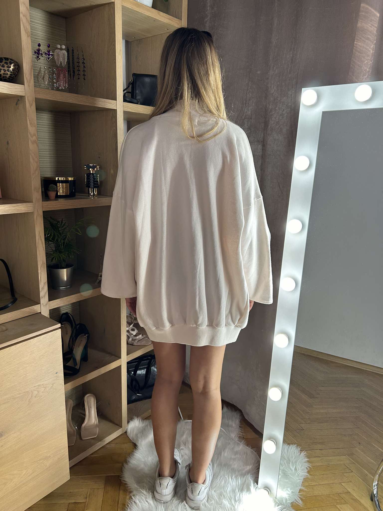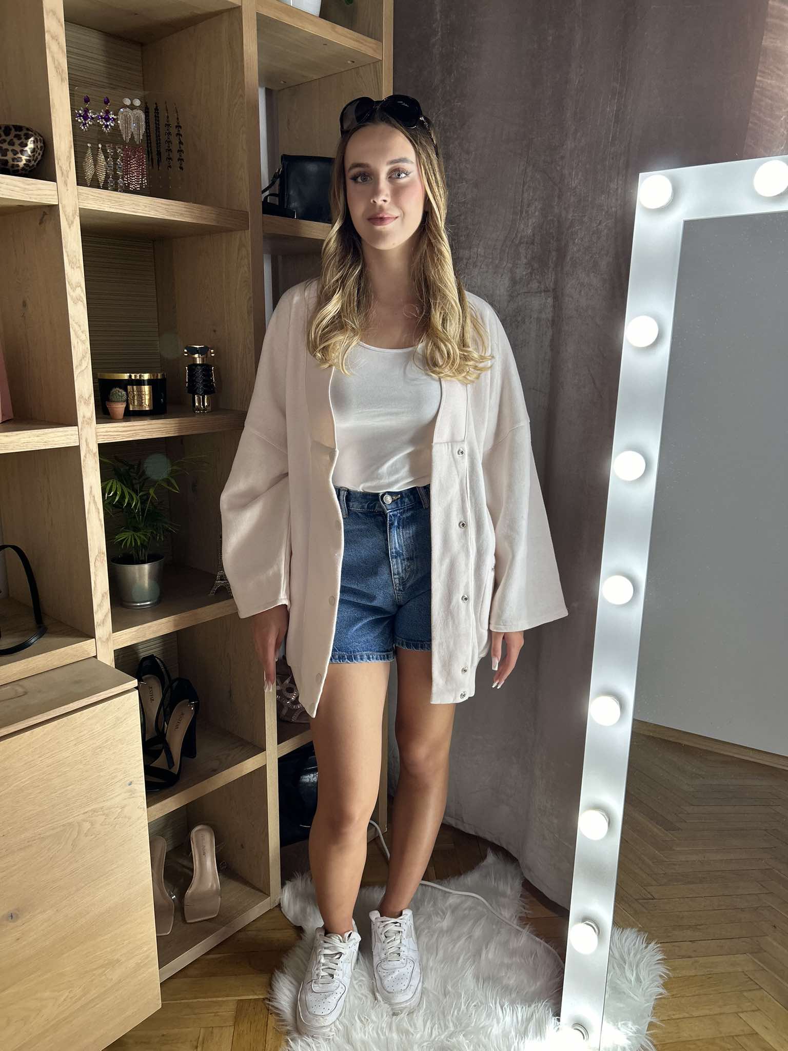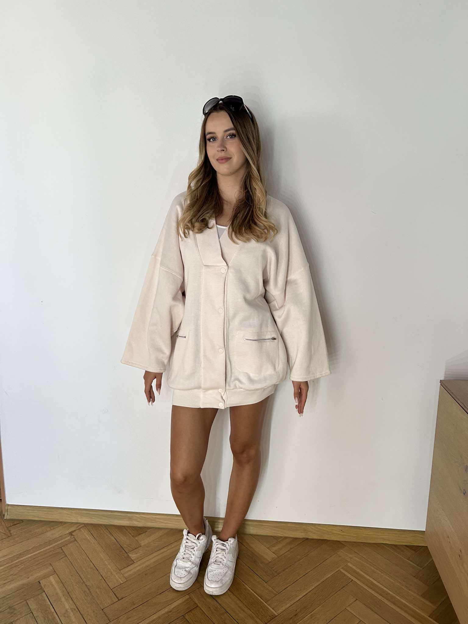 Bluza-kurtka z szerokimi rękawami rozmiar M. Kolor jasny pudrowy różowy. Szerokie rękawy bez ściągaczy. Zapinana na zatrzaski. Gruby, miękki dresowy materiał. Wymiary długość 87 cm, szerokość 67 cm, rękaw 40 cm. Stan idealny (możliwe mikro przybrudzenia)