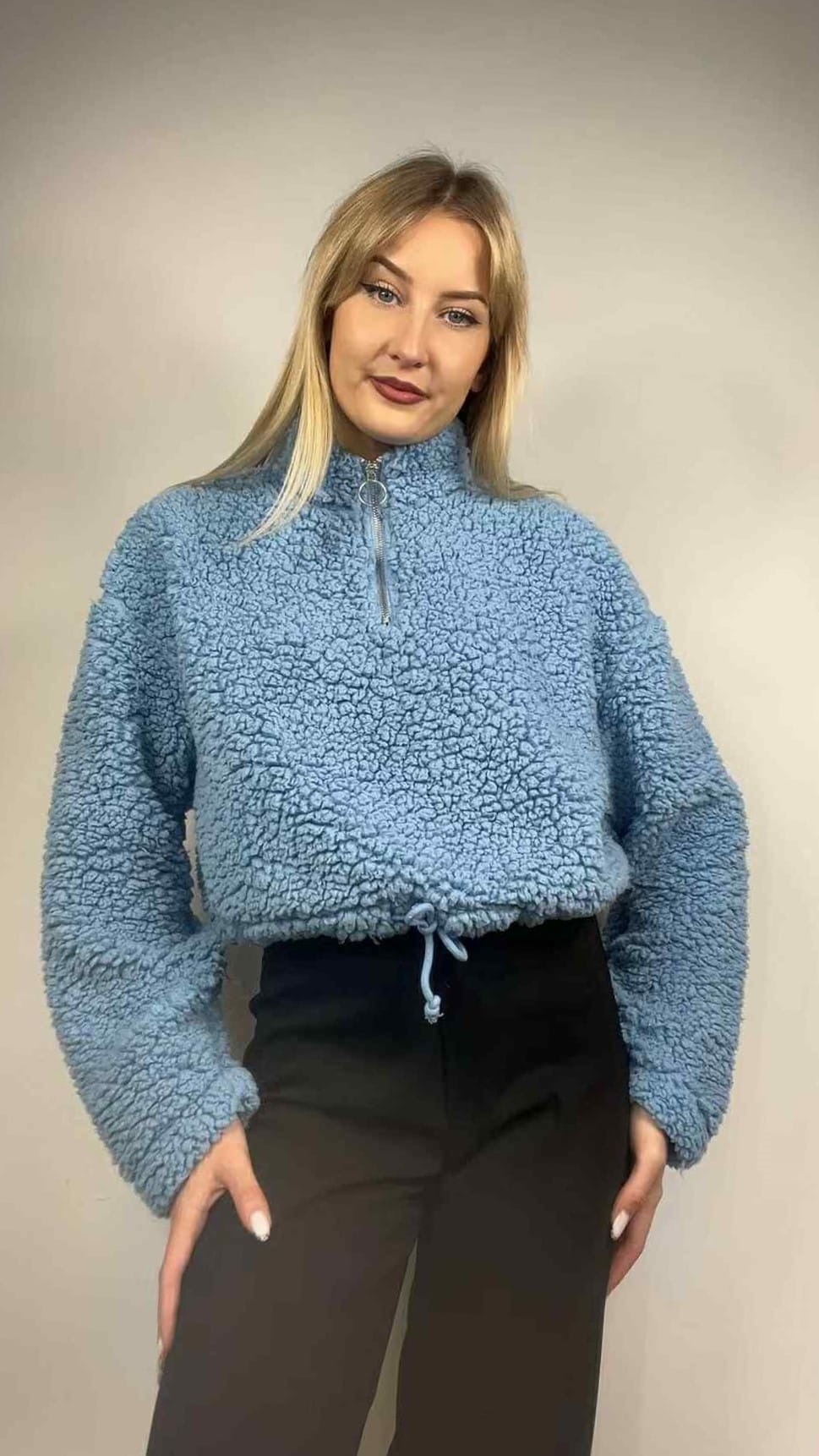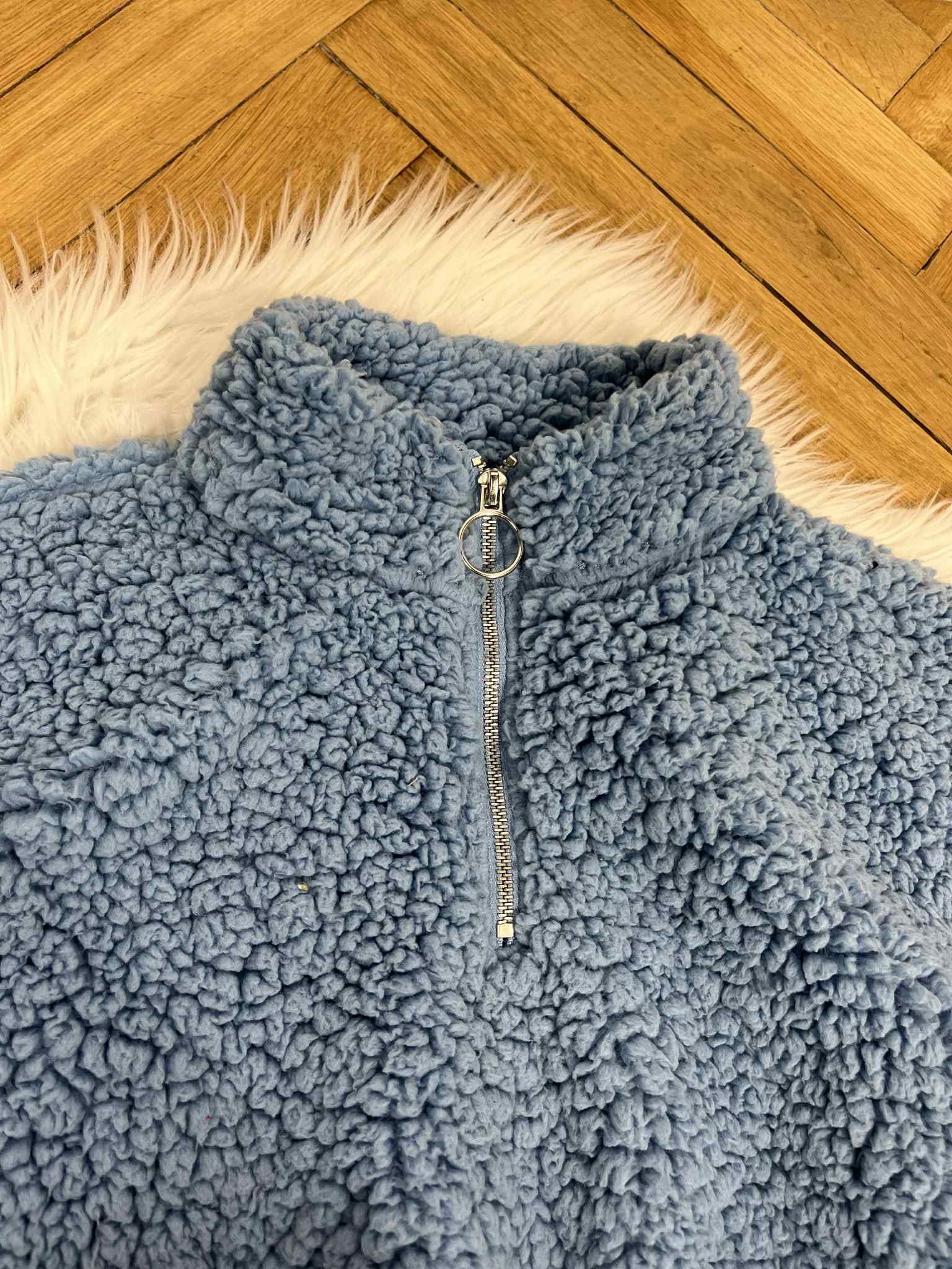 Bluza futrzak fluffy baranek Tally Weijl rozmiar M. Kolor niebieski. Szerszy krój. Cieplutka. Na dole sznurek ściągający. Wymiary: długość 49 cm, pachy 60 cm, rękaw 58 cm. Stan bardzo dobry.
