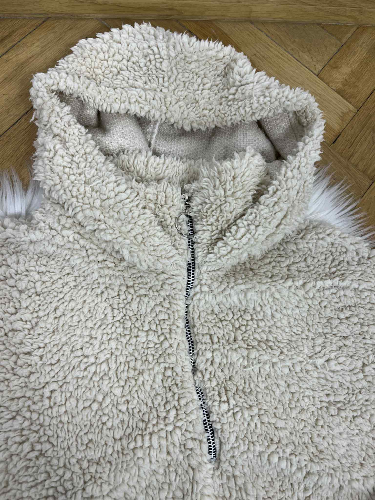 Bluza futrzak fluffy rozmiar S. Marka PrettyLittleThing. Kolor beżowy. Na dekolcie suwak. Typ długa kangurka z kapturem. Można nosik jako sukienkę. Wymiary: długość 83 cm. pachy 62-74 cm. Stan bardzo dobry.