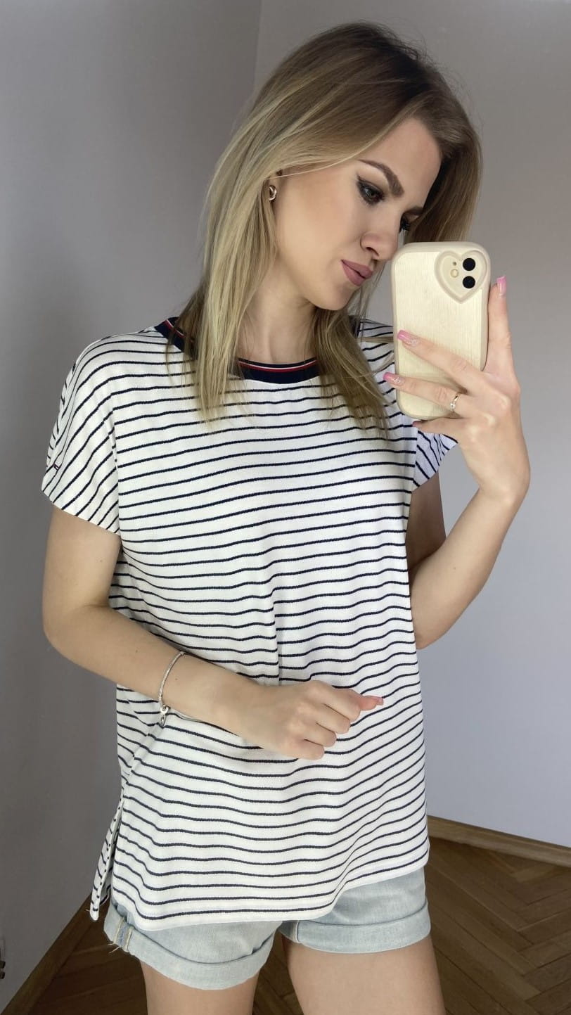 Bluzka marki Tommy Hilfiger. Rozmiar 40. Kolor biały w granatowe paski. Materiał elastyczny 96% wiskoza, 4% elastan. Długość całkowita 64cm, pachy 52 cm. Stan idealny.