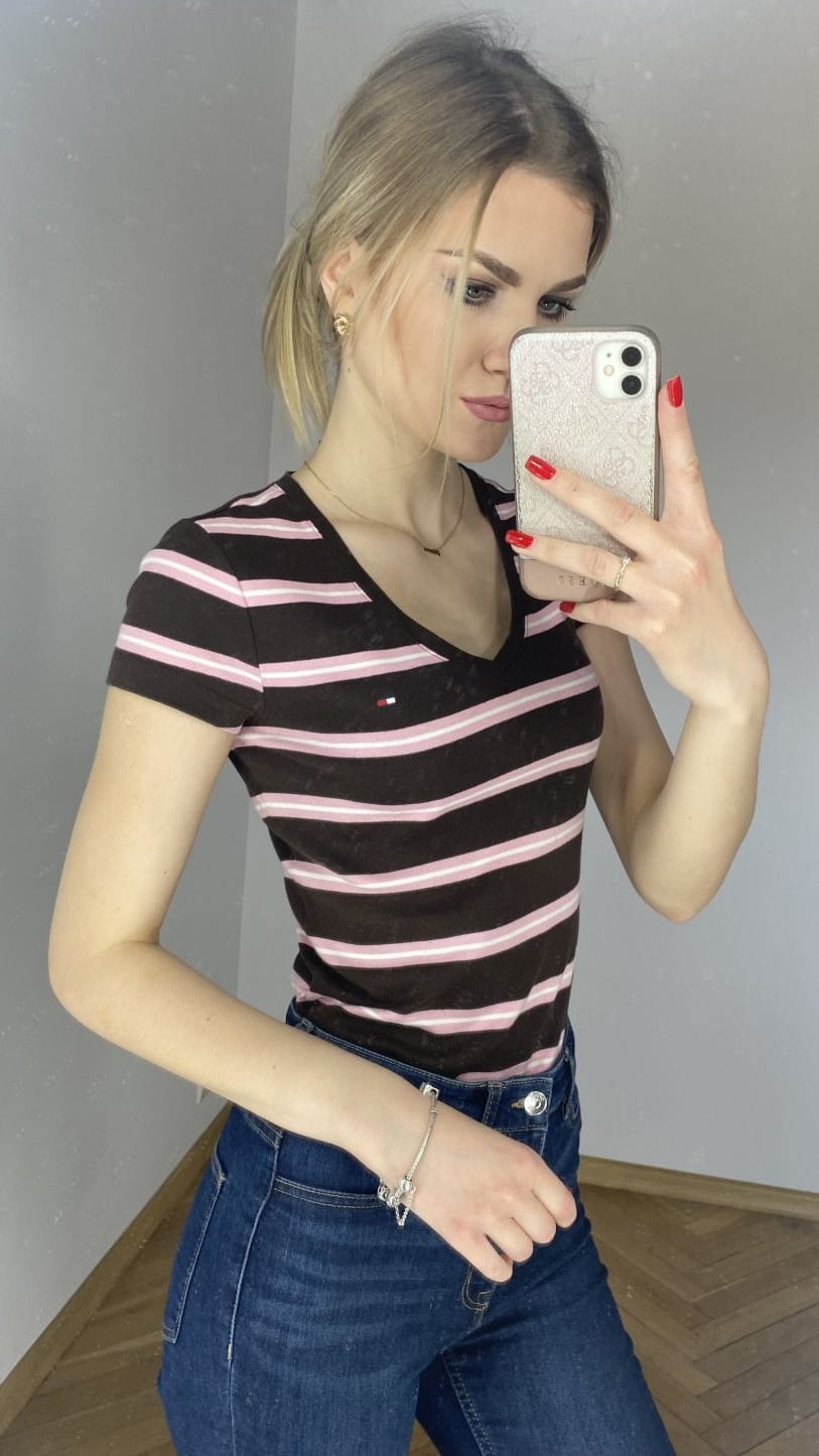Marka: Tommy Hilfiger Rozmiar: XS Kolor dominujący: brązowy, różowy, biały Wzór: paski Rękaw: krótki Skład materiałowy: 100% bawełna Cechy dodatkowe: obcisły tshirt z dekoltem w serek Wymiary długość całkowita: 58 cm szerokość pachy: 38 cm Stan: idealny Wady: brak