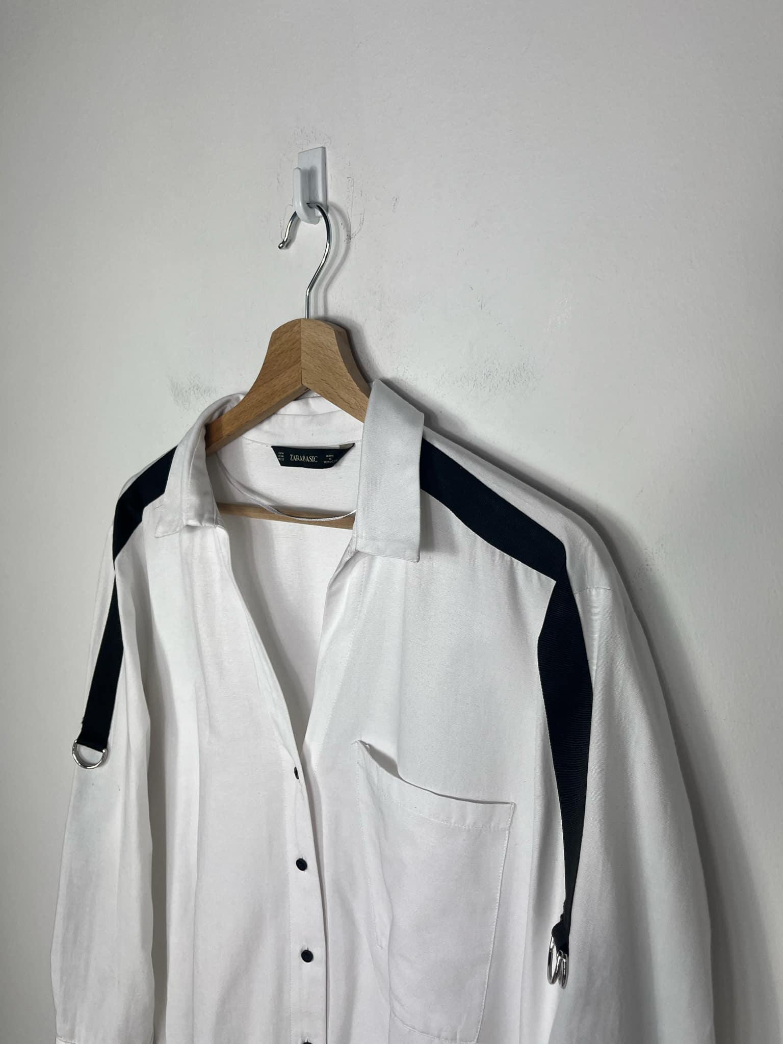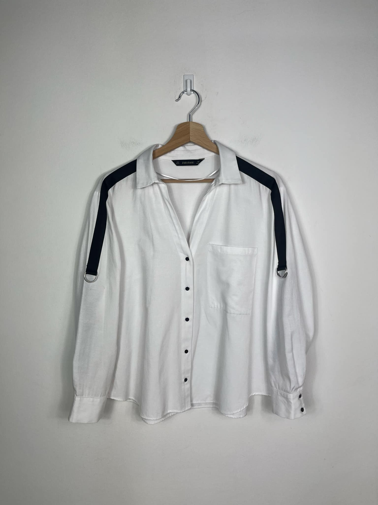 Bluzka koszulowa Zara rozmiar M. Kolor biały z czarną listwą na rękawach umożliwiającą powinięcie rękawów. Koszula o prostym, szerokim oversizeowym kroju. Zapiana na guziki. Materiał miły, przyjemny w dotyku. Wycięta metka ze składem. Wymiary: długość 61 cm, pachy 58 cm. Stan idealny.