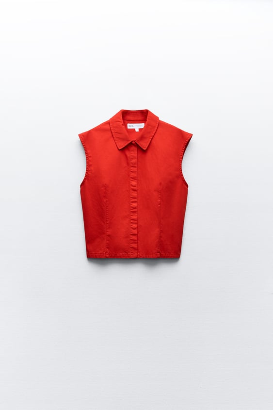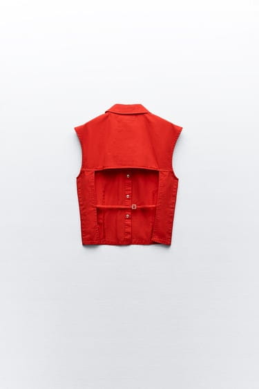 Bluzka Zara rozmiar S. Kolor czerwony. Zapinana na kryte zatrzaski. Wycięte plecy z paskiem regulującym. Koszulowy materiał. Materiał w składzie 100% bawełna. Wymiary: długość 52 cm, pachy 50 cm. Stan nowy z metką.