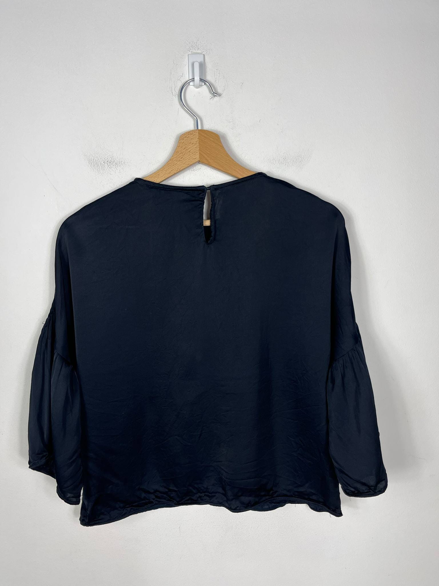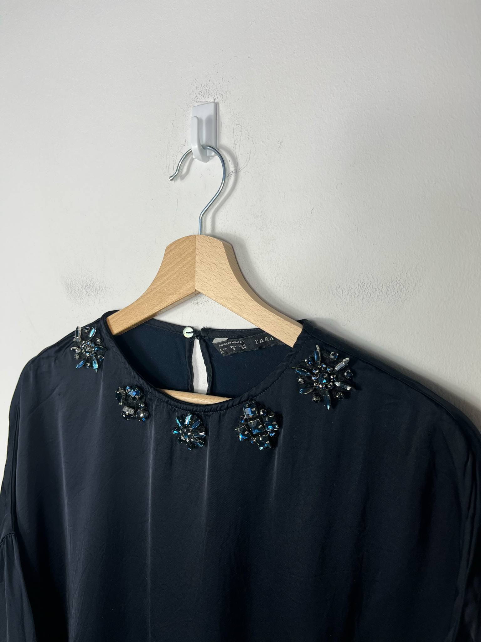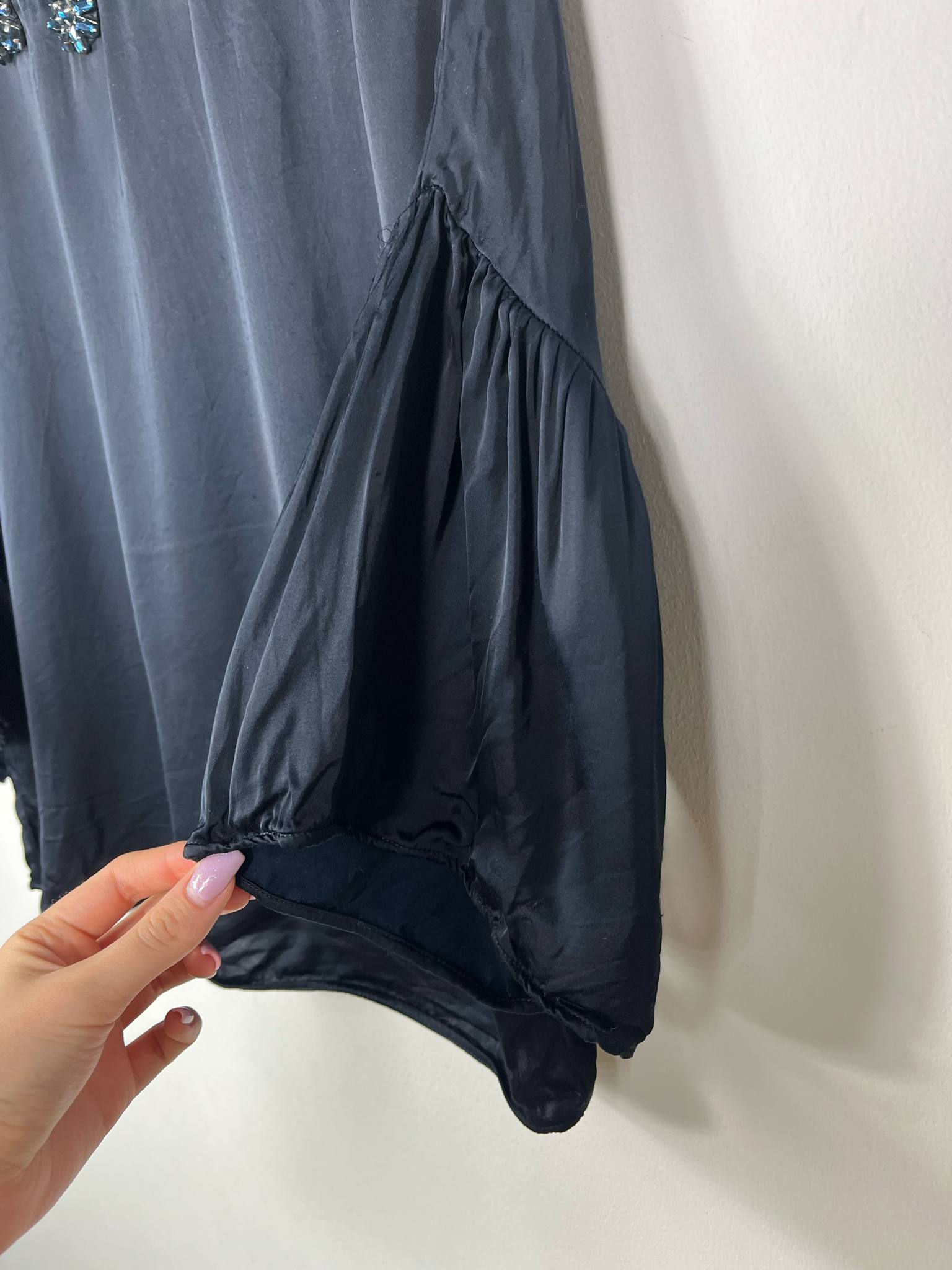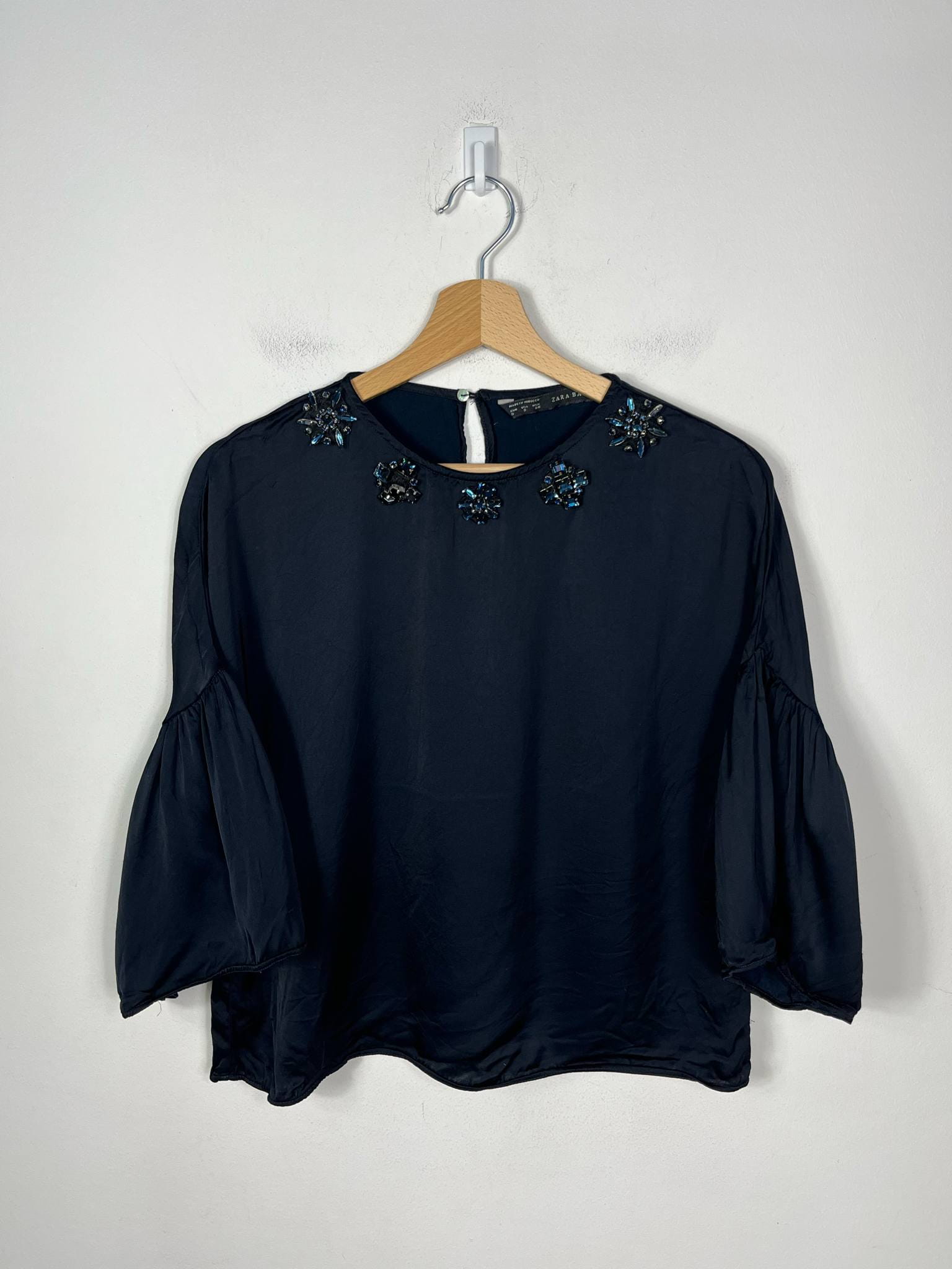 Satynowa bluzka z kamieniami Zara rozmiar S. kolor granatowy. Rękaw o długość 3/4 wykończony szeroką falbaną. Na dekolcie ozdobne kamienie. Prosty, szeroki krój. Wycięta metka wewnętrzna ze składem. Wymiary: długość 54 cm, pachy 55 cm. Stan bardzo dobry.