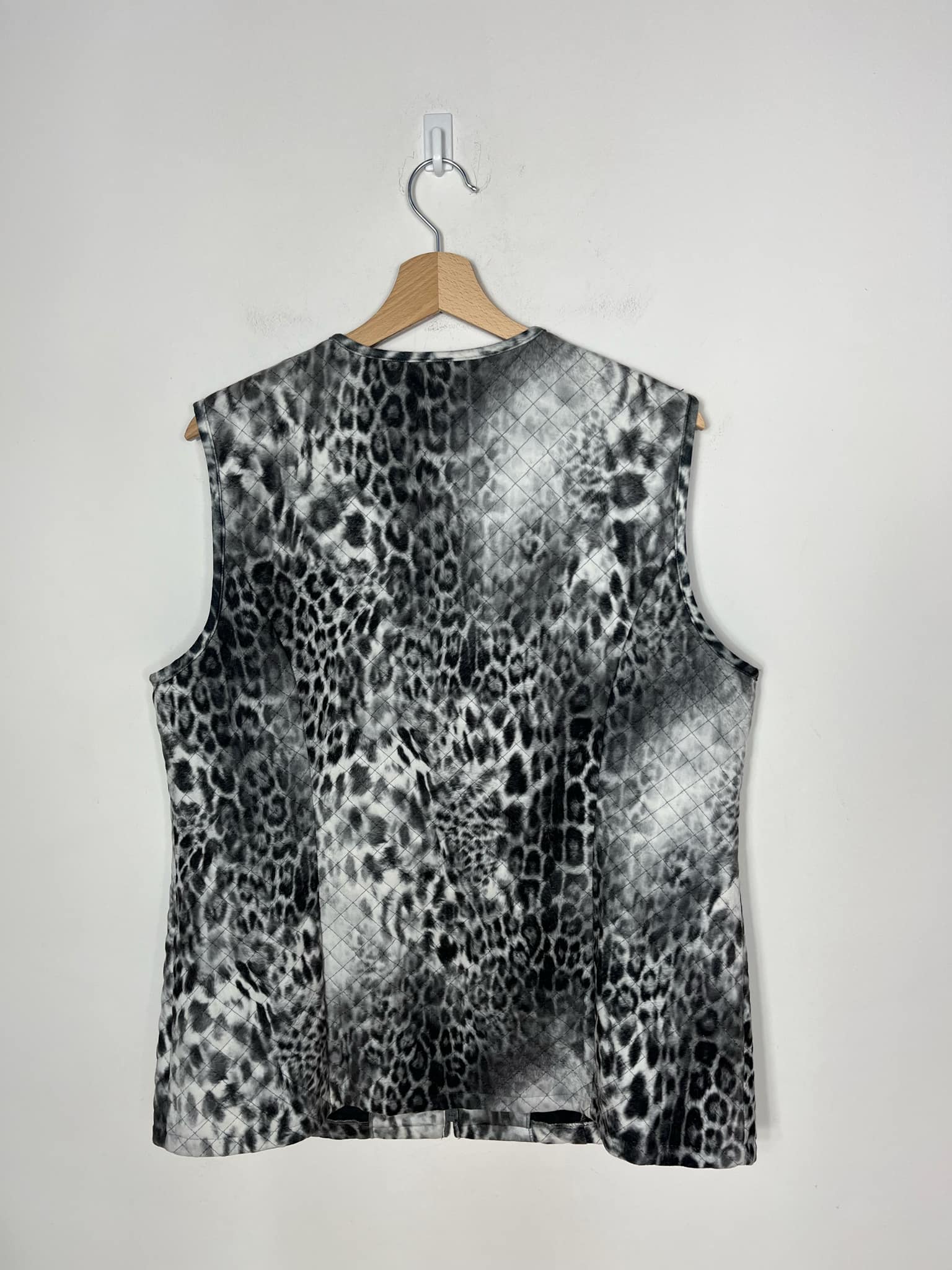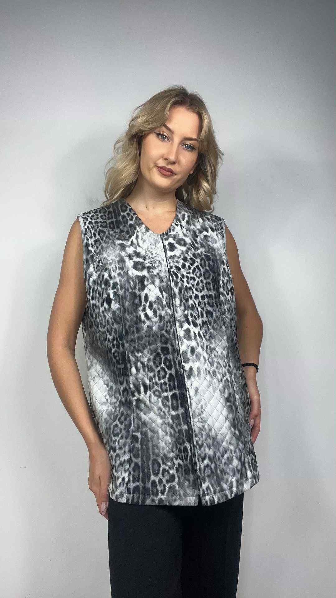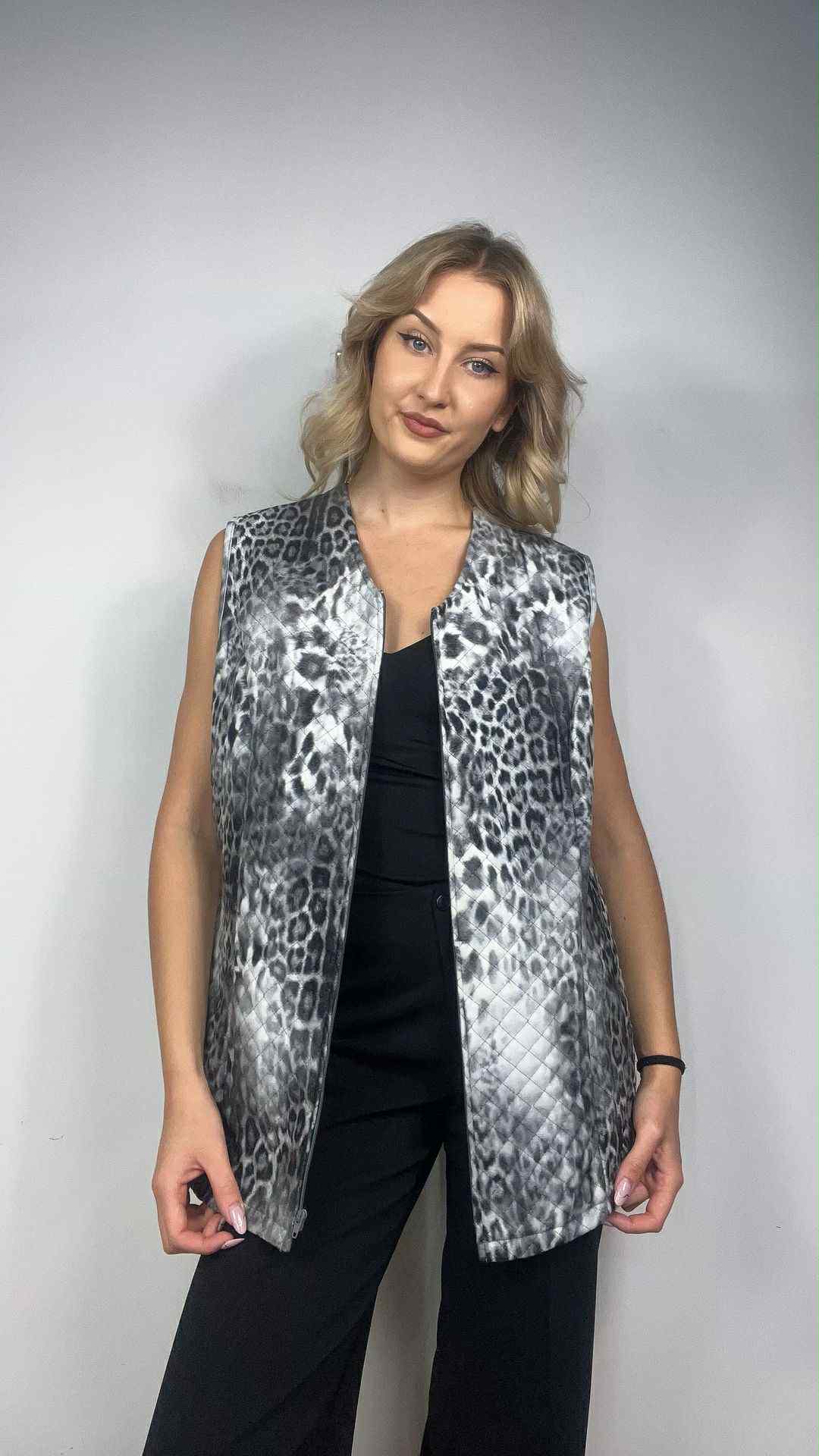 Kamizelka/bezrękawnik w panterkę rozmiar 44 (XXL). Wzór panterka w odcieniach szary, czarny, biały. Zapinany na suwak. Lekkie ocieplenie. Wymiary: długość 73 cm, pachy 57 cm, ramiona 42 cm. Stan idealny.
