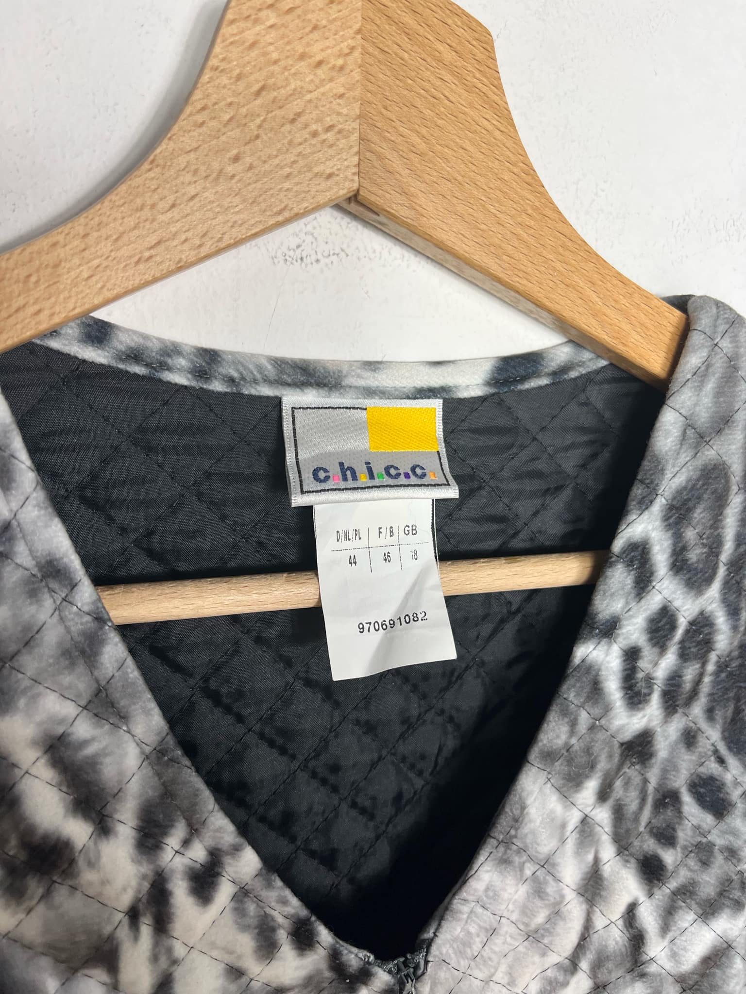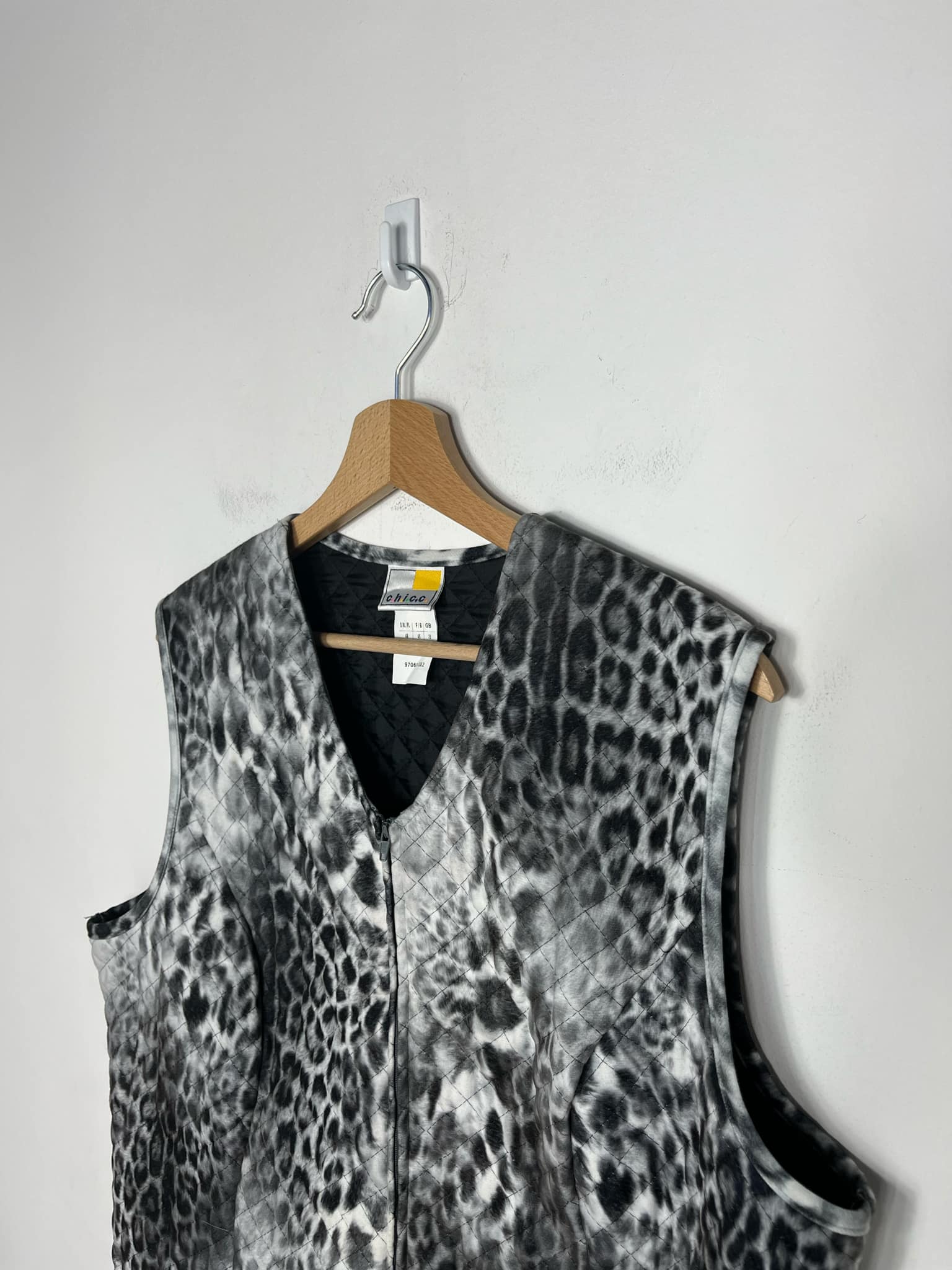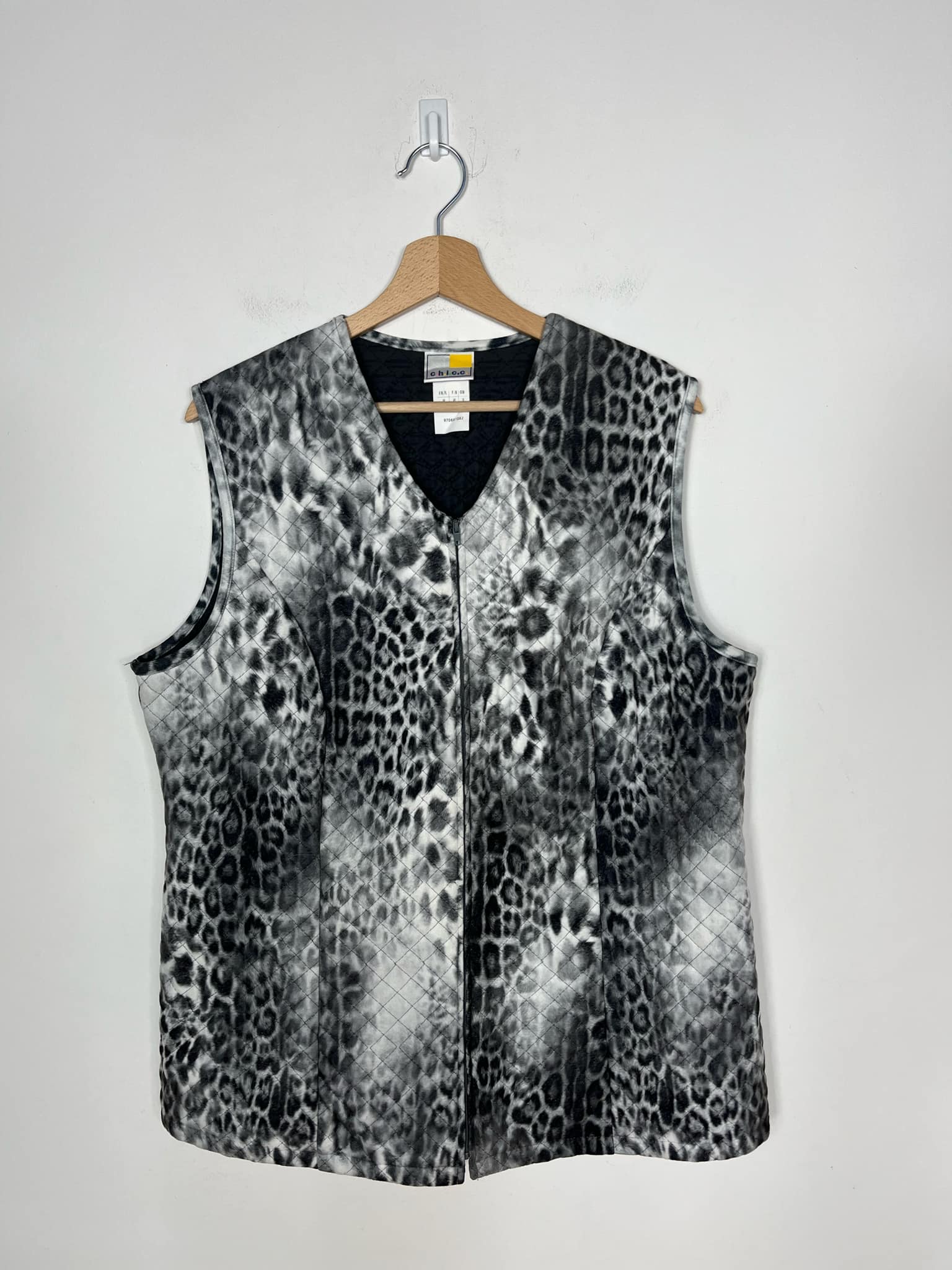 Kamizelka/bezrękawnik w panterkę rozmiar 44 (XXL). Wzór panterka w odcieniach szary, czarny, biały. Zapinany na suwak. Lekkie ocieplenie. Wymiary: długość 73 cm, pachy 57 cm, ramiona 42 cm. Stan idealny.