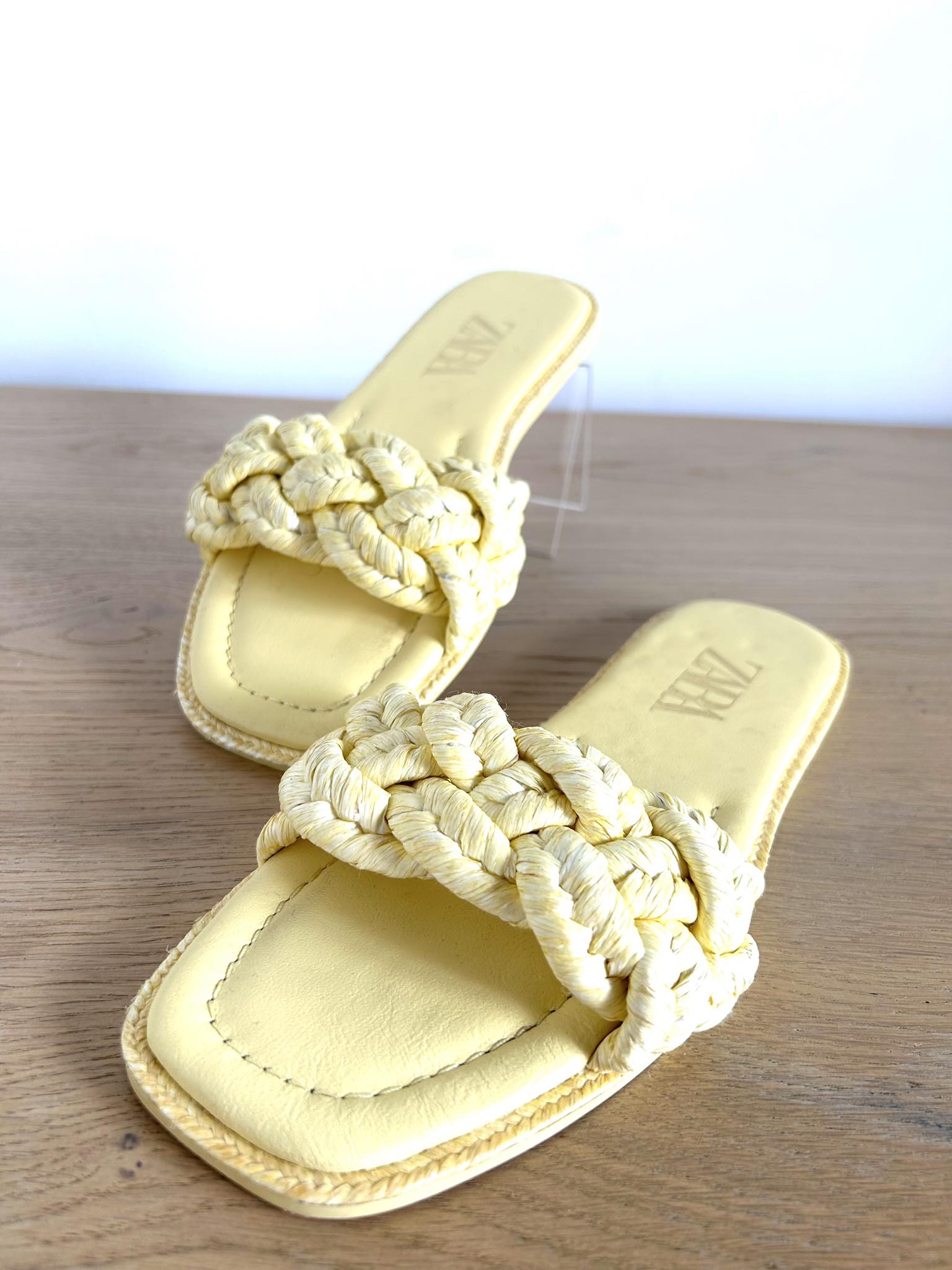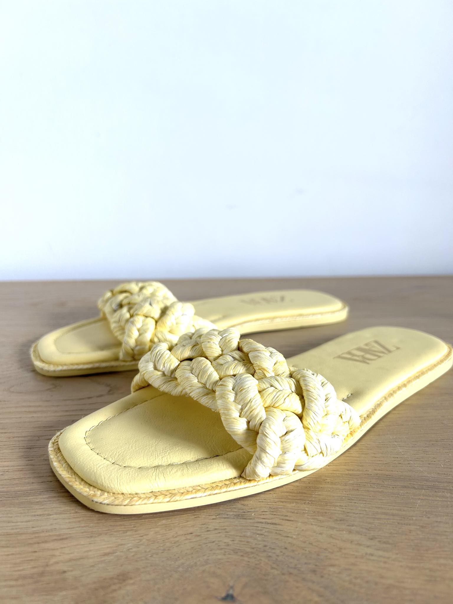 Klapki Zara w kolorze żółtym rozmiar 37. Pleciony przód. Długość wkładki 24,5 cm. Stan nowy bez metki (ślady mierzenia)