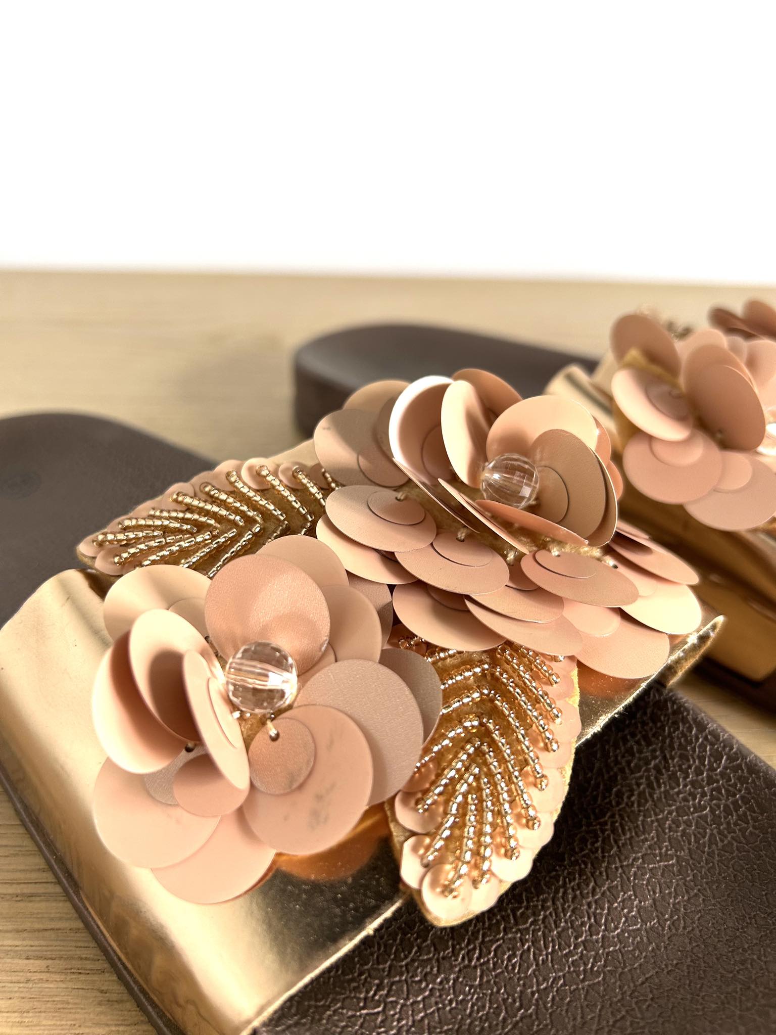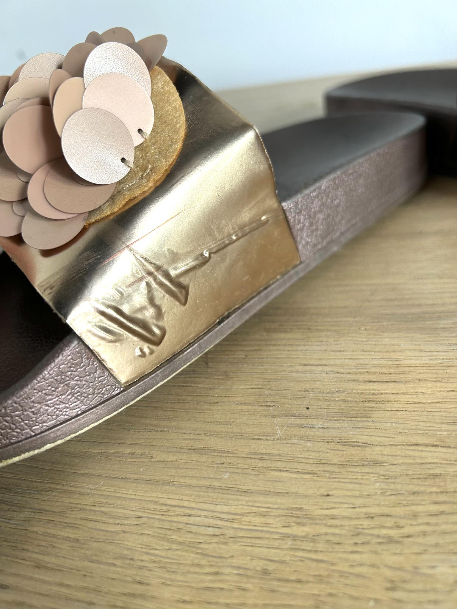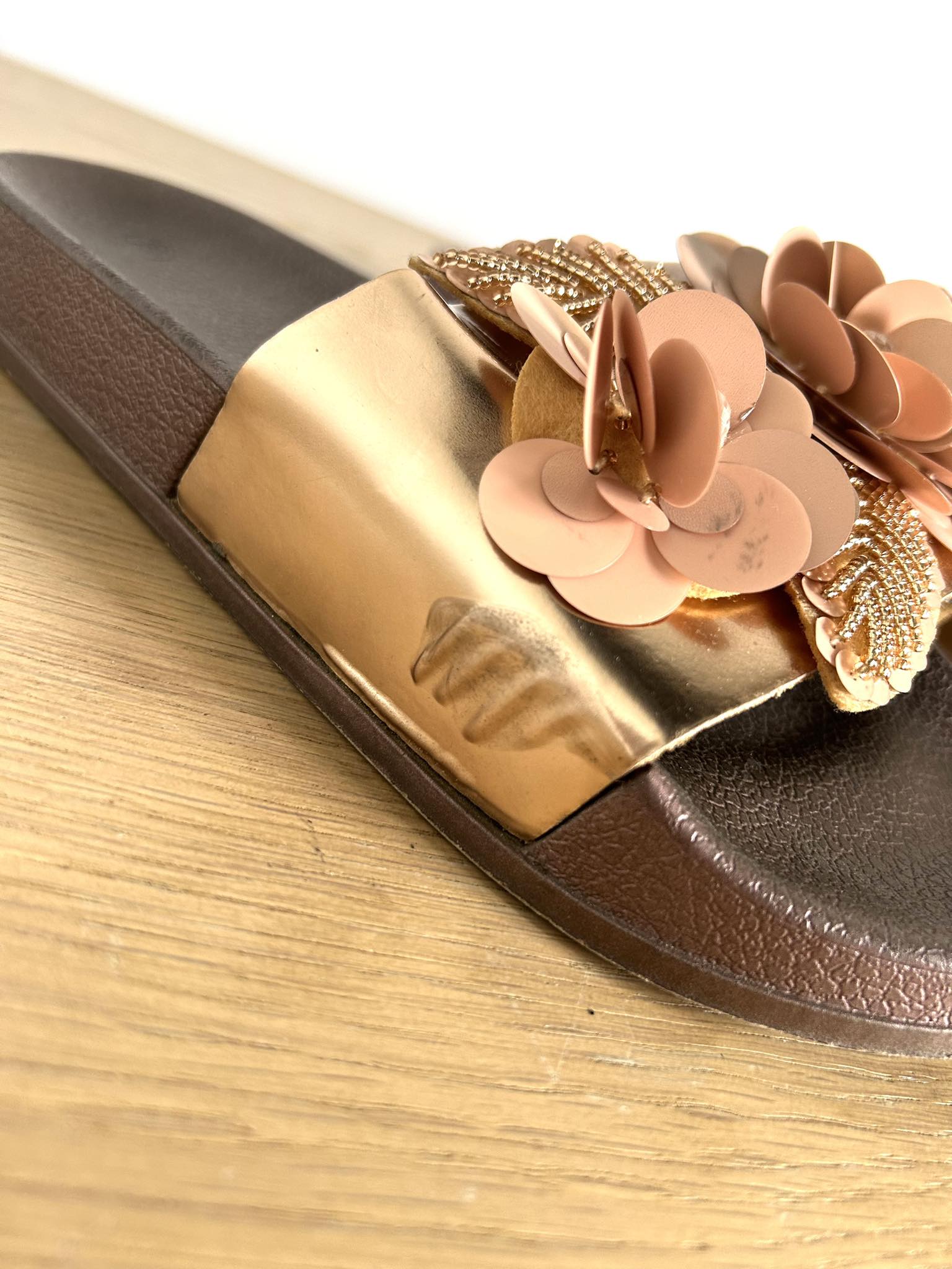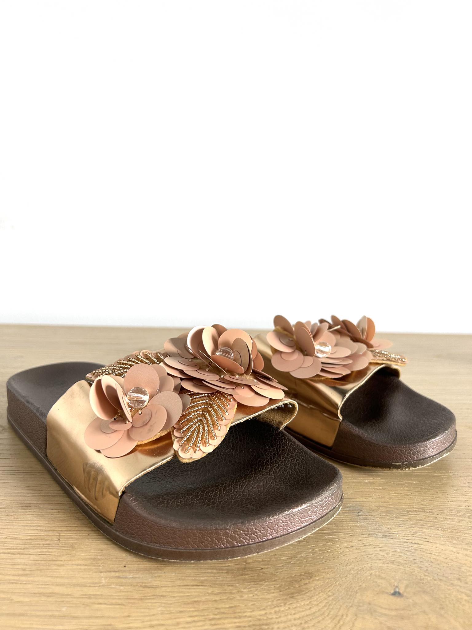Klapki metaliczne z kwiatami w rozmiarze 38. Podeszwa gumowa brązowa, przód metaliczny rose gold z kwiatkami 3d. Pięknie prezentują się na nodze. Stan bardzo dobry, minimalne ślady użytkowanie niewidoczne podczas chodzenia w butach. Długość buta 24,5 cm.