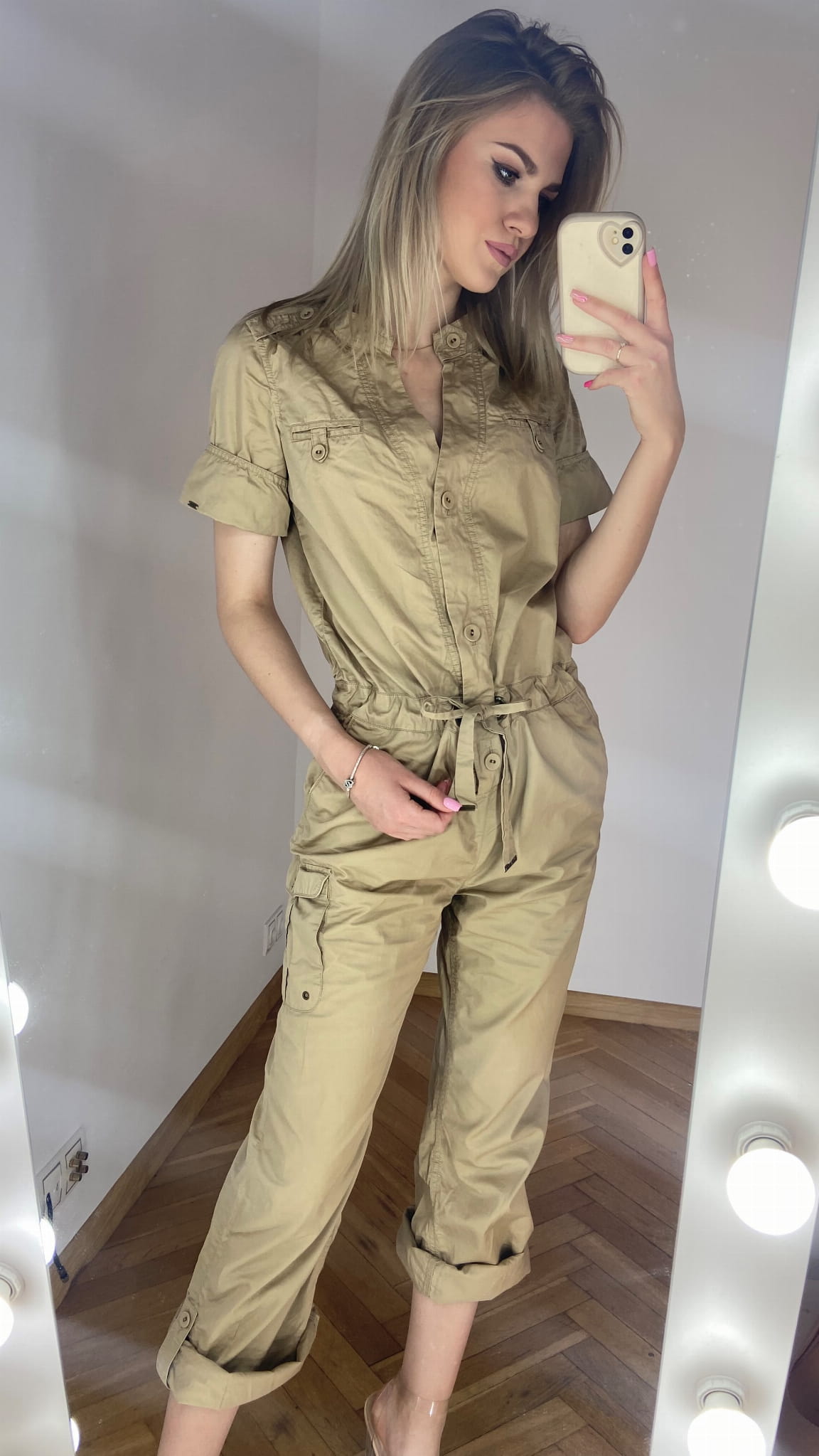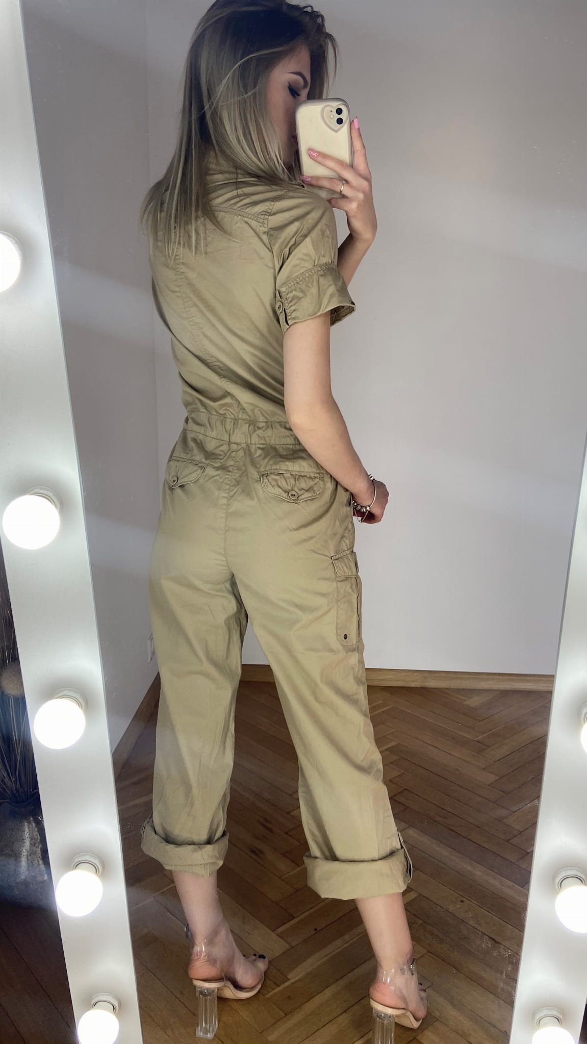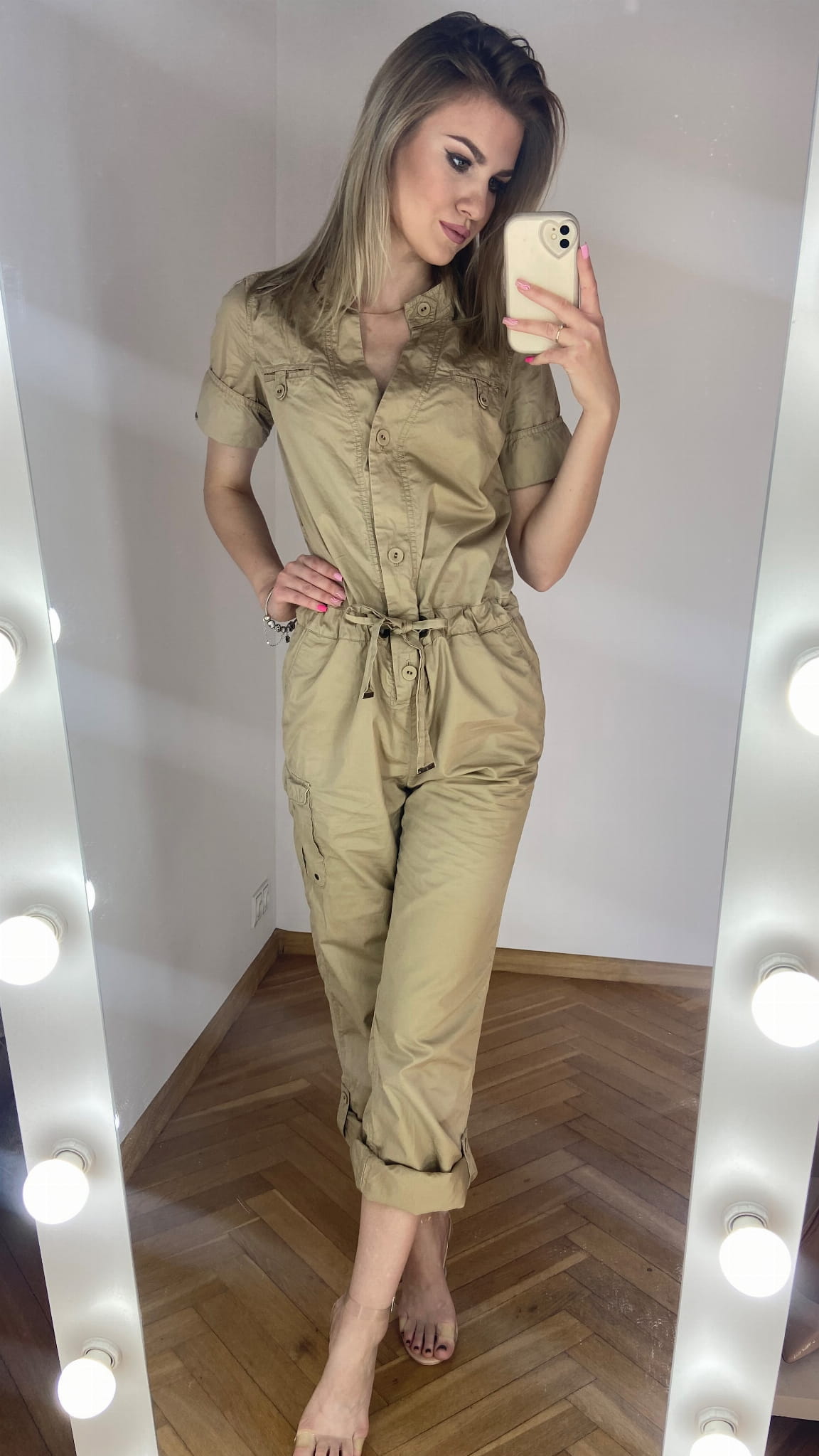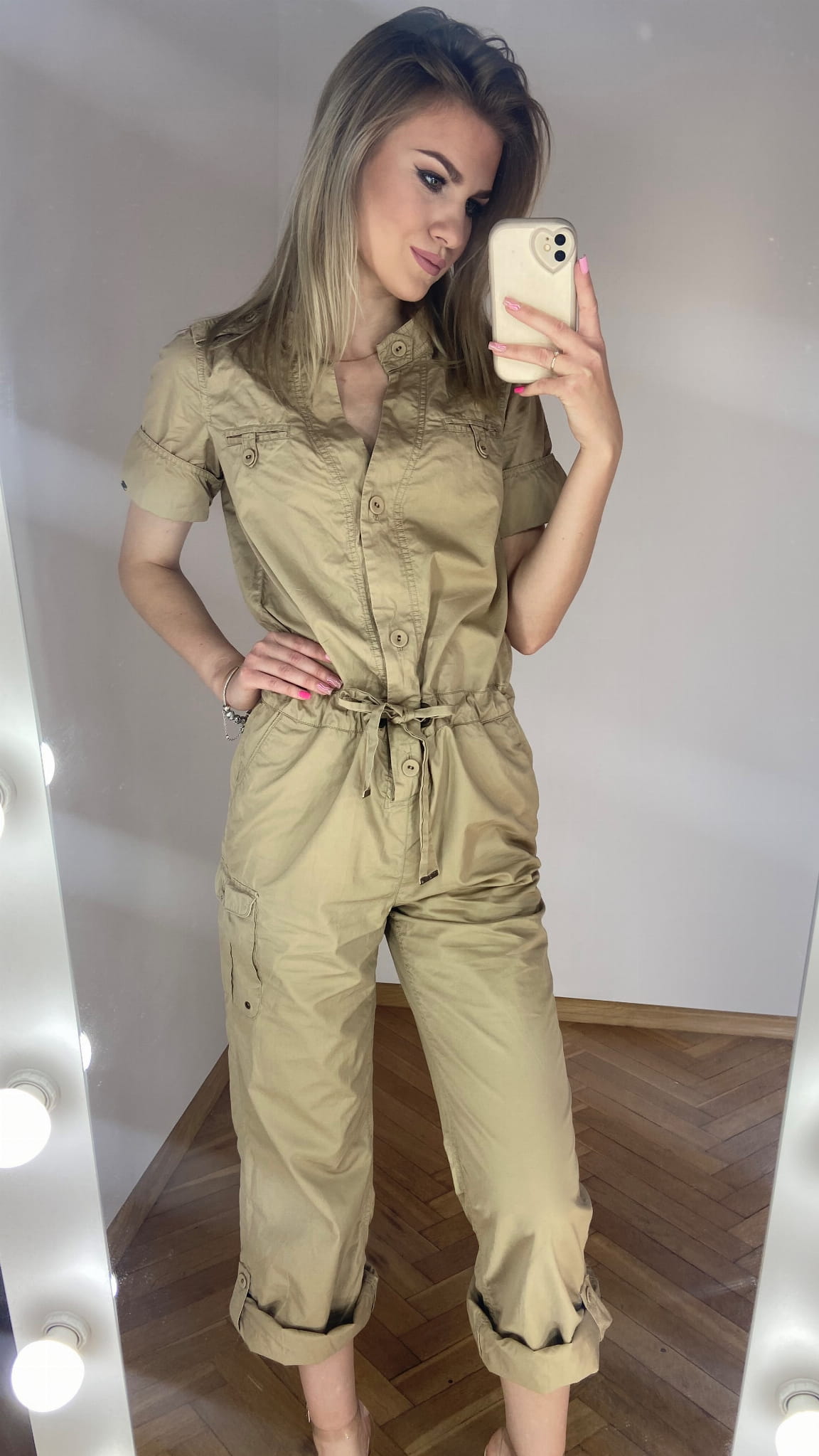 MARKA: Tommy Hilfiger ROZMIAR: XS KOLOR DOMINUJĄCY: beżowy WZÓR: brak RĘKAW: krótki DŁUGOŚĆ: przed kostkę/ długi SKŁAD MATERIAŁÓW: 100% bawełna CECHY DODATKOWE: w stylu cargo, zapinany na guziki, wiązany w pasie, szerokie proste nogawki - powijane WYMIARY: długość całkowita: 137 cm - podwinięta nogawka(do pasa 52 cm, od pasa w dół 85 cm) szerokość pachy: 49 cm pas: 44 cm STAN: idealny WADY: brak CENA PRODUCENTA: 999,00 zł