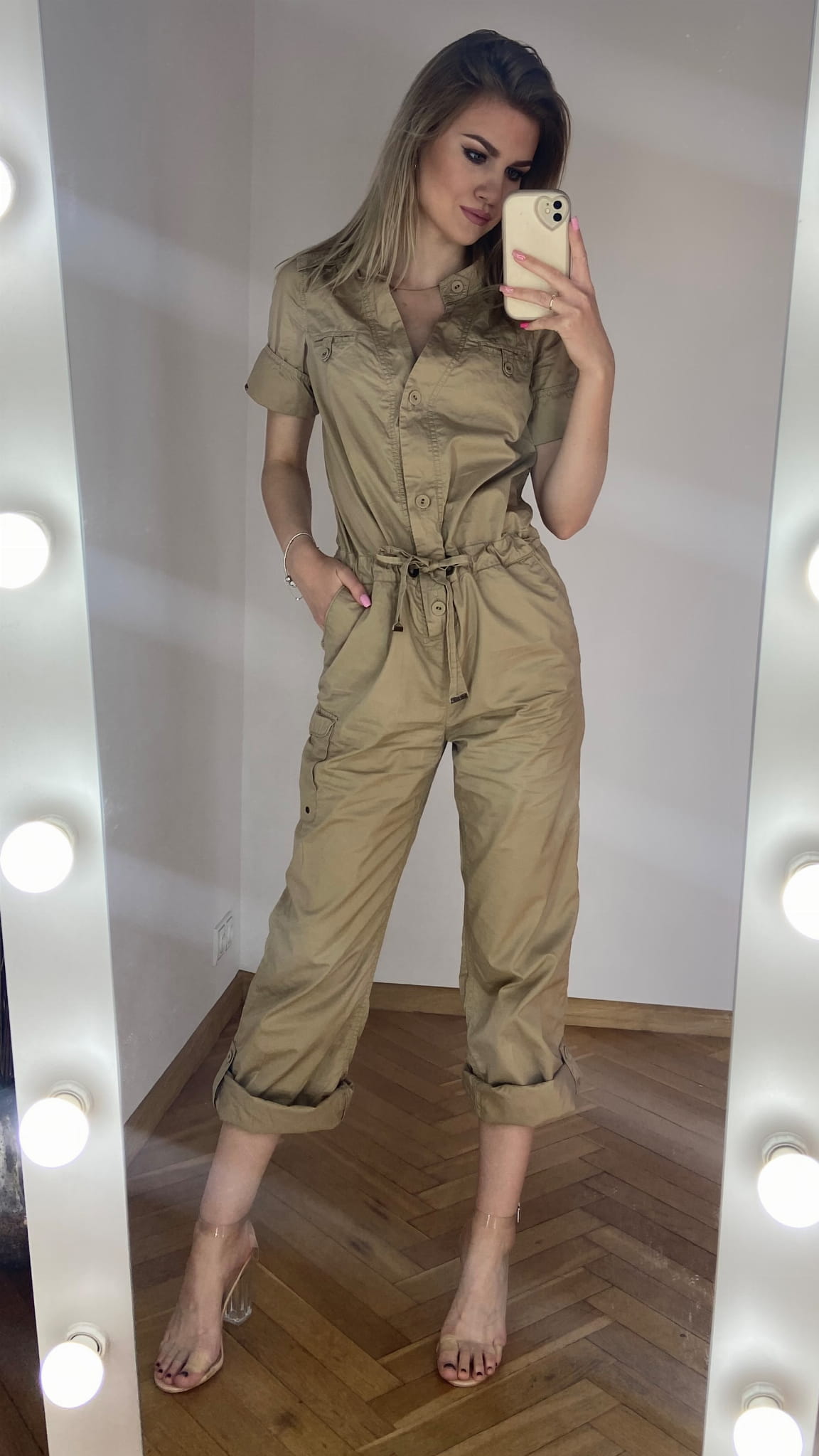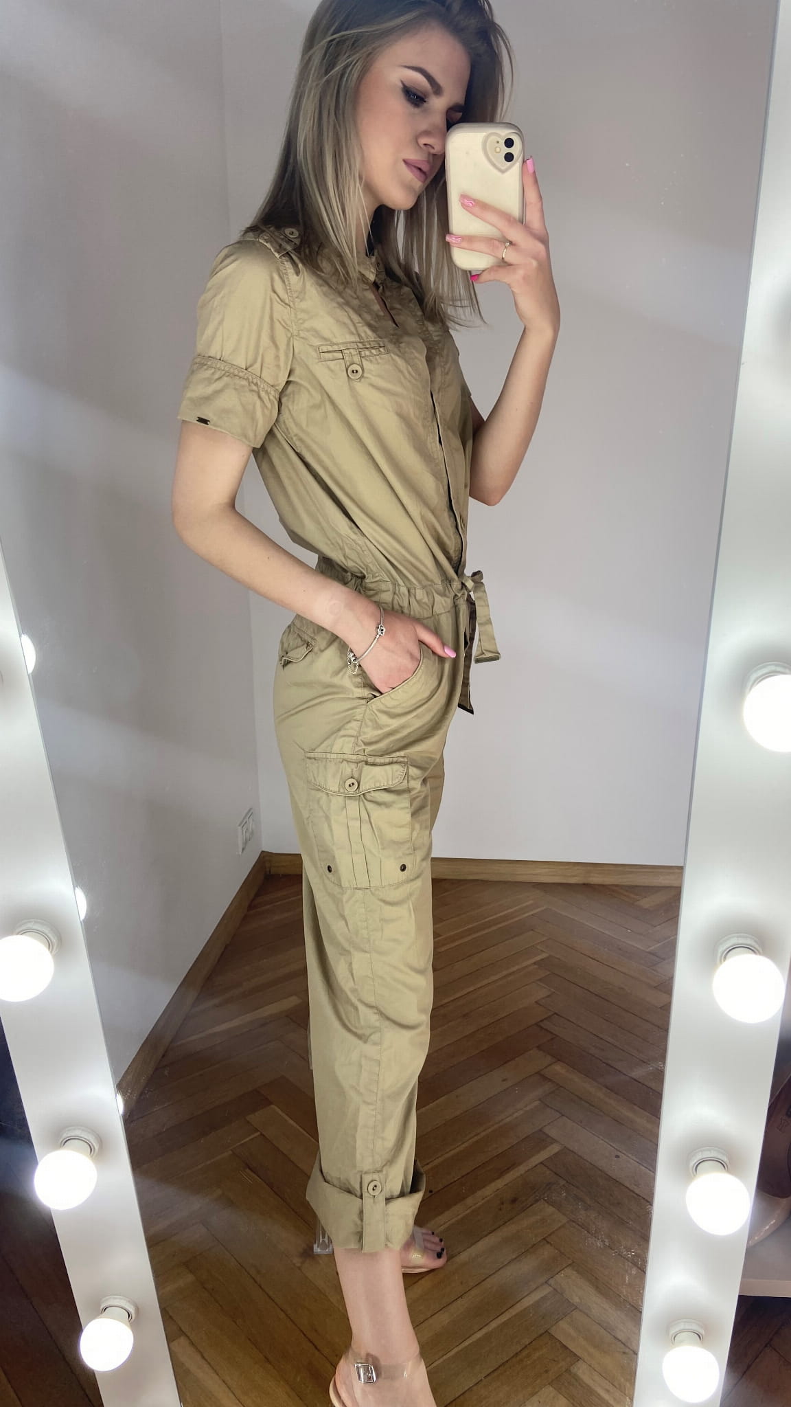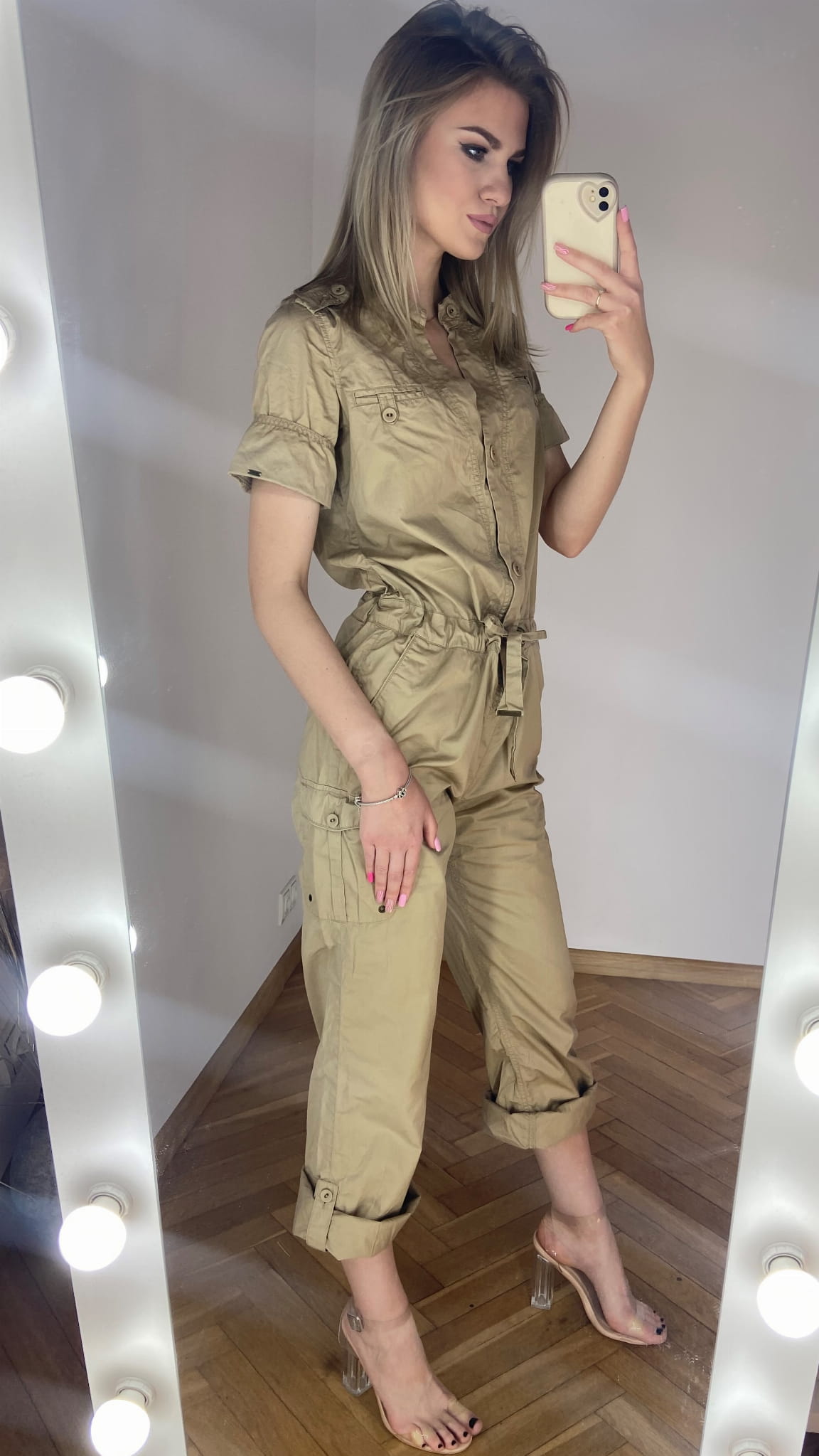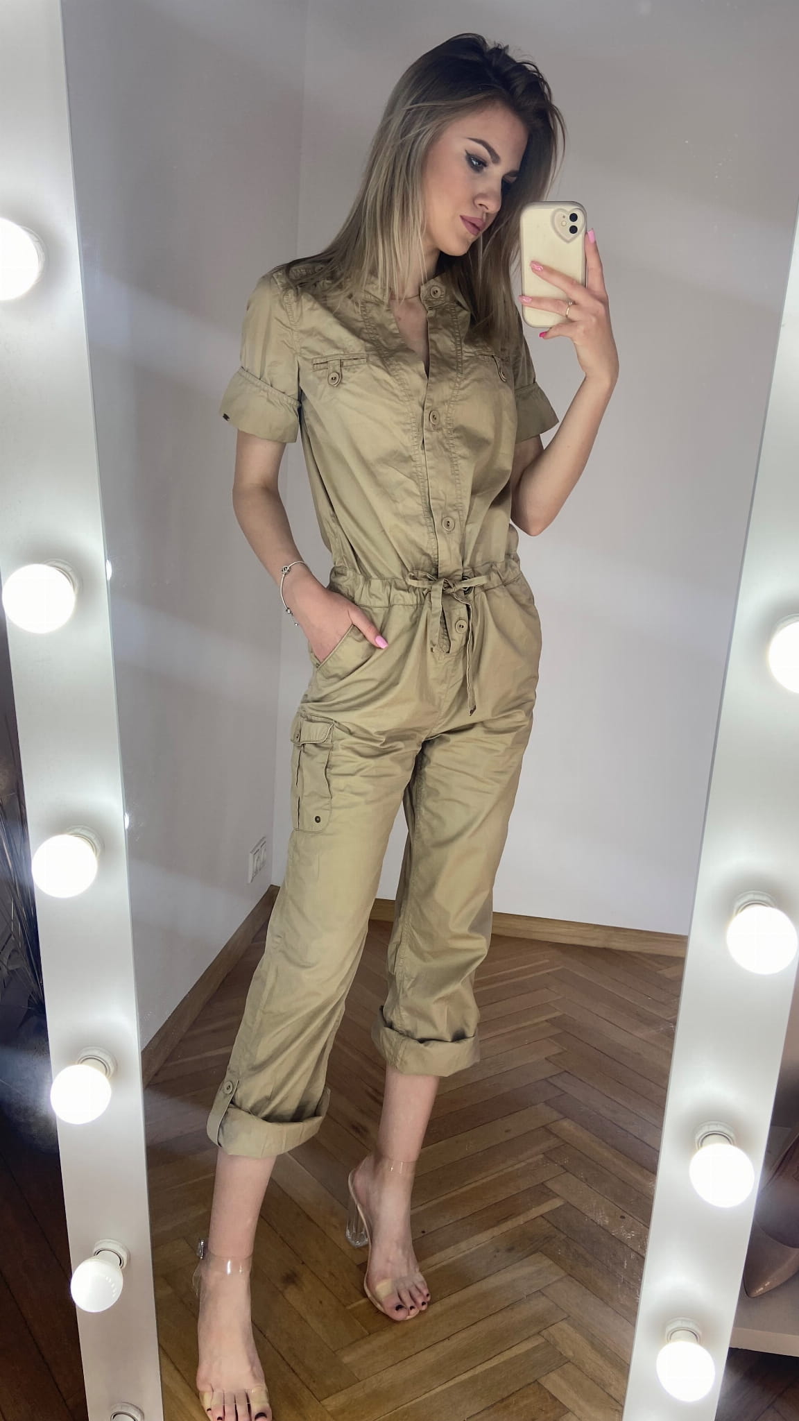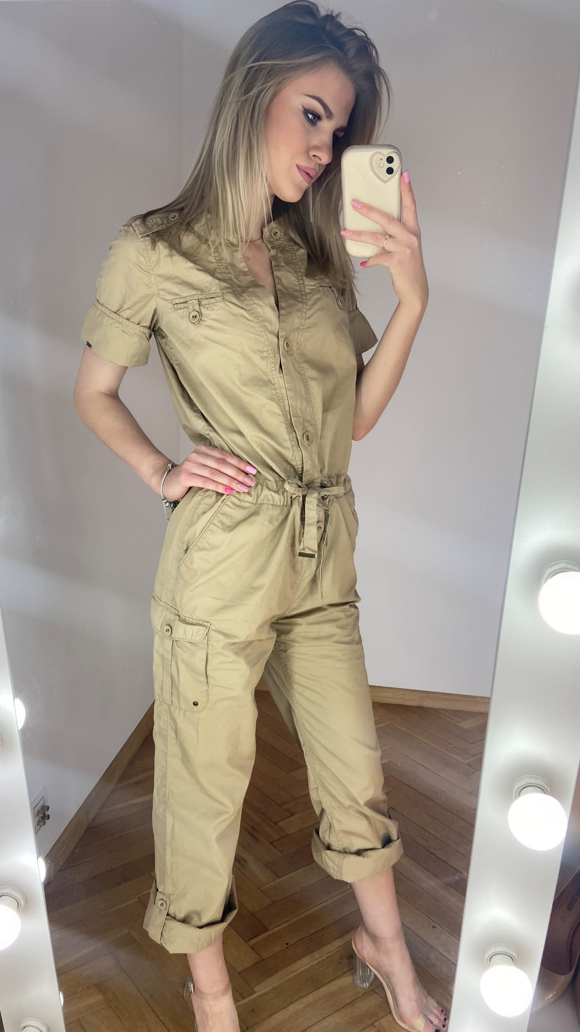 MARKA: Tommy Hilfiger ROZMIAR: XS KOLOR DOMINUJĄCY: beżowy WZÓR: brak RĘKAW: krótki DŁUGOŚĆ: przed kostkę/ długi SKŁAD MATERIAŁÓW: 100% bawełna CECHY DODATKOWE: w stylu cargo, zapinany na guziki, wiązany w pasie, szerokie proste nogawki - powijane WYMIARY: długość całkowita: 137 cm - podwinięta nogawka(do pasa 52 cm, od pasa w dół 85 cm) szerokość pachy: 49 cm pas: 44 cm STAN: idealny WADY: brak CENA PRODUCENTA: 999,00 zł