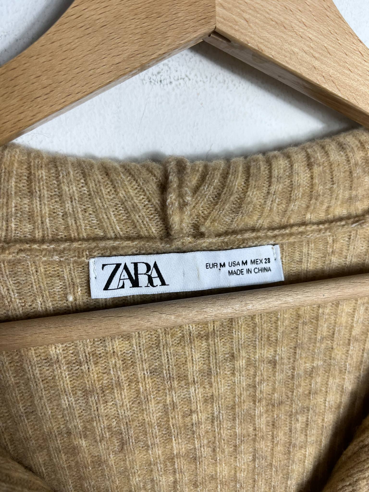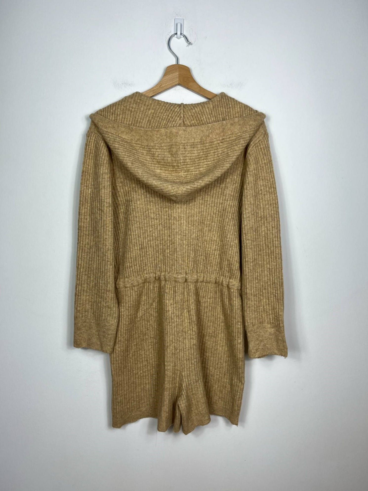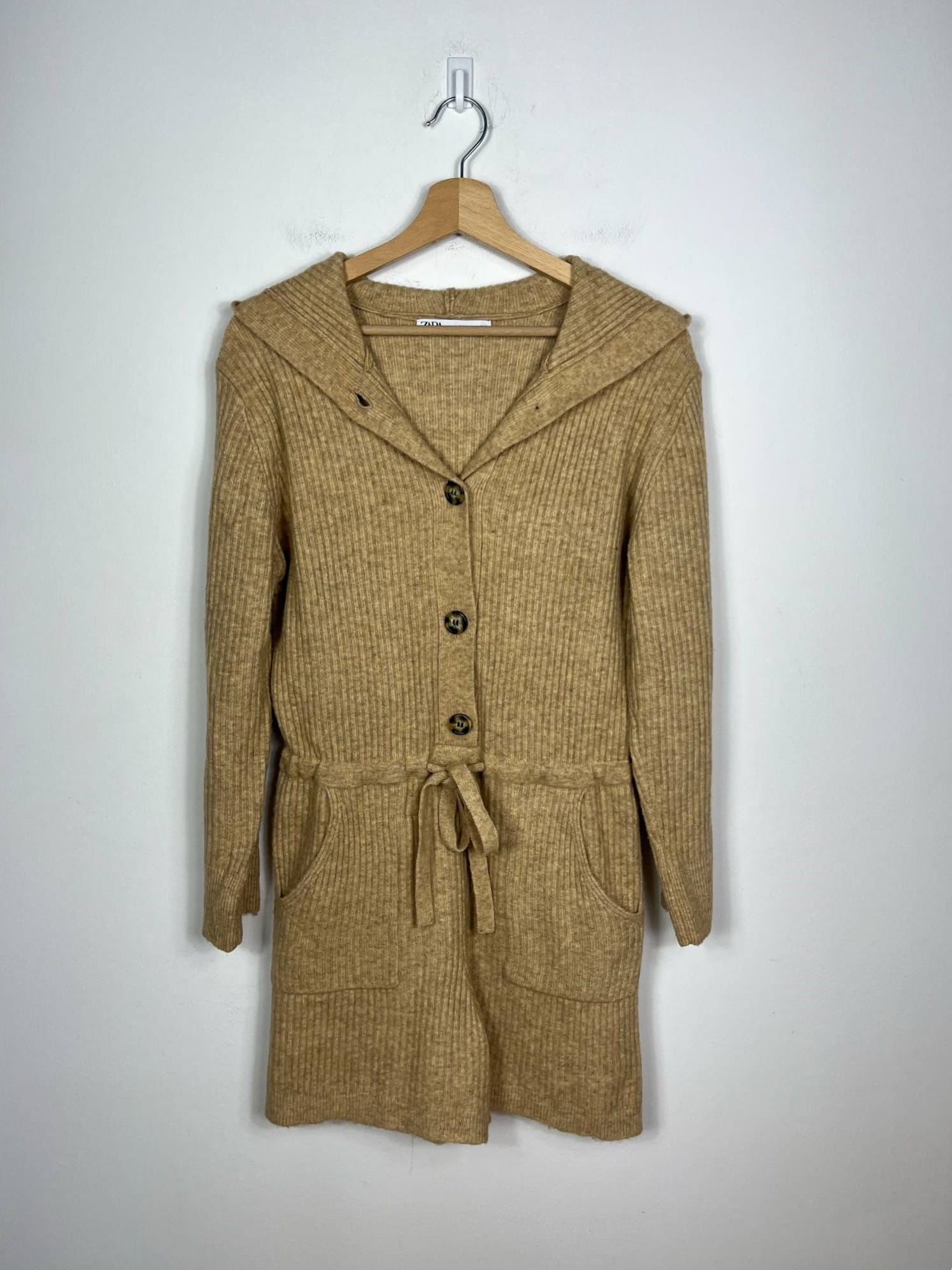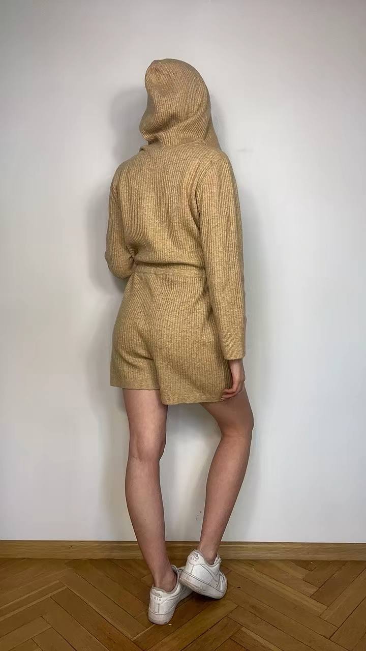 Kombinezon dzianinowy Zara rozmiar M. Kolor beżowy. Górna część zapinana na guziki, kaptur długi rękaw. W pasie gumka i pasek ściągający. Kieszenie z przodu. Materiał w składzie 45% akryl, 42% nylon, 7% elastan, 6% wełna. Wymiary: długość 82 cm (42 cm góra, 40 cm dół), pachy 48-58 cm, szerokość nogawki 35-45 cm. Stan idealny.
