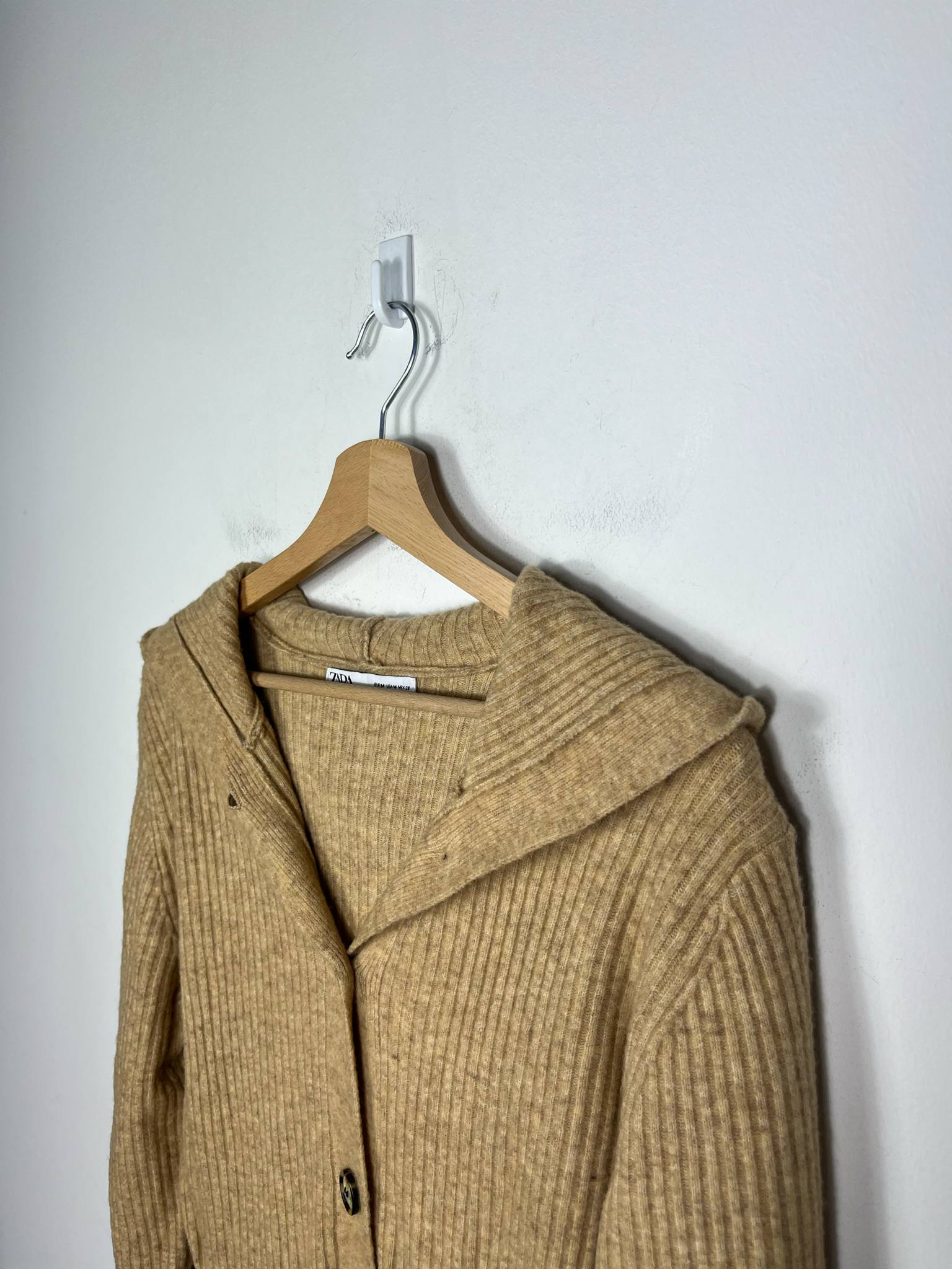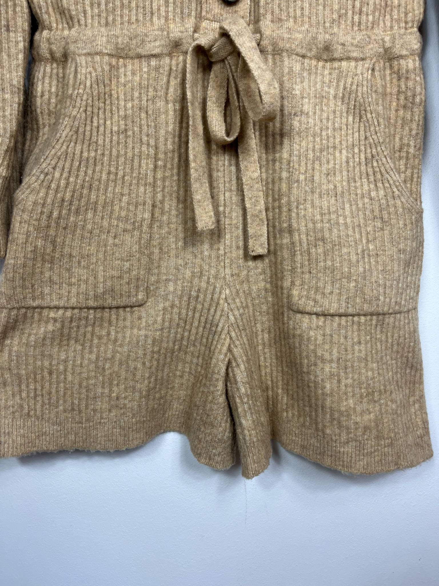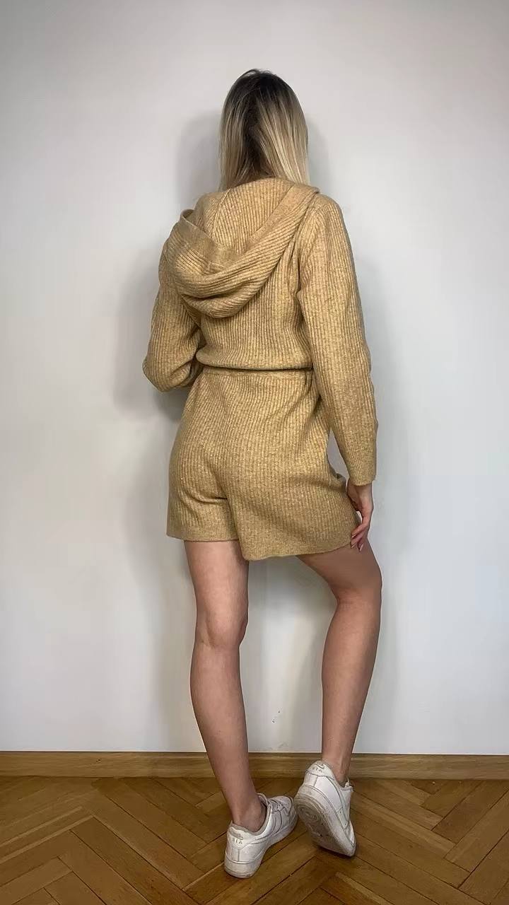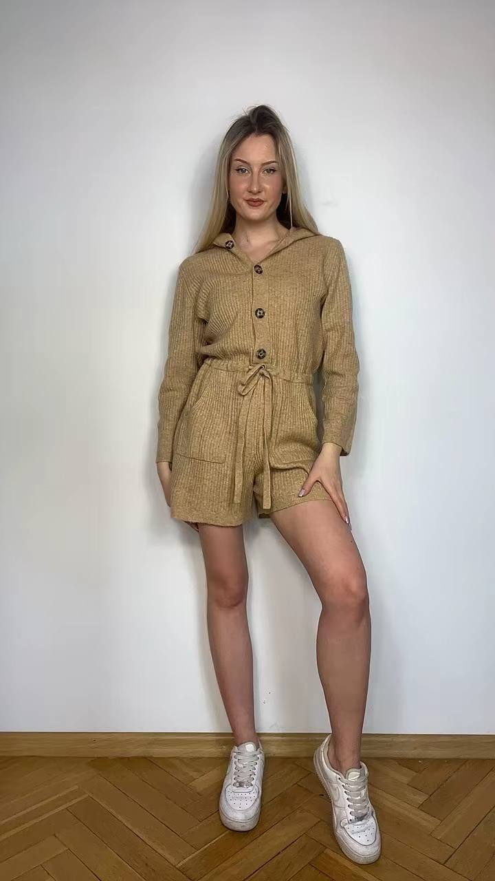 Kombinezon dzianinowy Zara rozmiar M. Kolor beżowy. Górna część zapinana na guziki, kaptur długi rękaw. W pasie gumka i pasek ściągający. Kieszenie z przodu. Materiał w składzie 45% akryl, 42% nylon, 7% elastan, 6% wełna. Wymiary: długość 82 cm (42 cm góra, 40 cm dół), pachy 48-58 cm, szerokość nogawki 35-45 cm. Stan idealny.