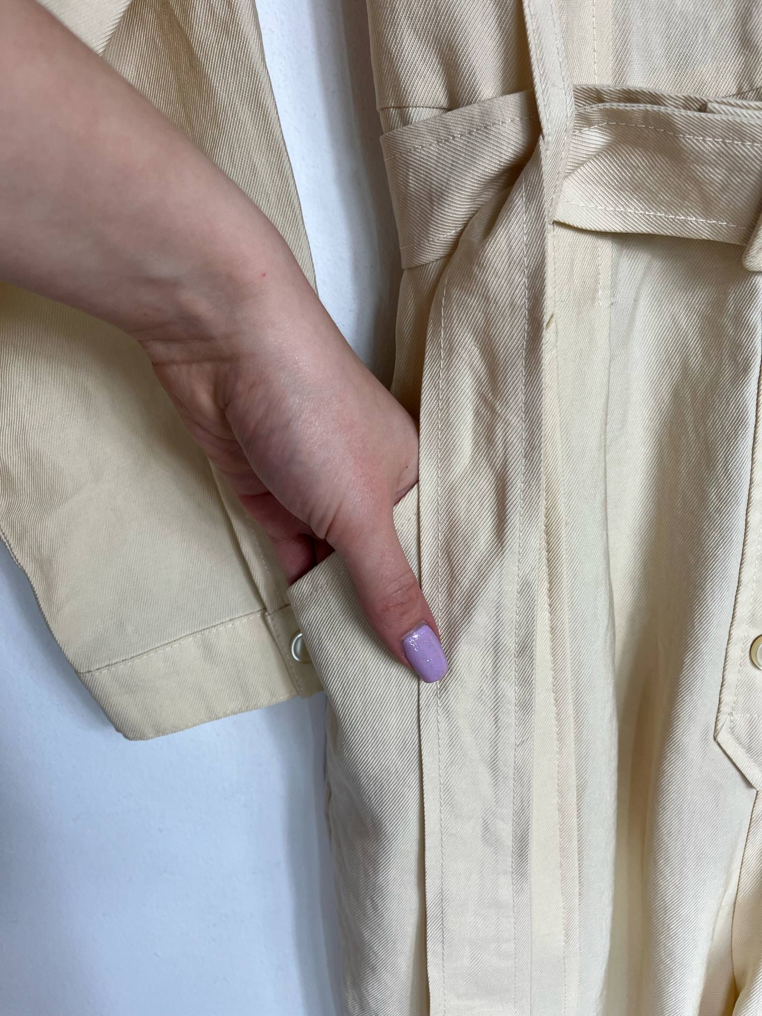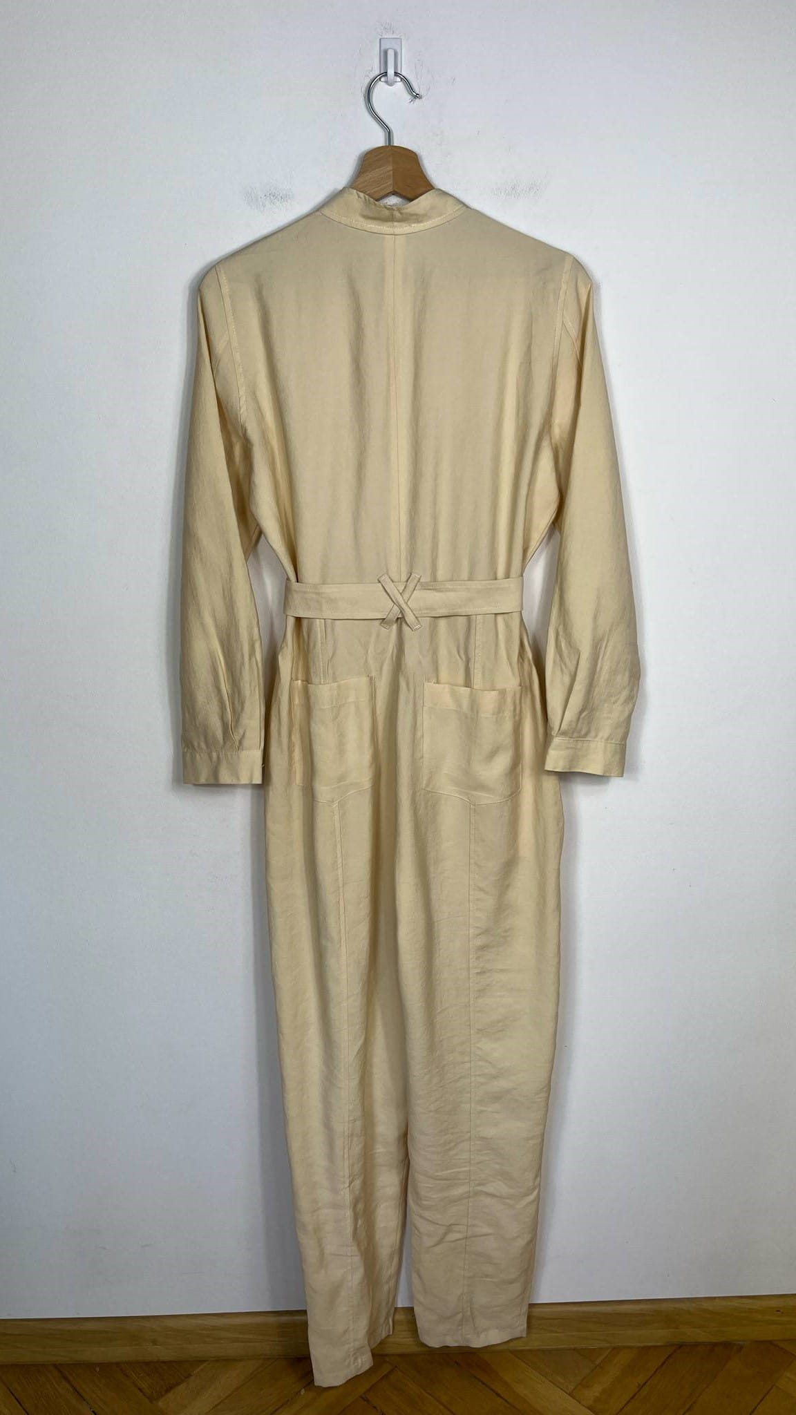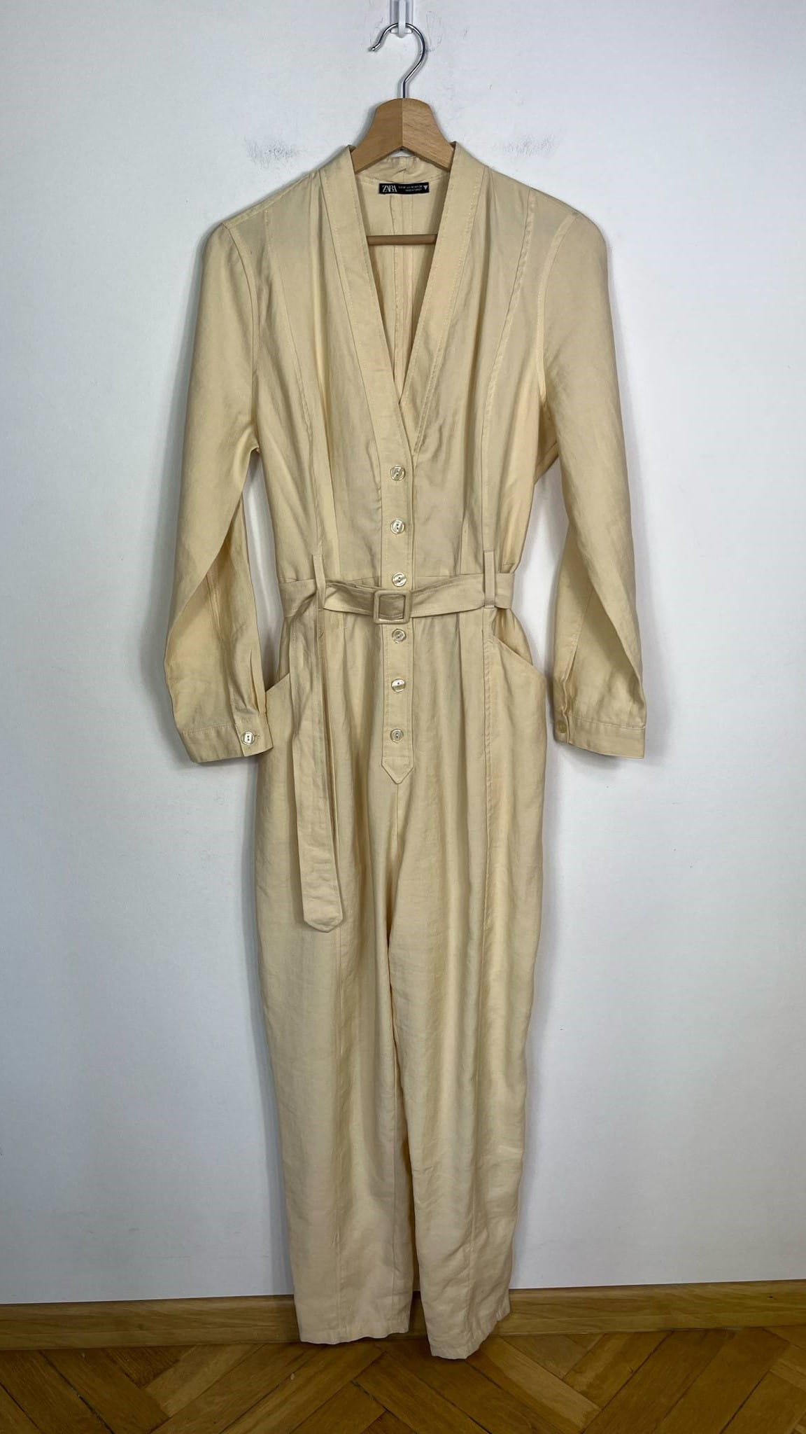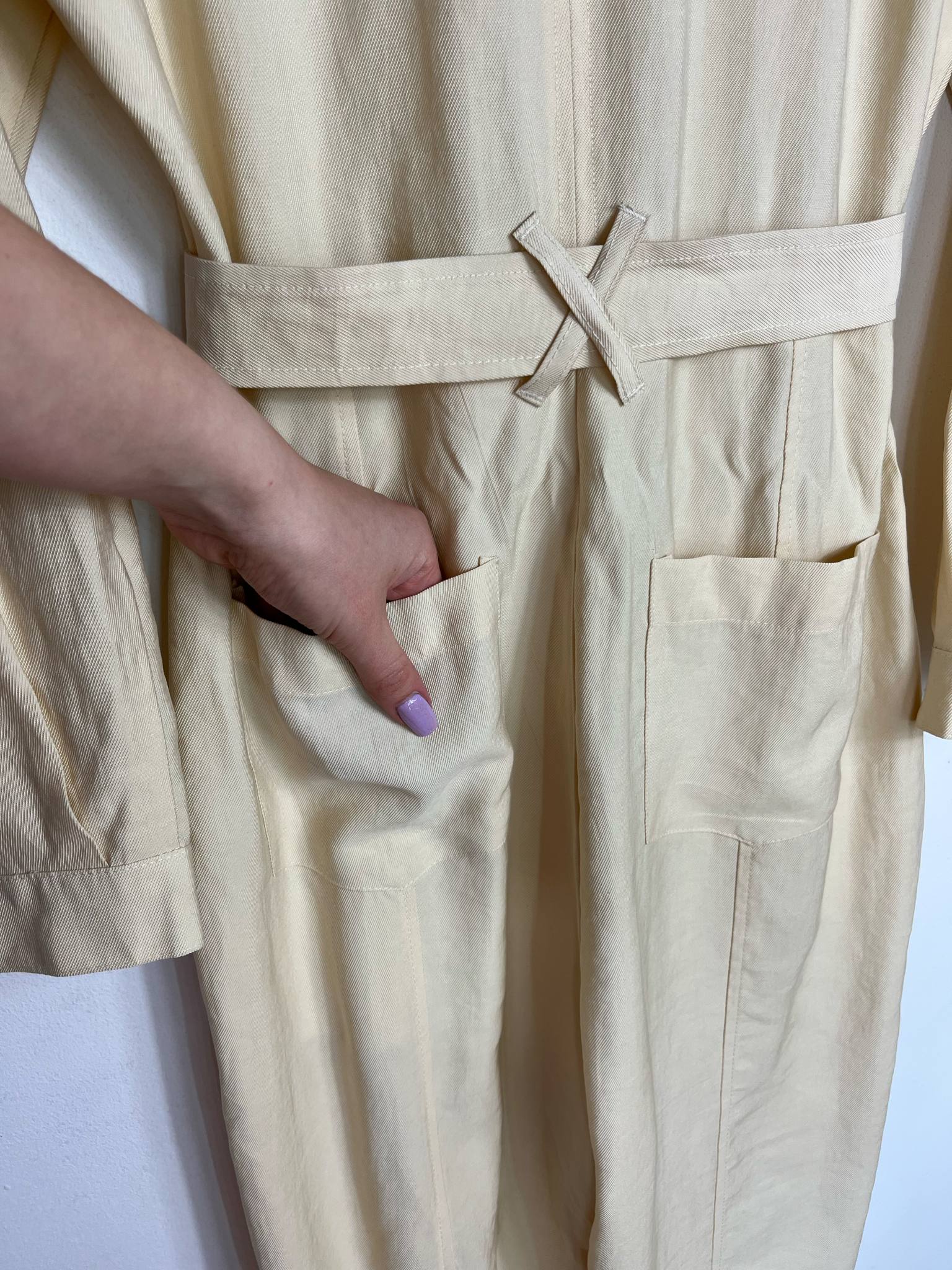 Kombinezon Zara rozmiar M. Kolor kremowo-masełkowy. Przyjemny, przewiewny materiał bawełna z wiskozą (wycięta metka wewnętrzna). Zapinany na guziki. W pasie ozdobny materiałowy pasek. Wymiary: długość 146 cm (góra 41 cm), pachy 51 cm, pas 40 cm. Stan idealny.