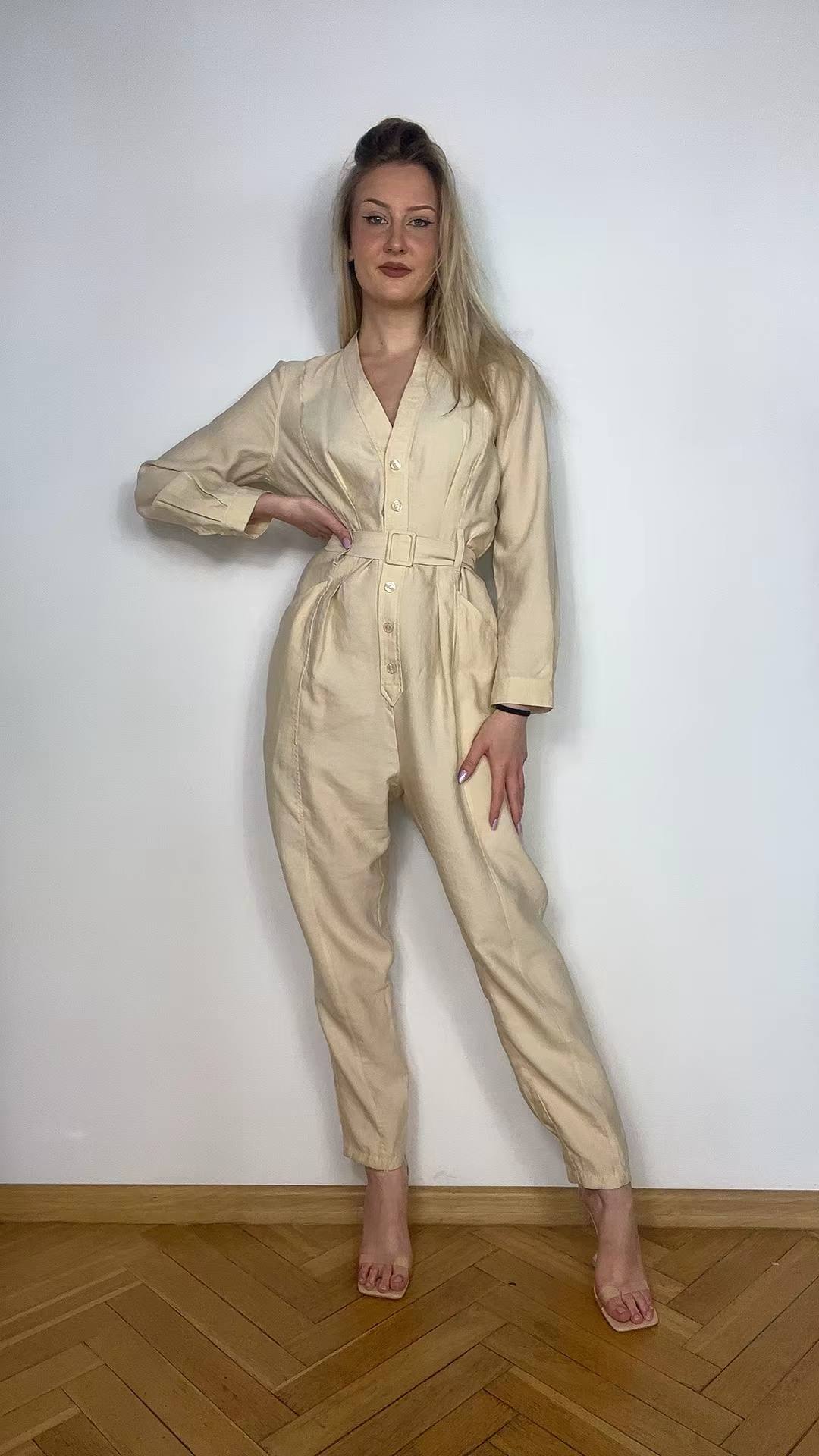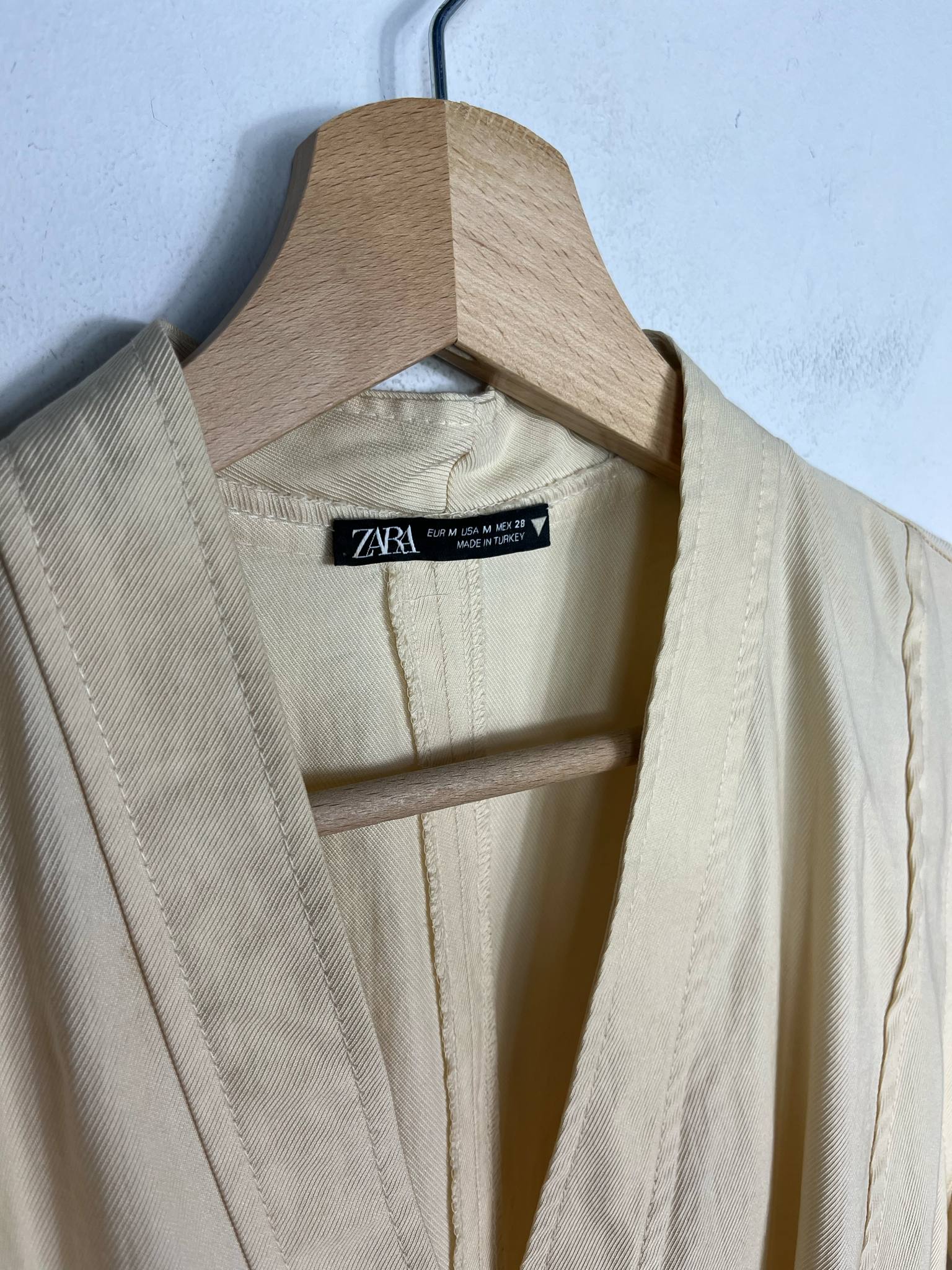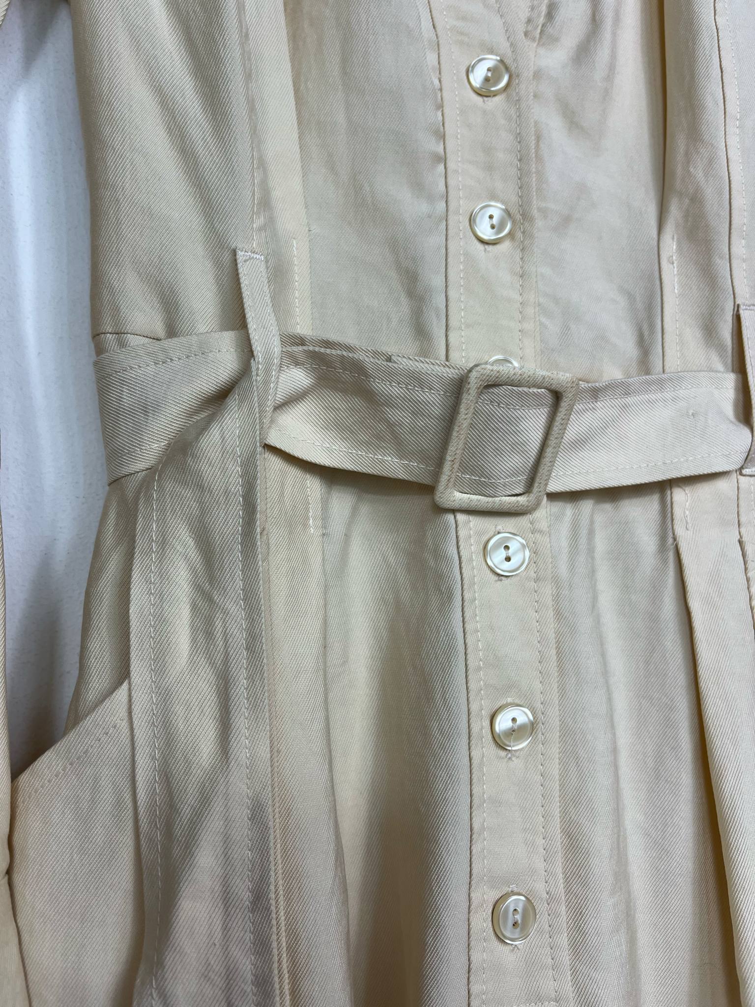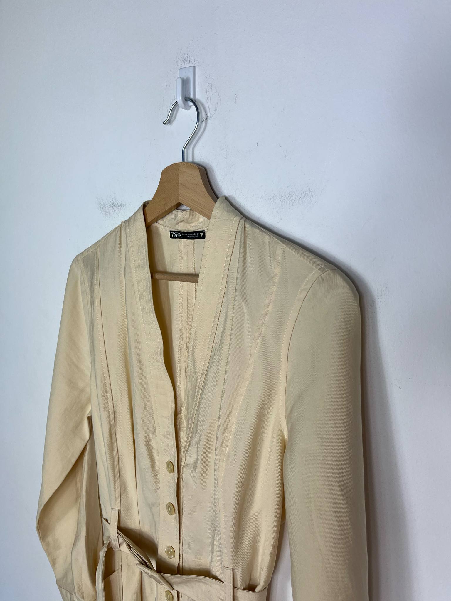 Kombinezon Zara rozmiar M. Kolor kremowo-masełkowy. Przyjemny, przewiewny materiał bawełna z wiskozą (wycięta metka wewnętrzna). Zapinany na guziki. W pasie ozdobny materiałowy pasek. Wymiary: długość 146 cm (góra 41 cm), pachy 51 cm, pas 40 cm. Stan idealny.