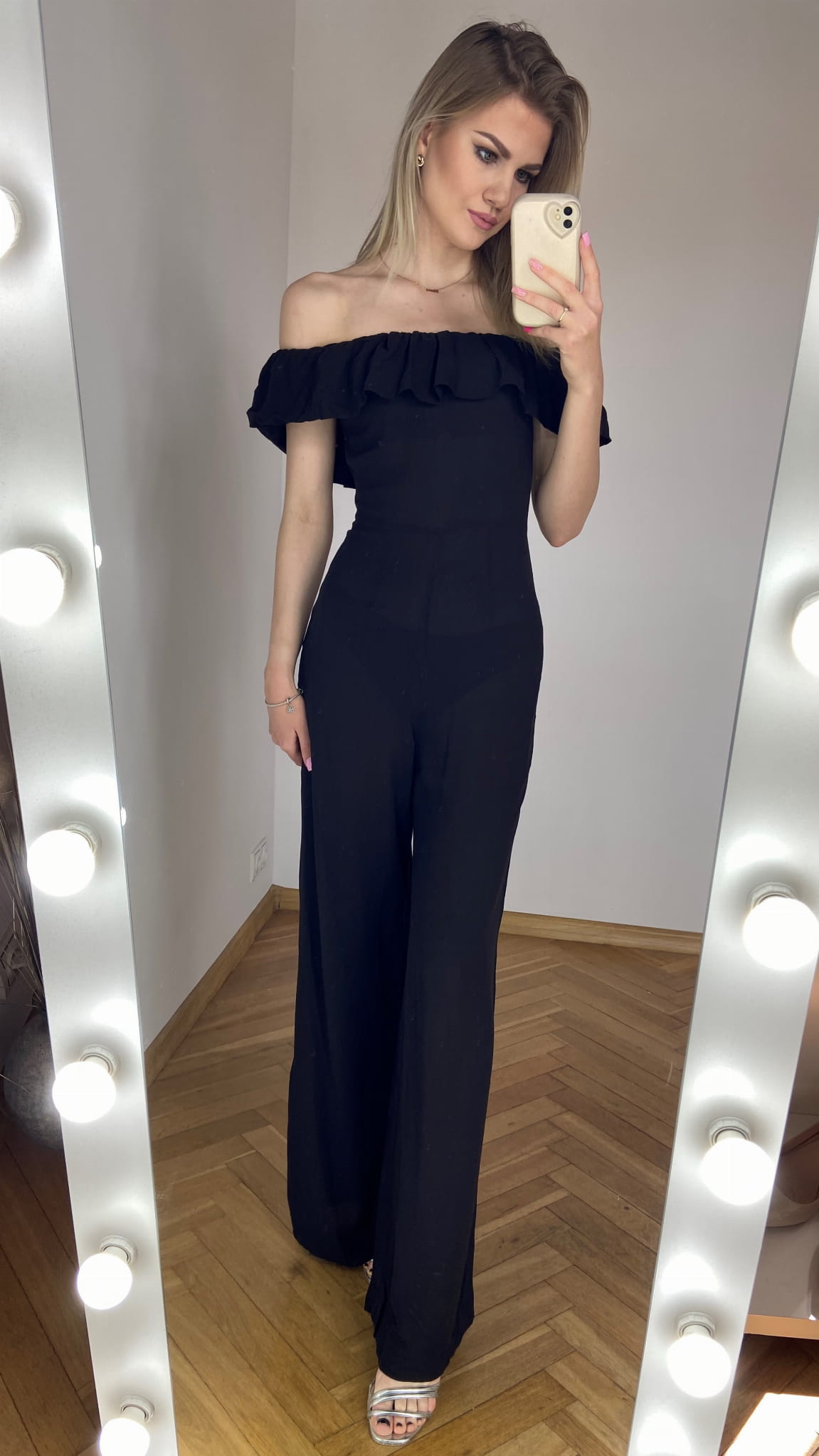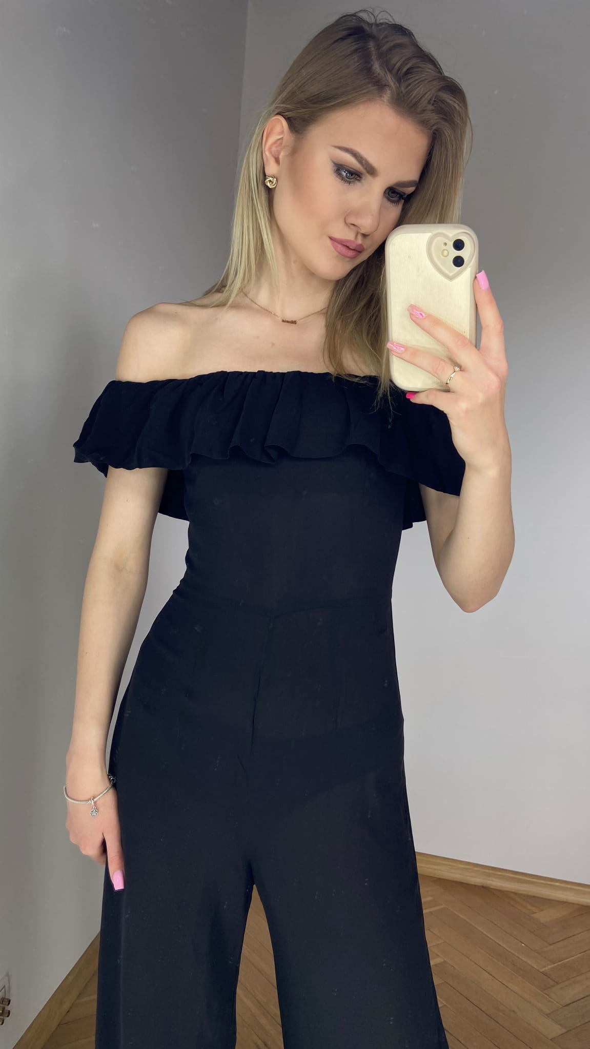 MARKA: H&M ROZMIAR: 34 KOLOR DOMINUJĄCY: czarny WZÓR: brak RĘKAW: hiszpanka DŁUGOŚĆ: długi SKŁAD MATERIAŁÓW: 100% wiskoza CECHY DODATKOWE: ukryty suwak na plecach, falbana na ramionach, szerokie nogawki WYMIARY: długość całkowita: 140 cm (do pasa 25 cm, od pasa w dół 115 cm) szerokość pachy: 32 do 38 cm pas: 33 cm STAN: nowy z metką WADY: brak