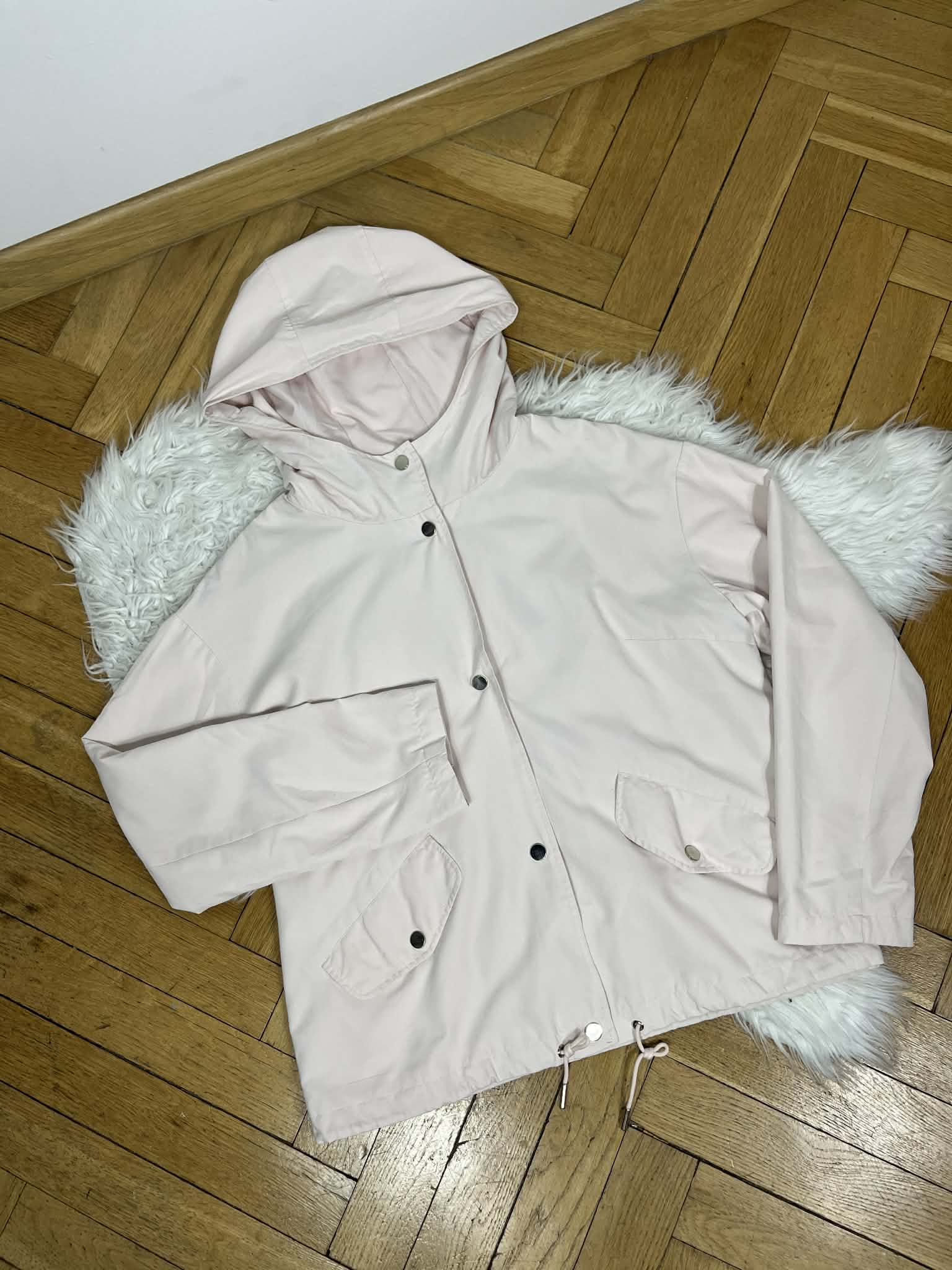 Kurtka wiatrówka z kapturem marki Vila w rozmiarze M. Kolor bardzo jasny pudrowy róż. Prosty, oversizowy krój. Posiada ściągacz na biodrach. Zapinana na zatrzaski. Wymiary: długość 60 cm, pachy 56 cm. Stan idealny.