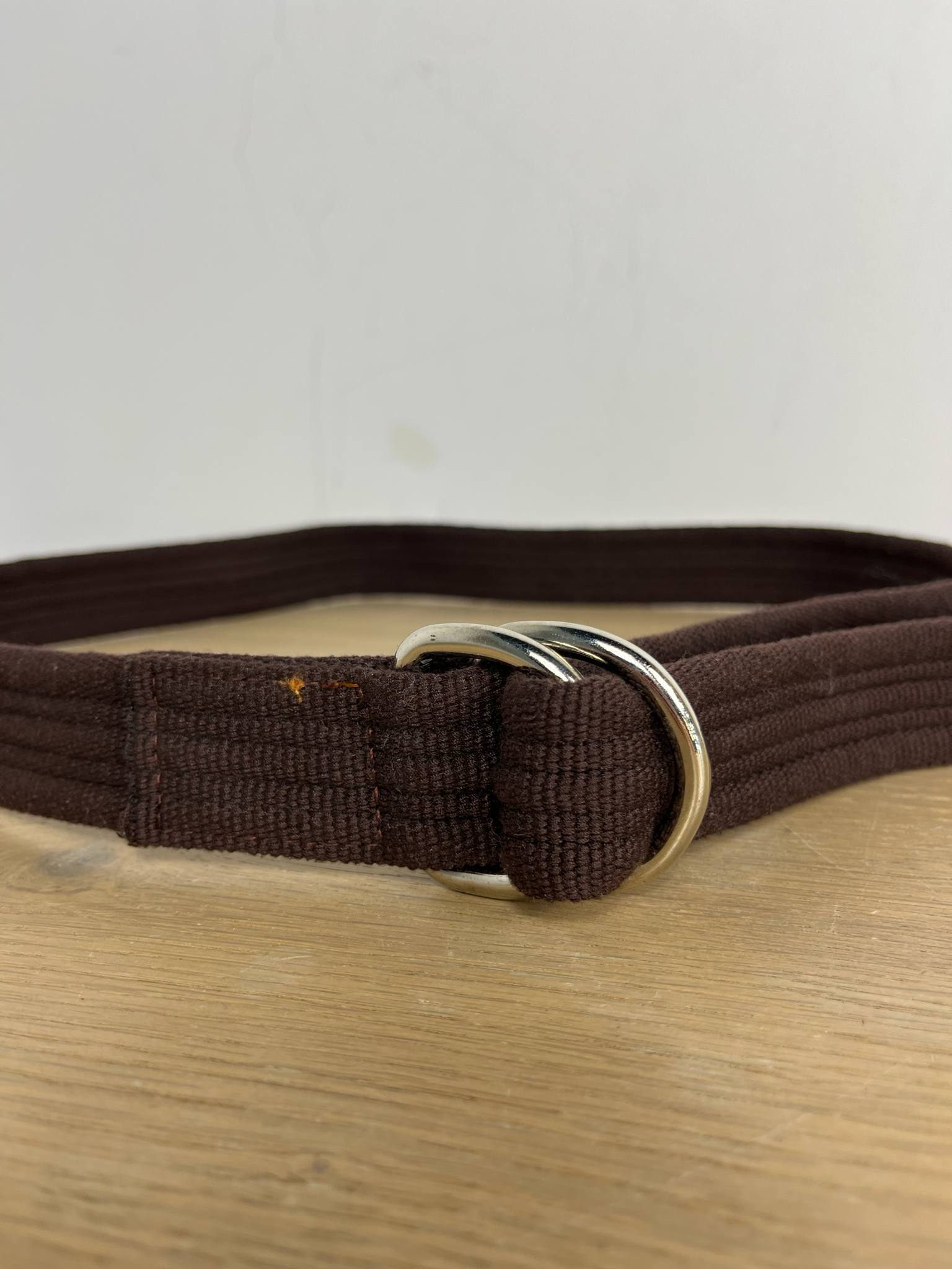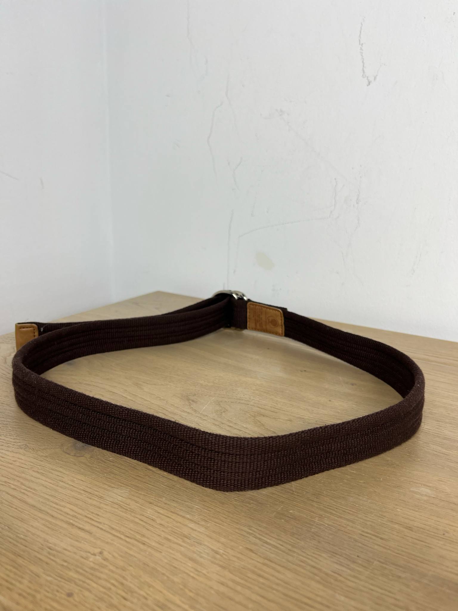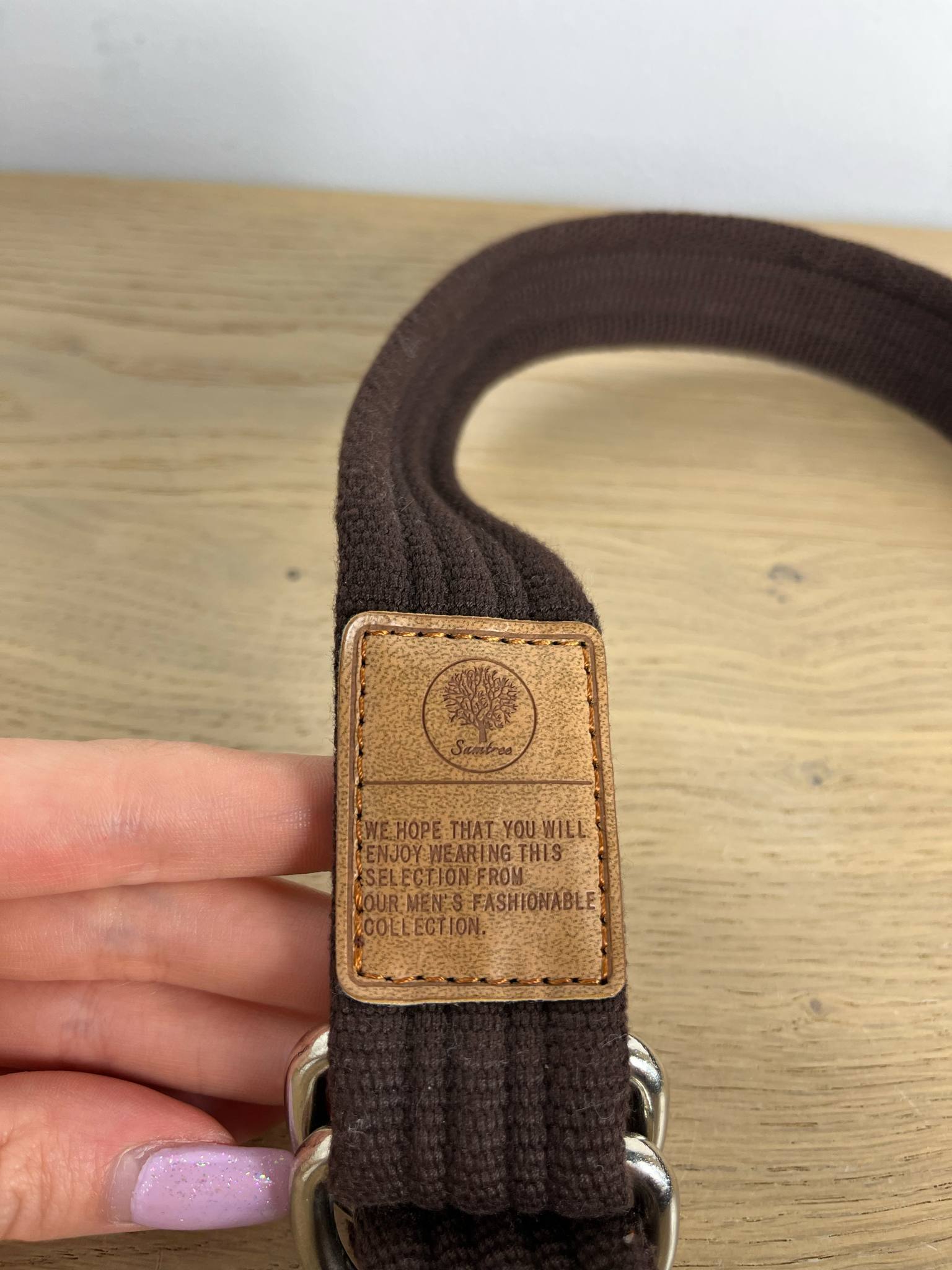 Brązowy materiałowy zaciskany pasek o długości 120 cm, szerokość 3,5 cm. Srebrna klamra. Stan idealny.