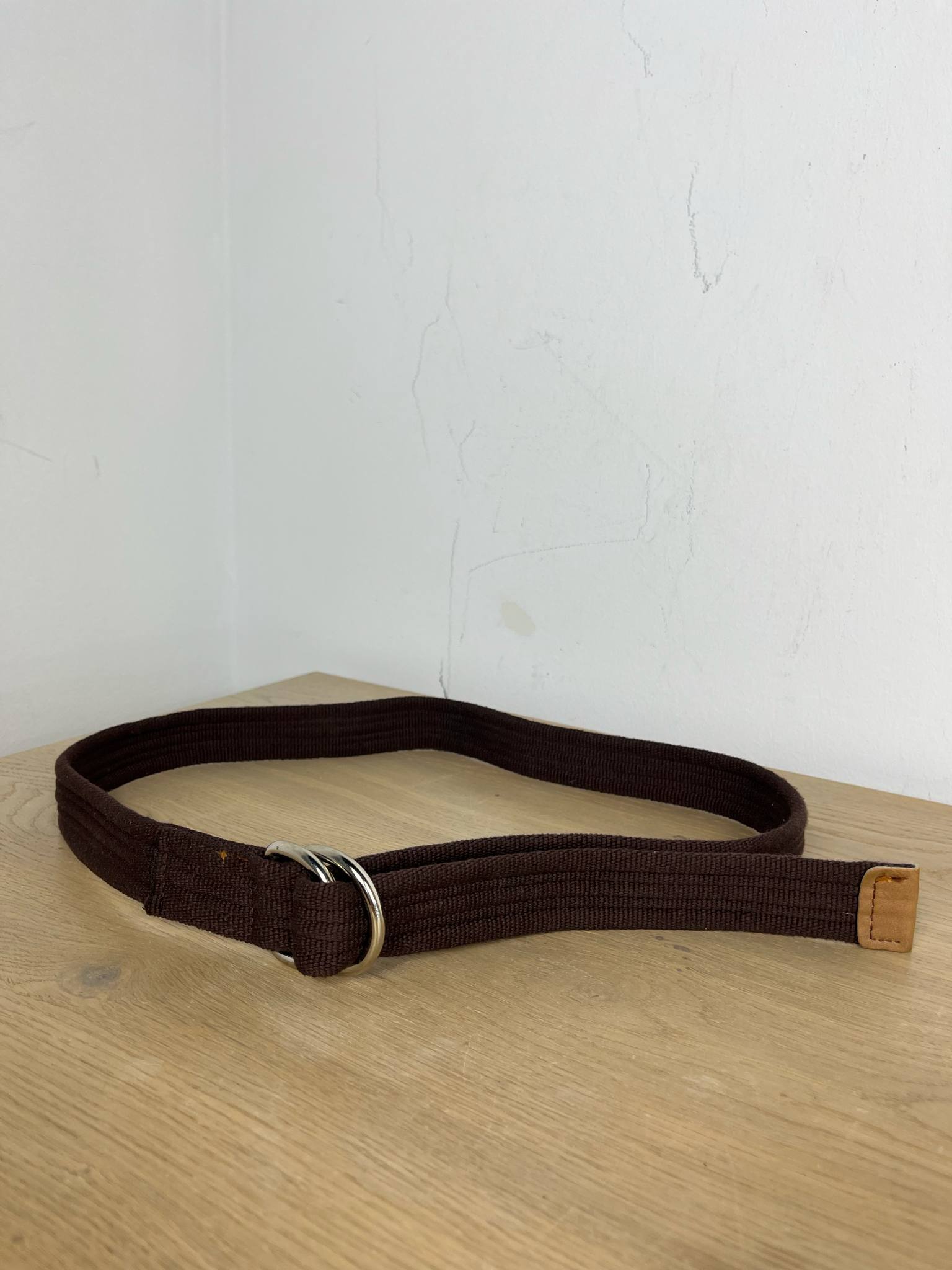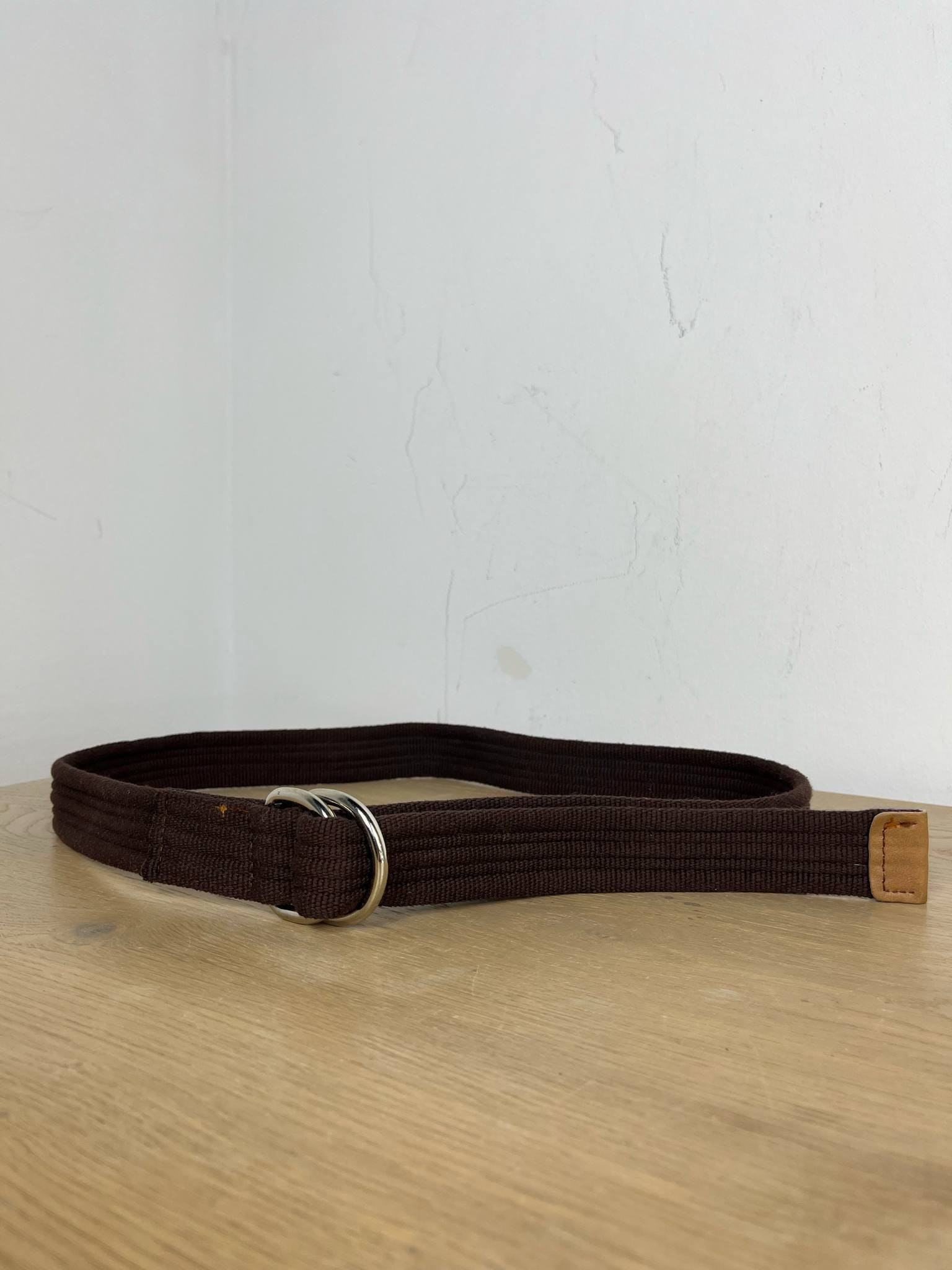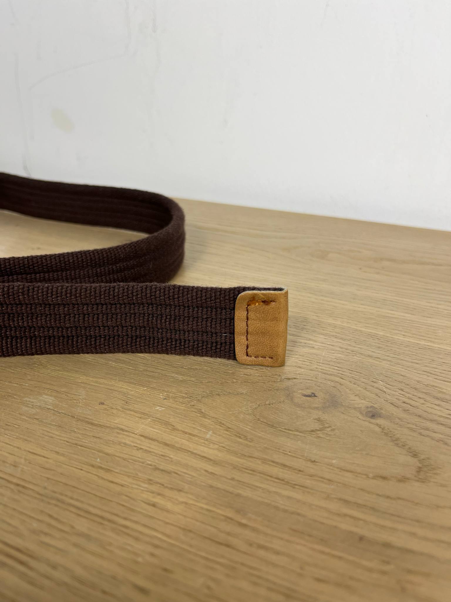 Brązowy materiałowy zaciskany pasek o długości 120 cm, szerokość 3,5 cm. Srebrna klamra. Stan idealny.