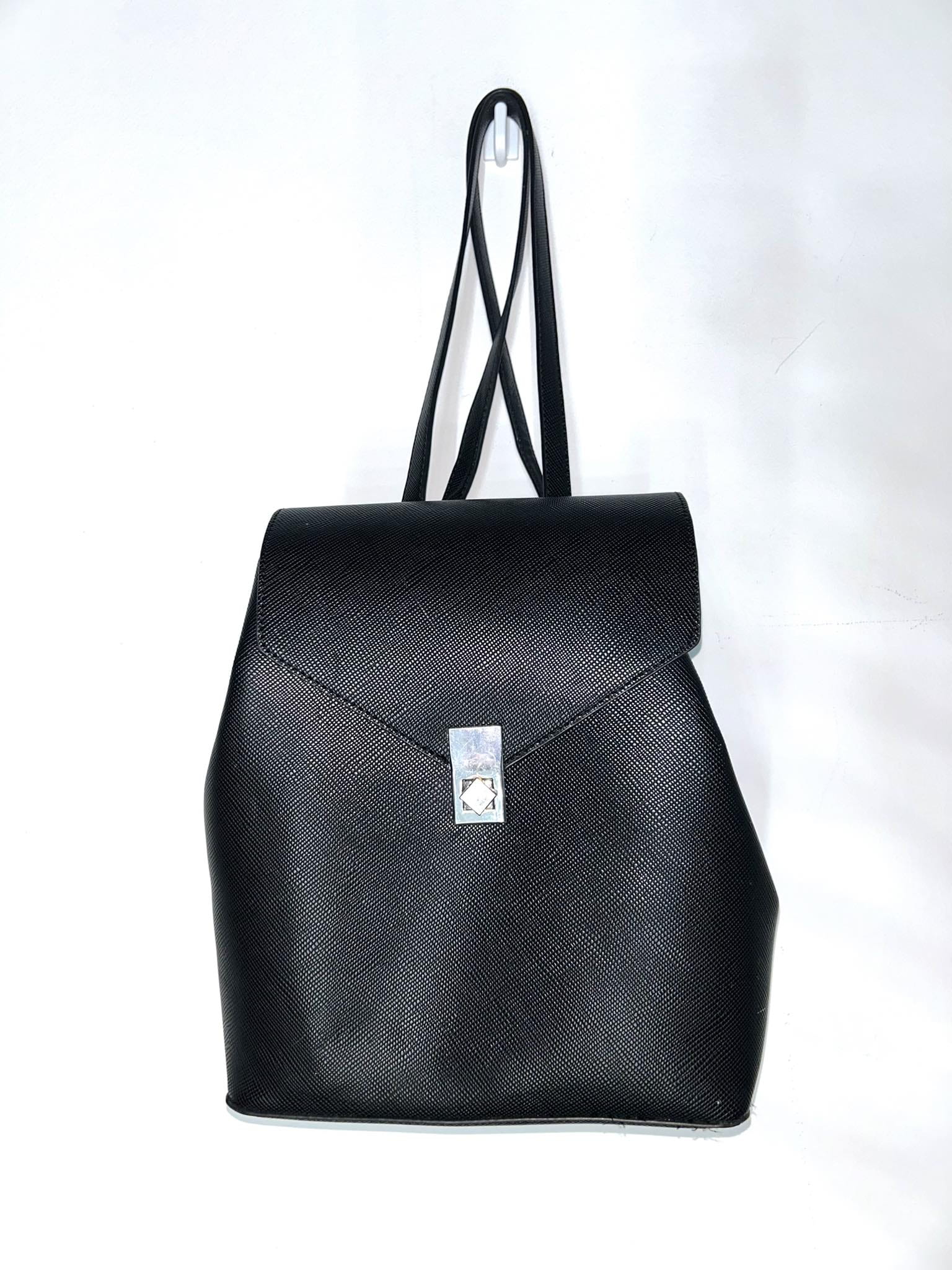 Czarny plecak z sztywnej skóry ekologicznej. Bardzo pojemny. Idealny do codziennych stylizacji. Wymiary wysokość 32 cm, szerokość 21/27 cm, dno 15 cm, regulowane paski 73/83 cm. Stan idealny (ryski na metalu)