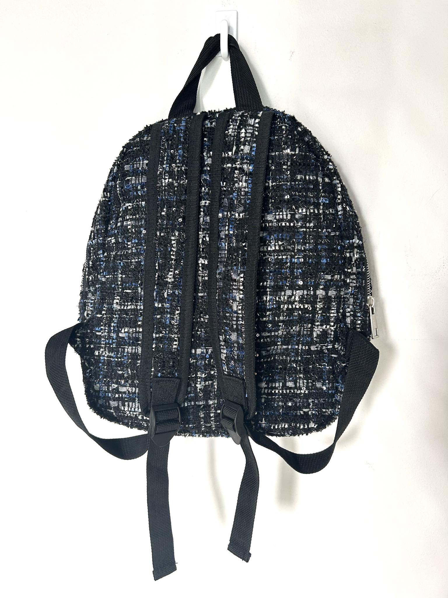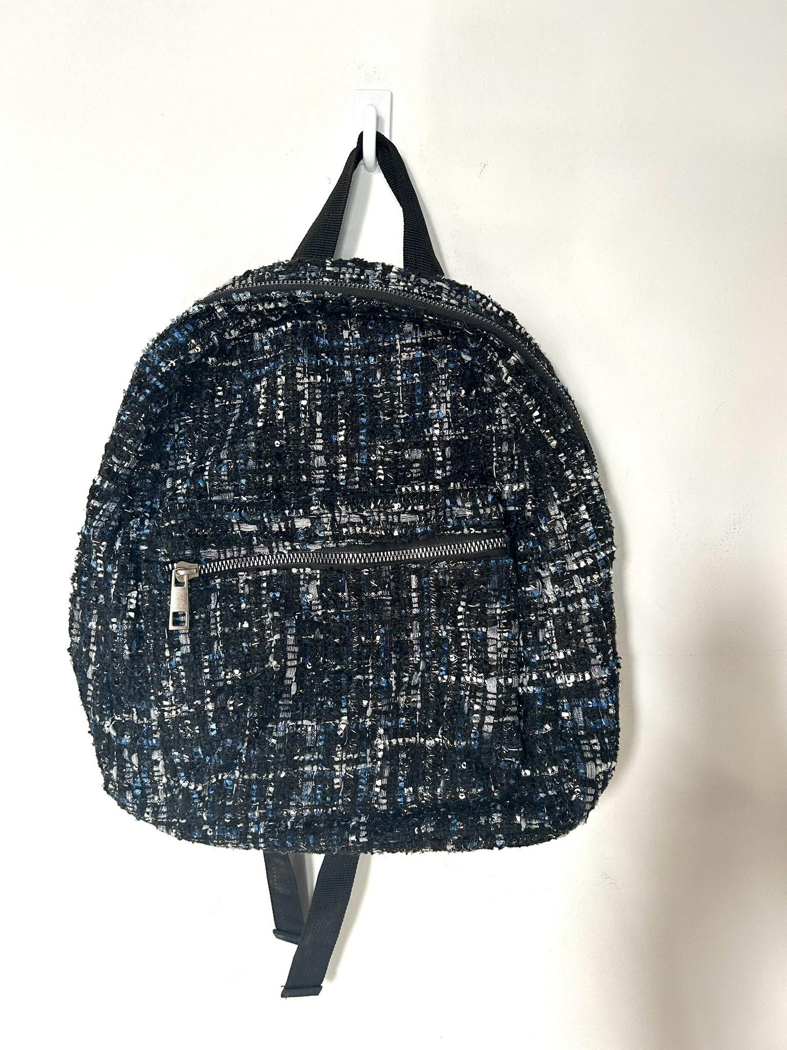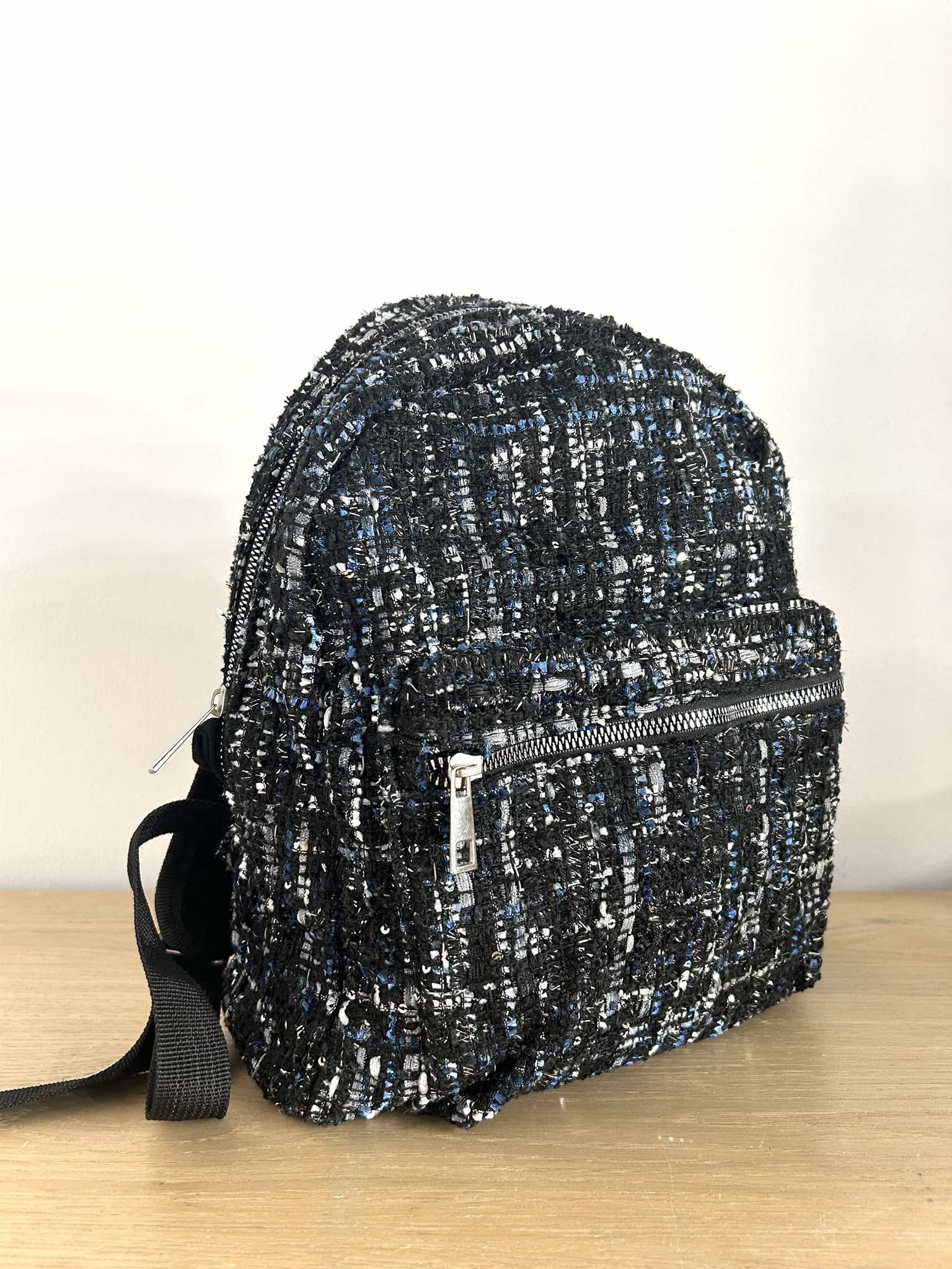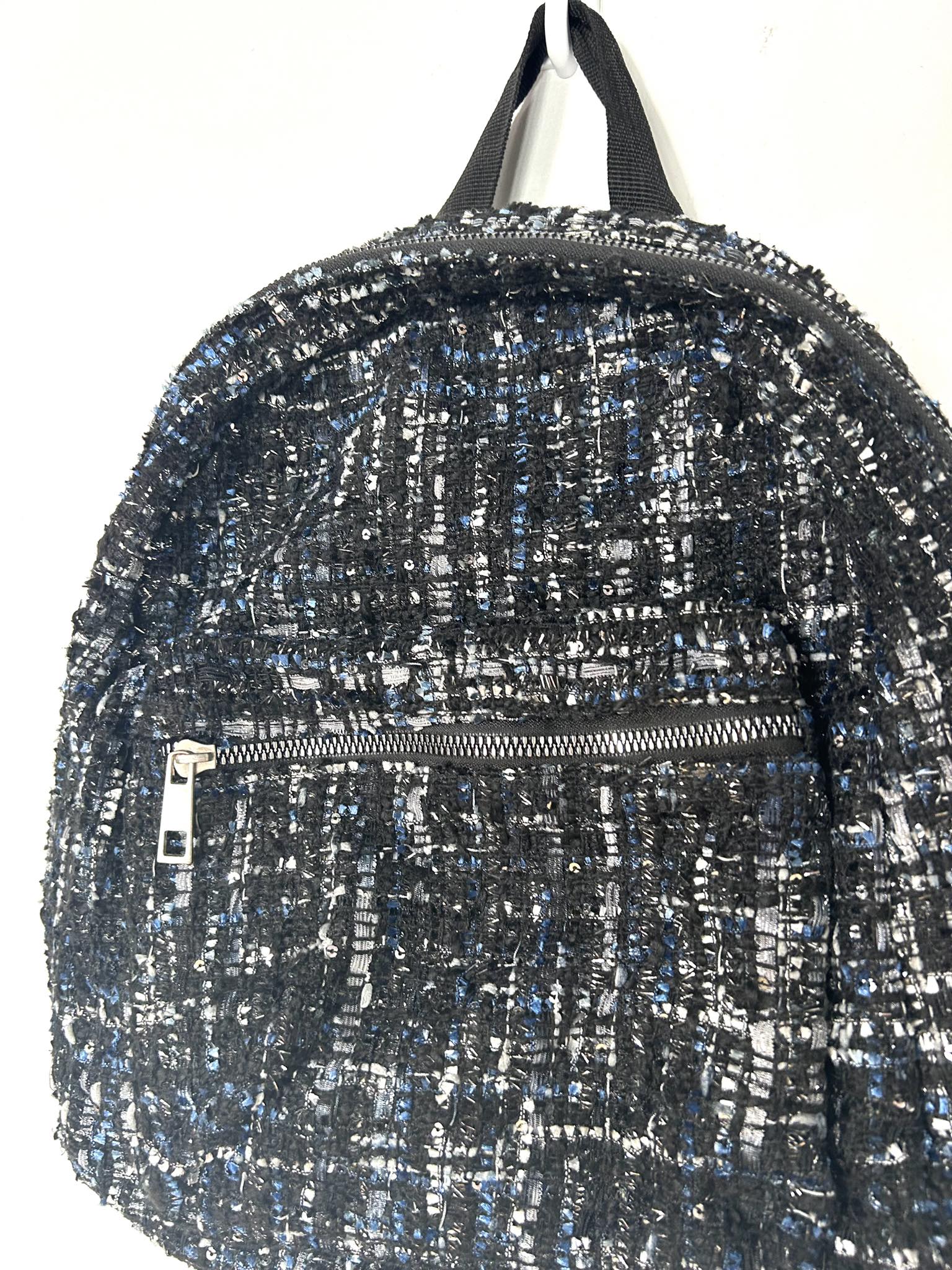 Plecaczek materiałowy. Materiał o grubszej lekko dzianinowej strukturze. Kolor czarno-granatowo-biały ze srebrna nitką. Bardzo pakowny. Jednokomorowy. Zapinany na suwak. Regulacja pasków. Wymiary wysokość 34 cm, szerokość 32 cm, dno 10 cm. Stan idealny.