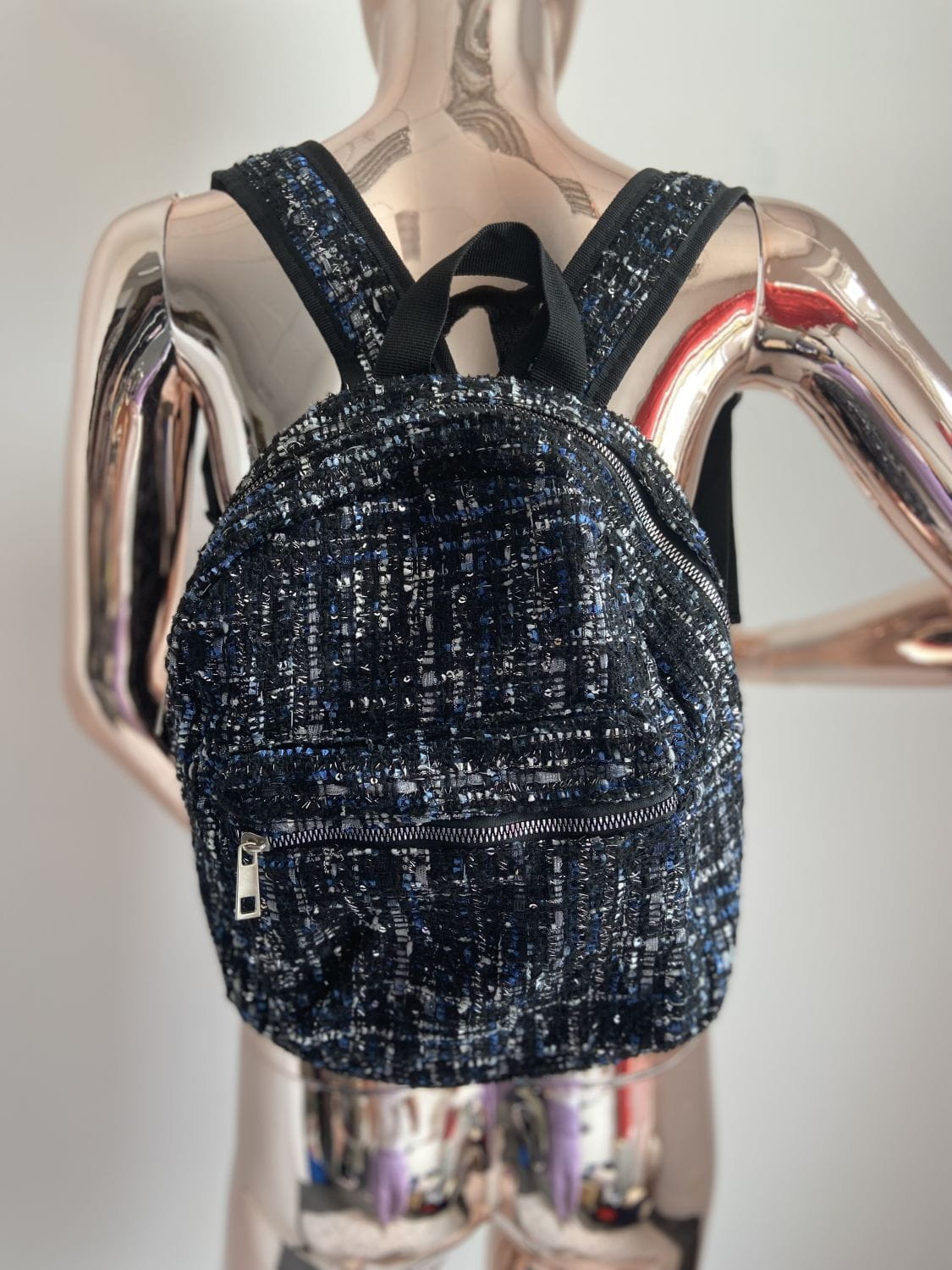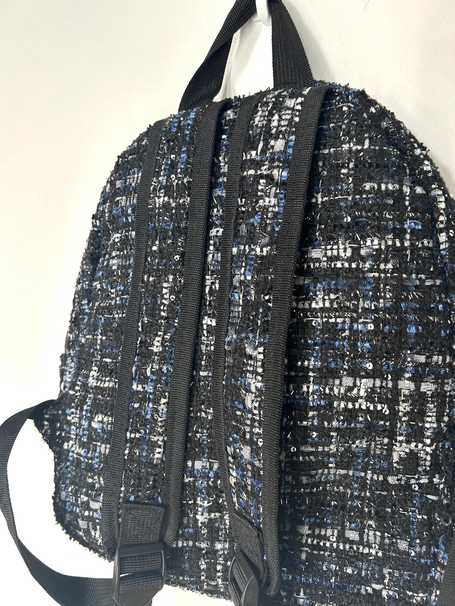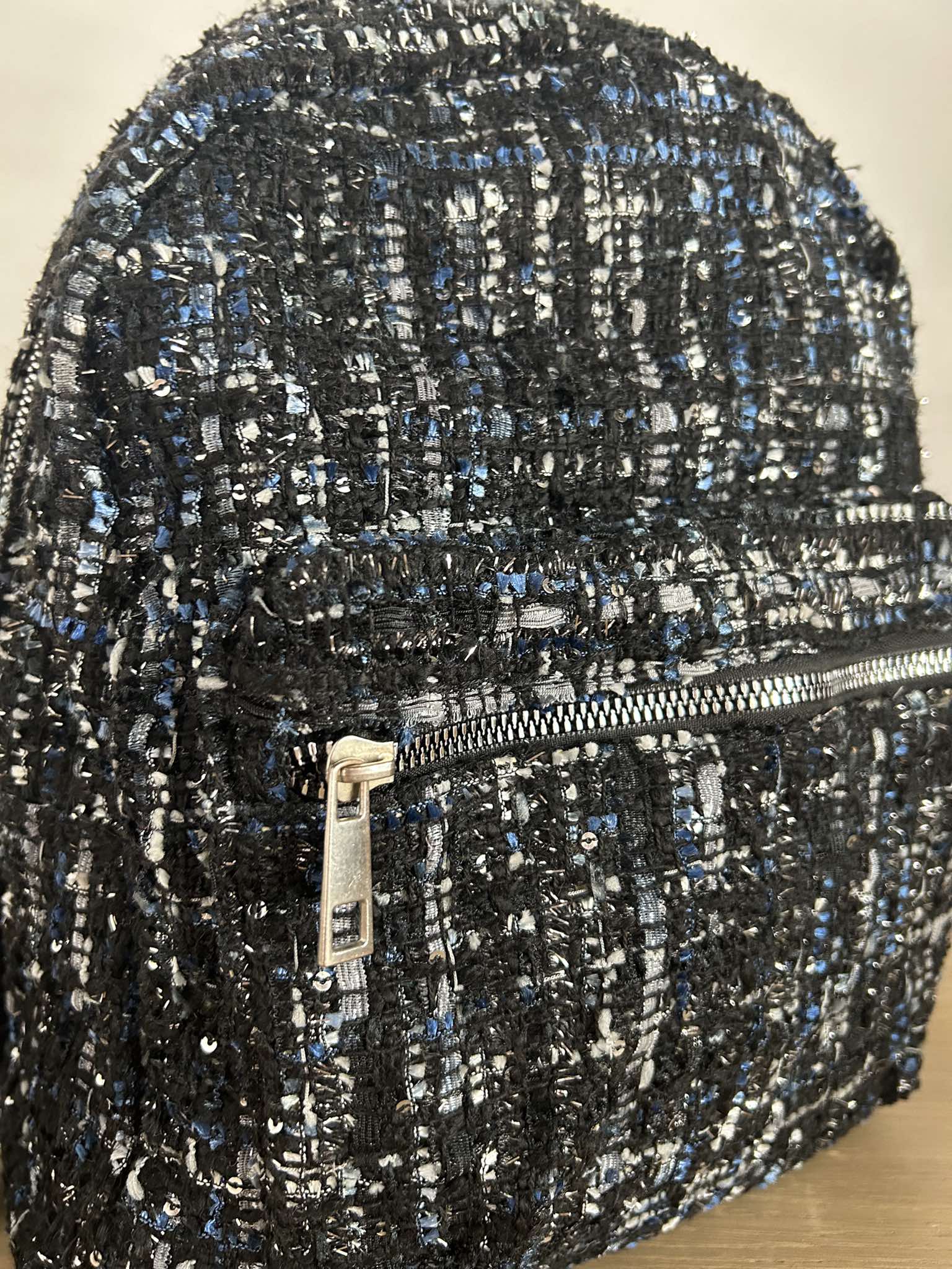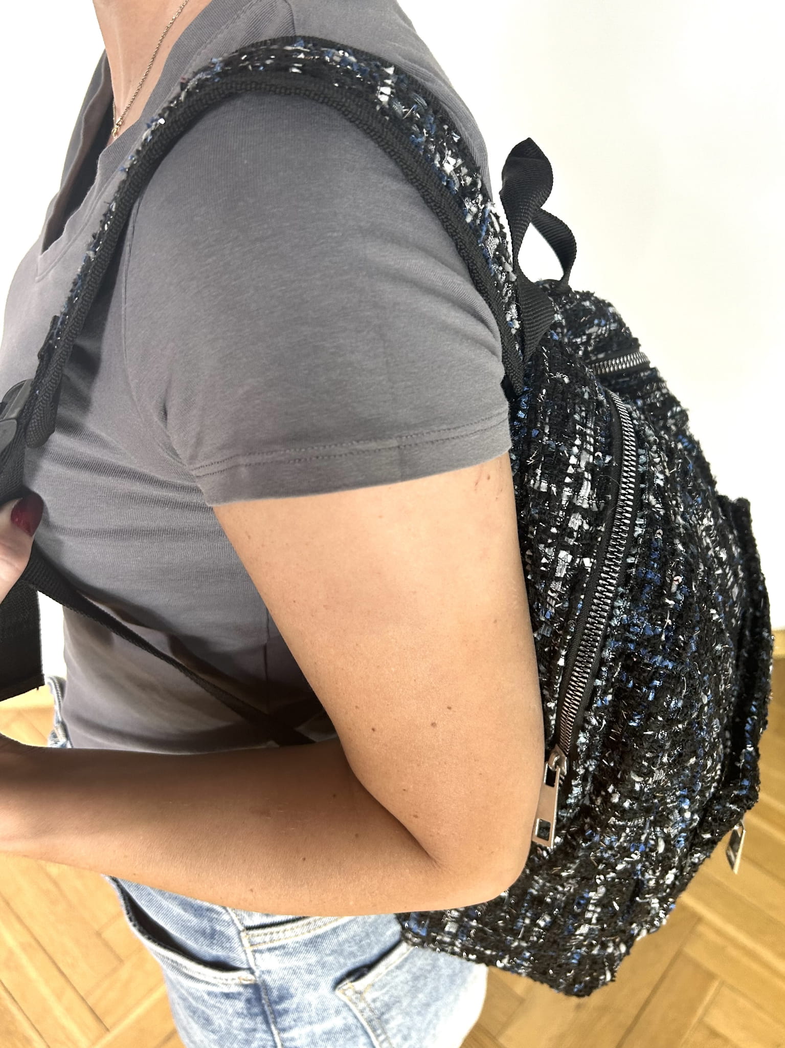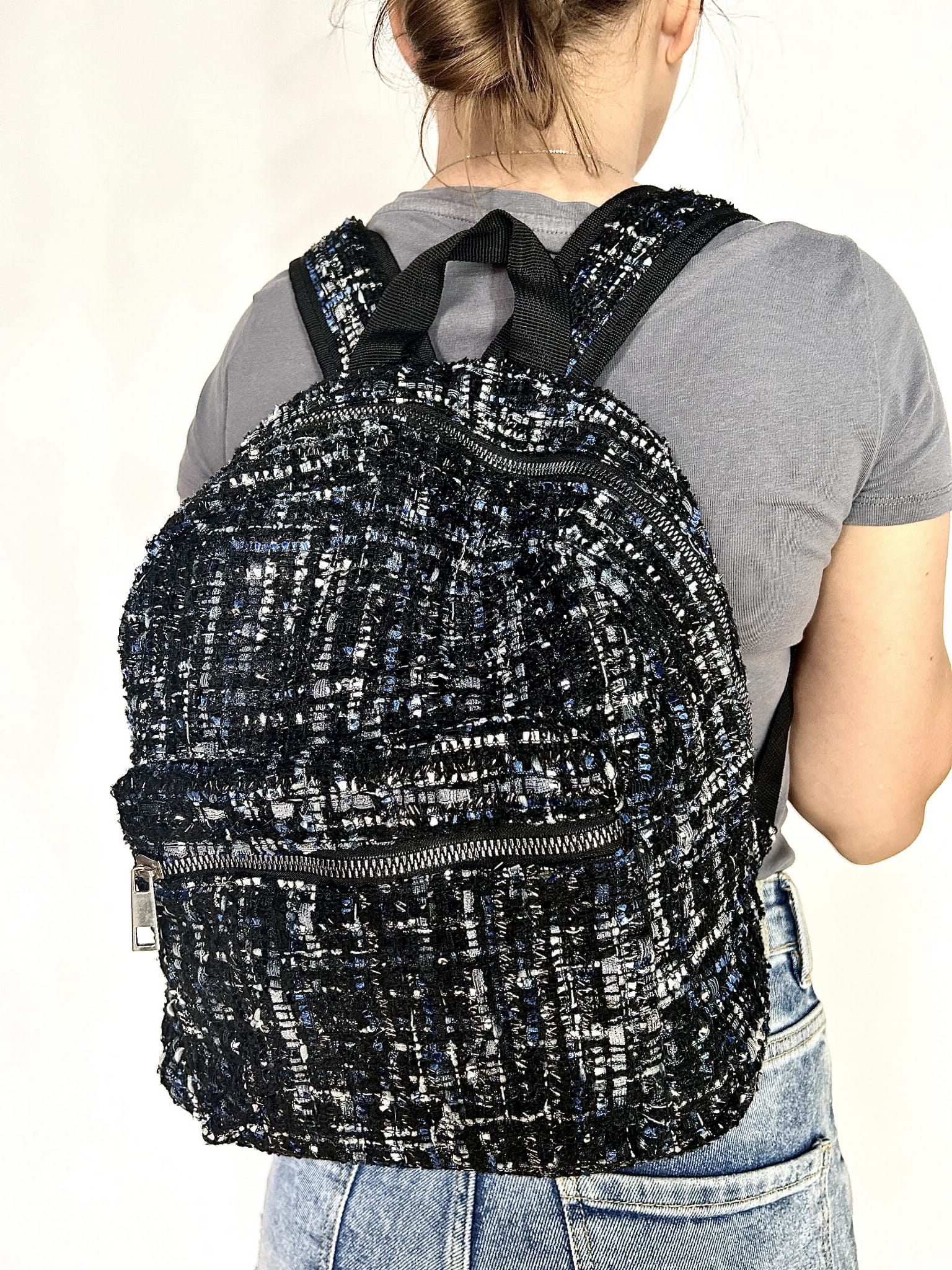 Plecaczek materiałowy. Materiał o grubszej lekko dzianinowej strukturze. Kolor czarno-granatowo-biały ze srebrna nitką. Bardzo pakowny. Jednokomorowy. Zapinany na suwak. Regulacja pasków. Wymiary wysokość 34 cm, szerokość 32 cm, dno 10 cm. Stan idealny.