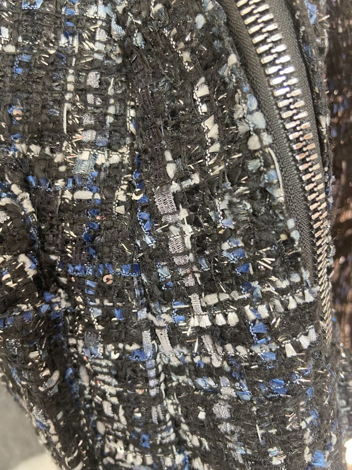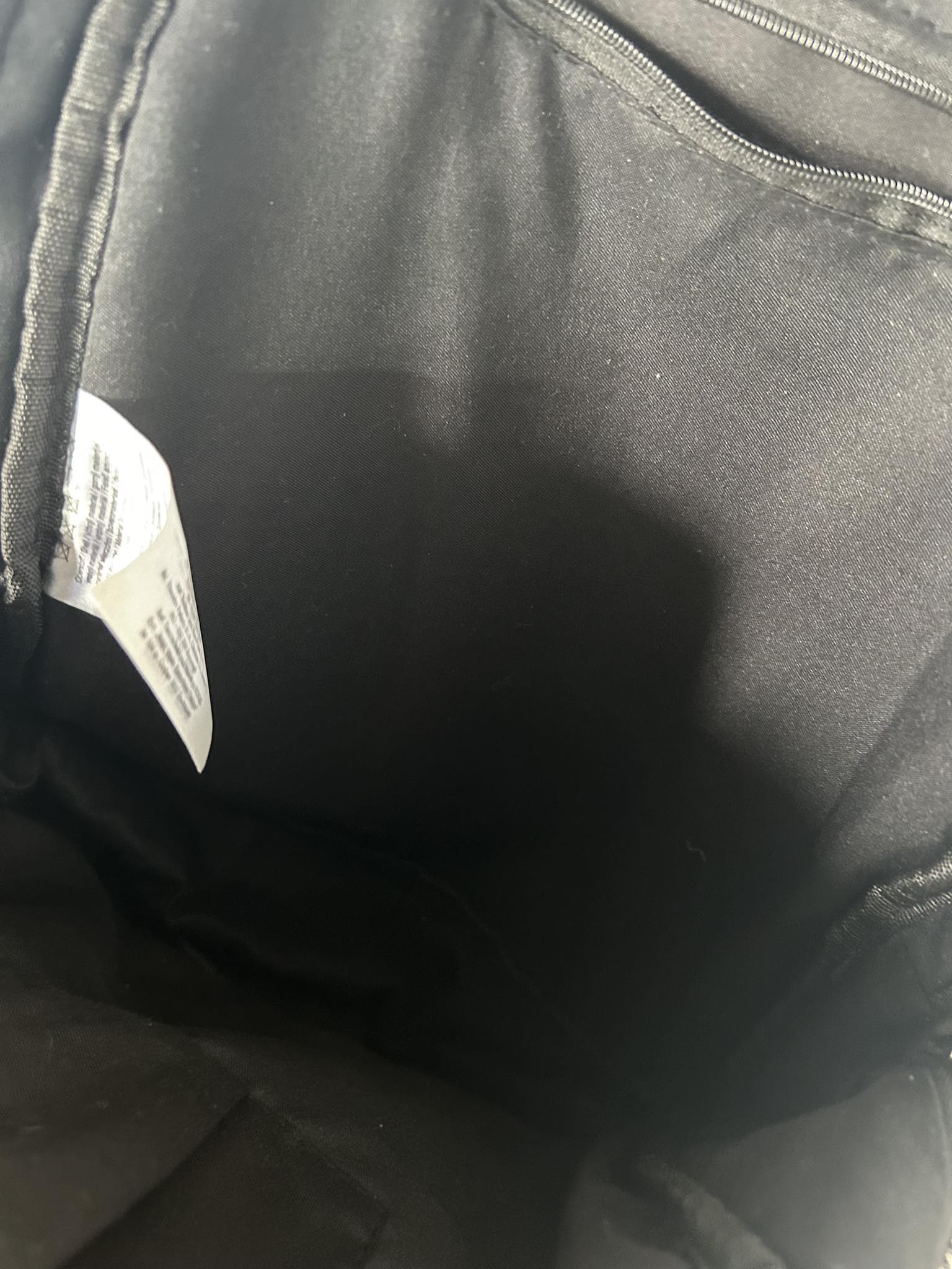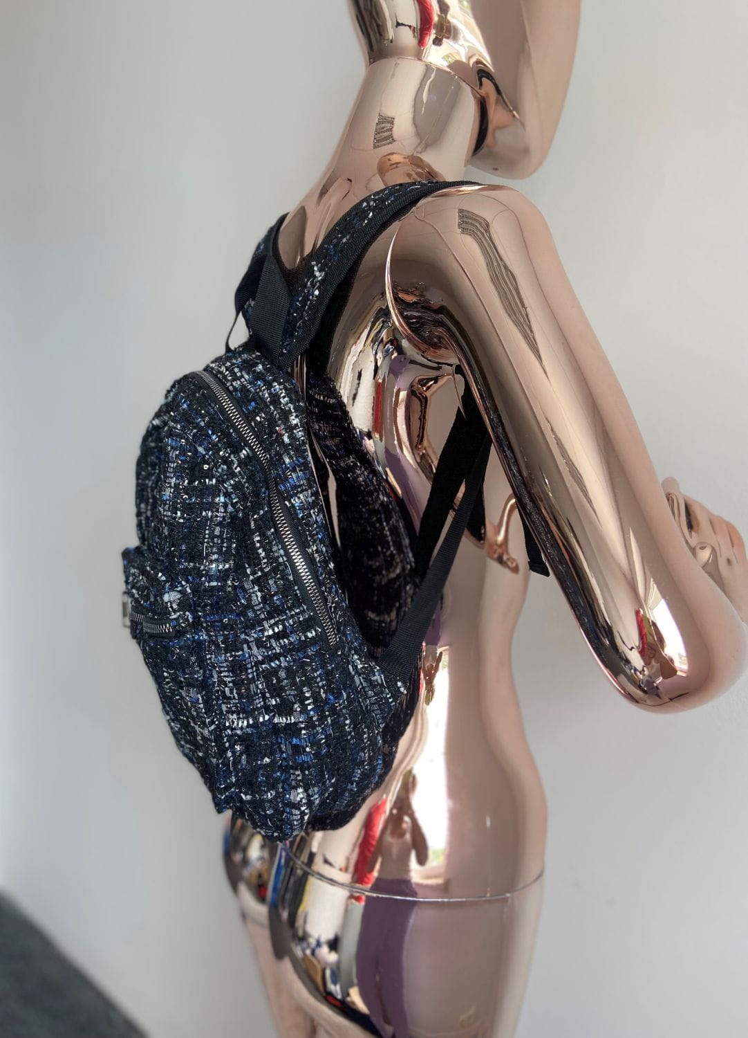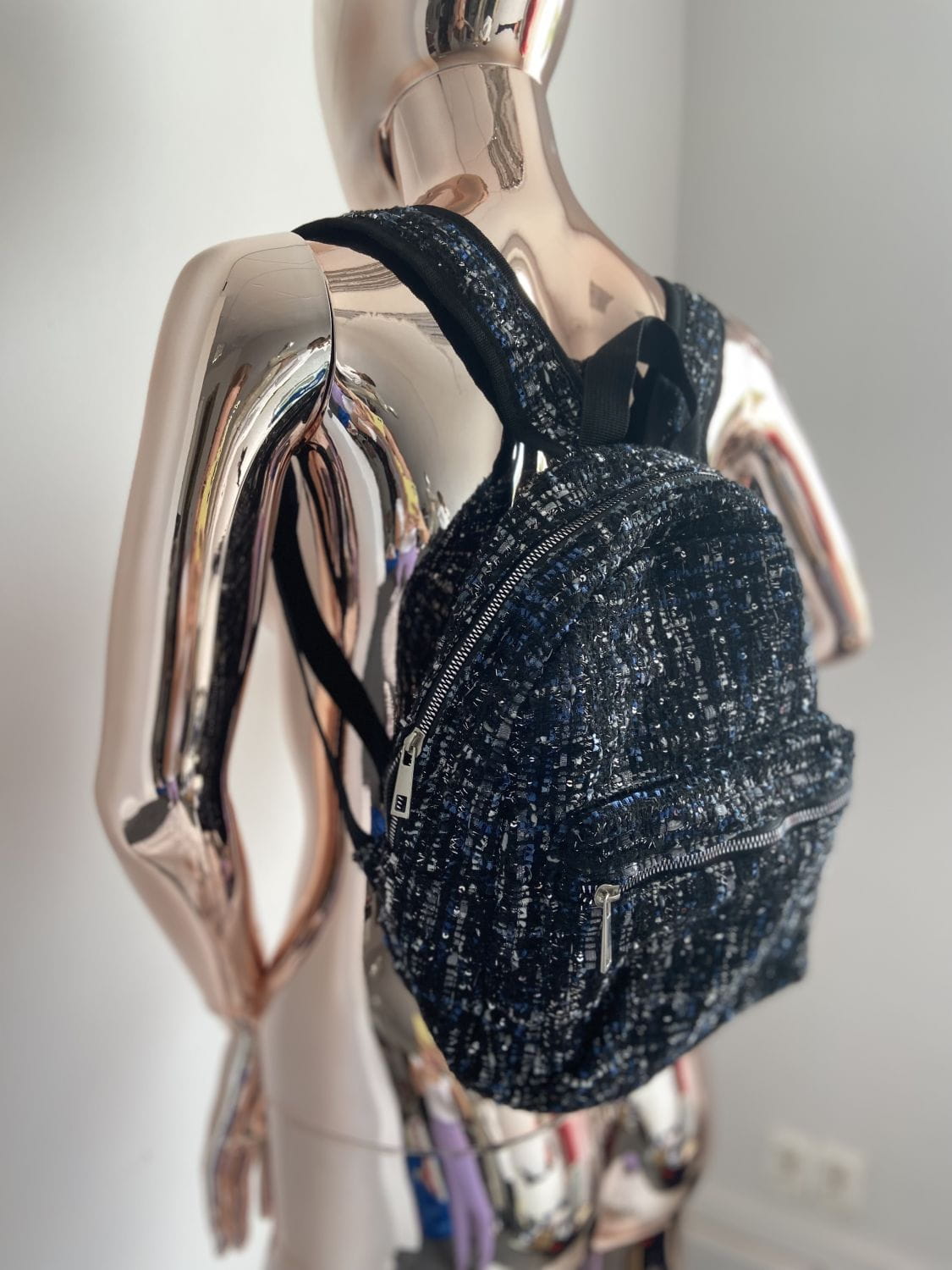 Plecaczek materiałowy. Materiał o grubszej lekko dzianinowej strukturze. Kolor czarno-granatowo-biały ze srebrna nitką. Bardzo pakowny. Jednokomorowy. Zapinany na suwak. Regulacja pasków. Wymiary wysokość 34 cm, szerokość 32 cm, dno 10 cm. Stan idealny.