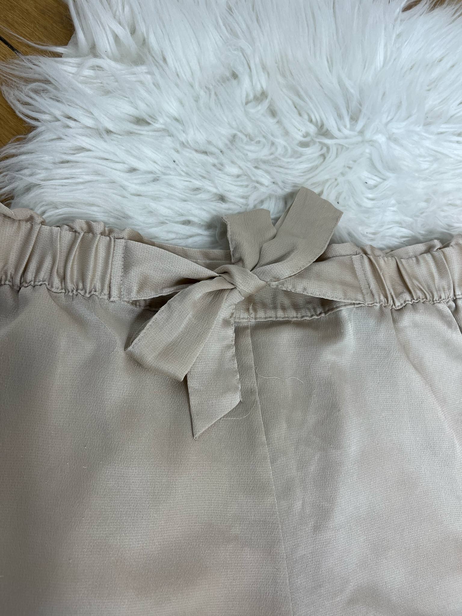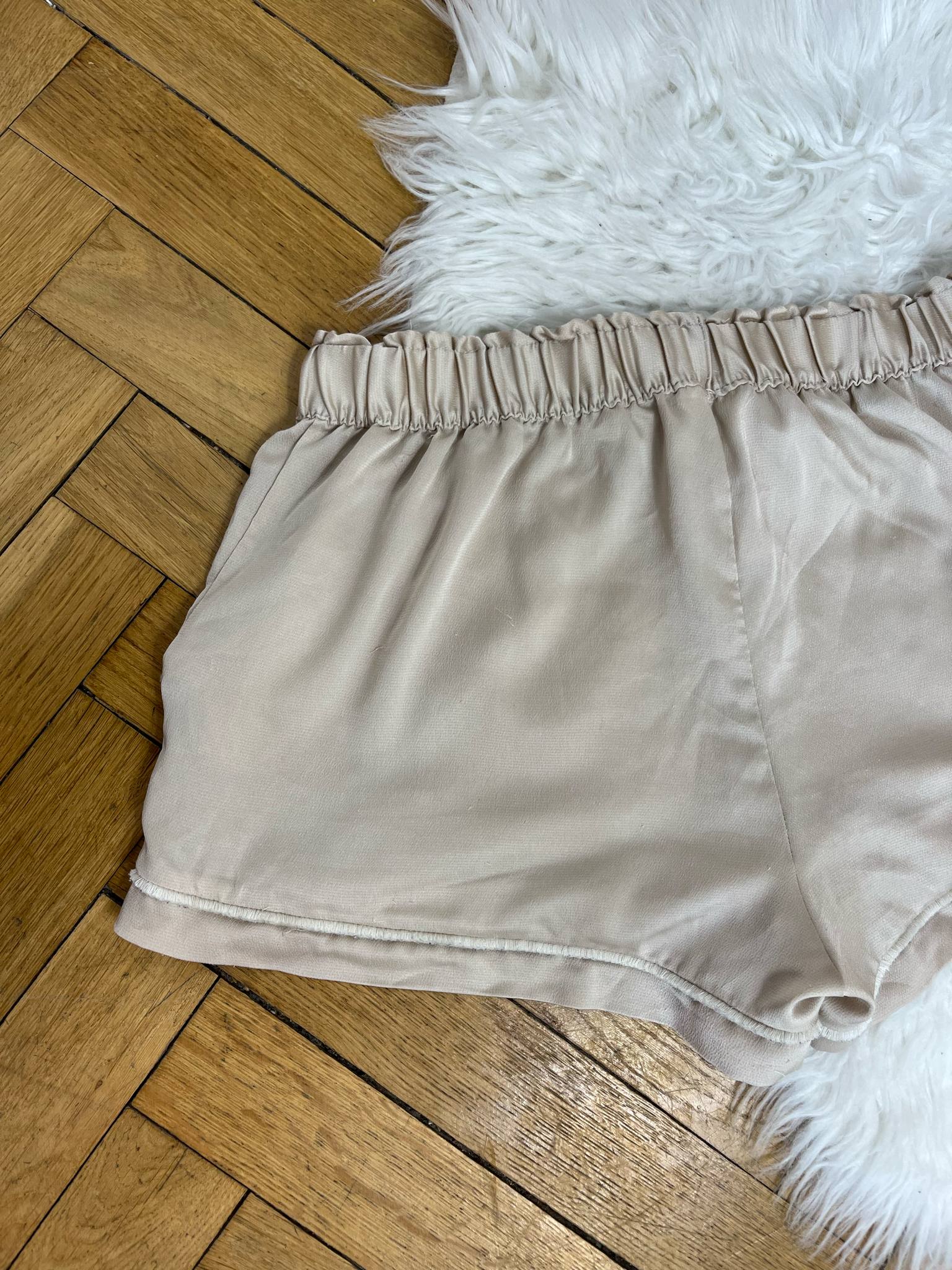 Satynowe spodenki rozmiar M/L. Kolor beżowy. W pasie gumka i wiązanie. Kieszenie. Wymiary: długość 35 cm, pas 40-50 cm, krok przód 29 cm, szerokość nogawki 34 cm. Stan dobry - zmechacenia, nitki.