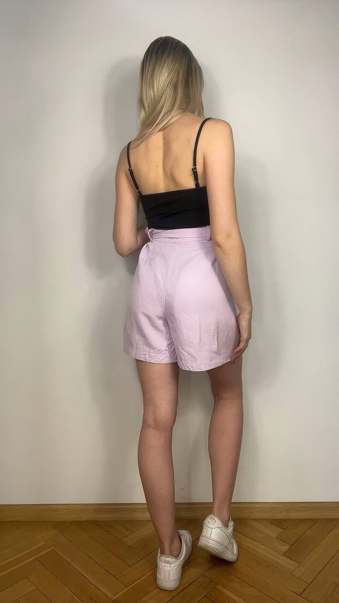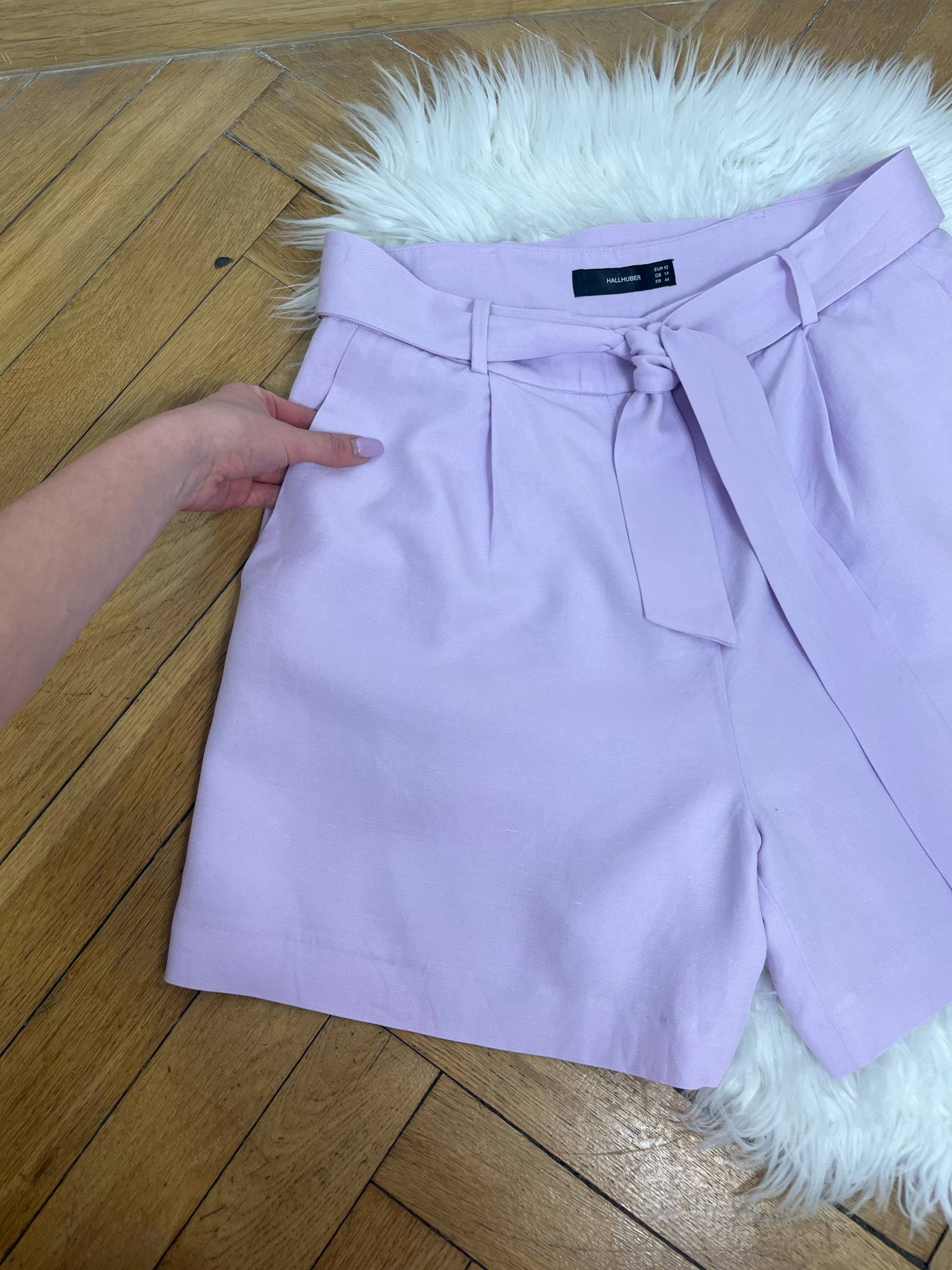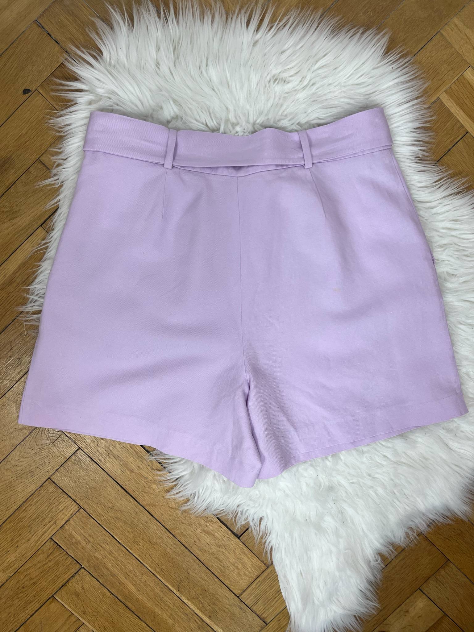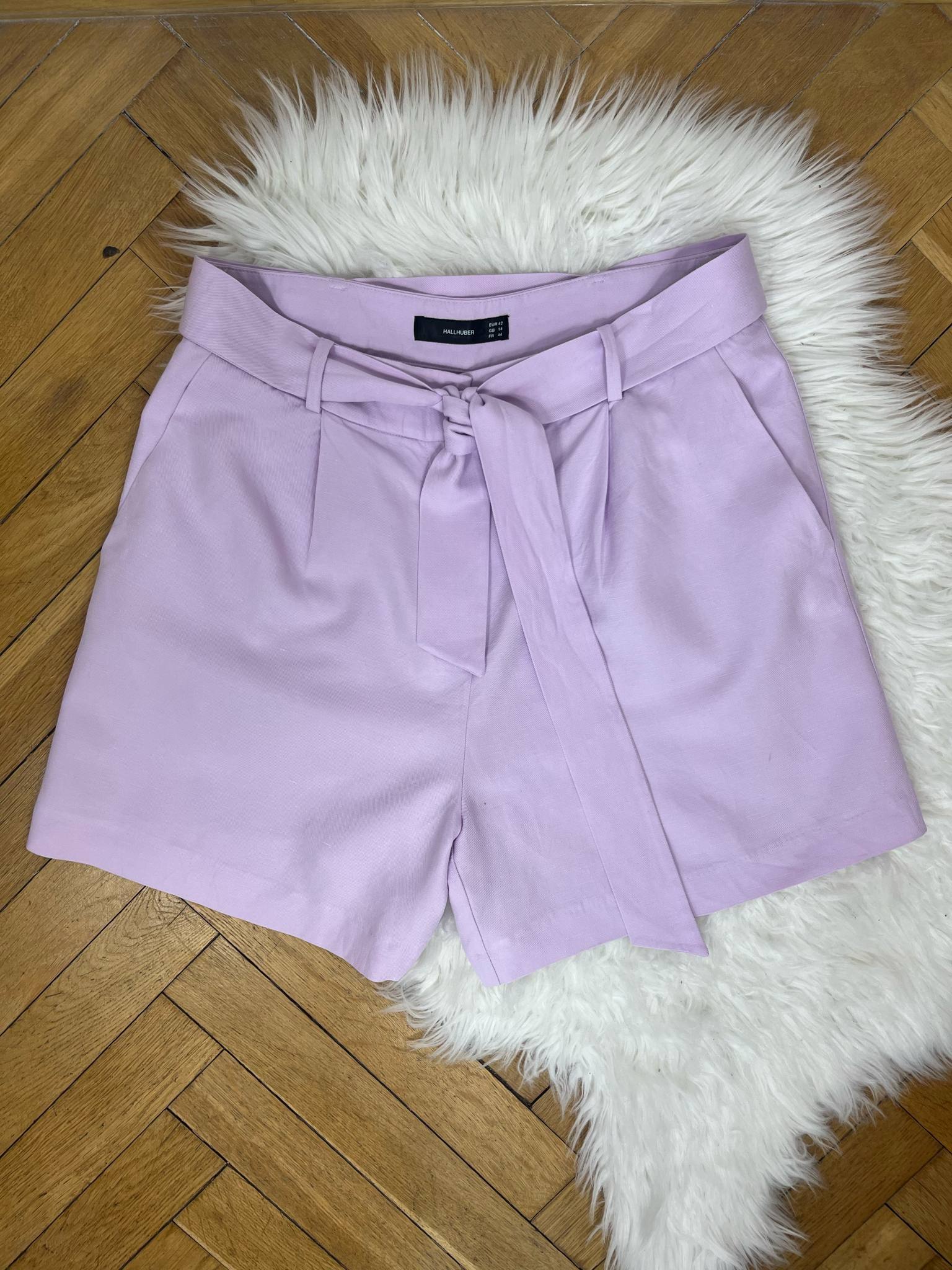 Eleganckie lniane spodenki Hallhuber rozmiar XL (42). Kolor liliowy. Luźny krój z wiązaniem w pasie. Materiał w składzie 30% len, 22% bawełna, 48% lyocell - sztuczny jedwab. Wymiary: długość 50 cm, pas 43 cm, krok przód 34 cm, szerokość nogawki 37 cm. Stan idealny.