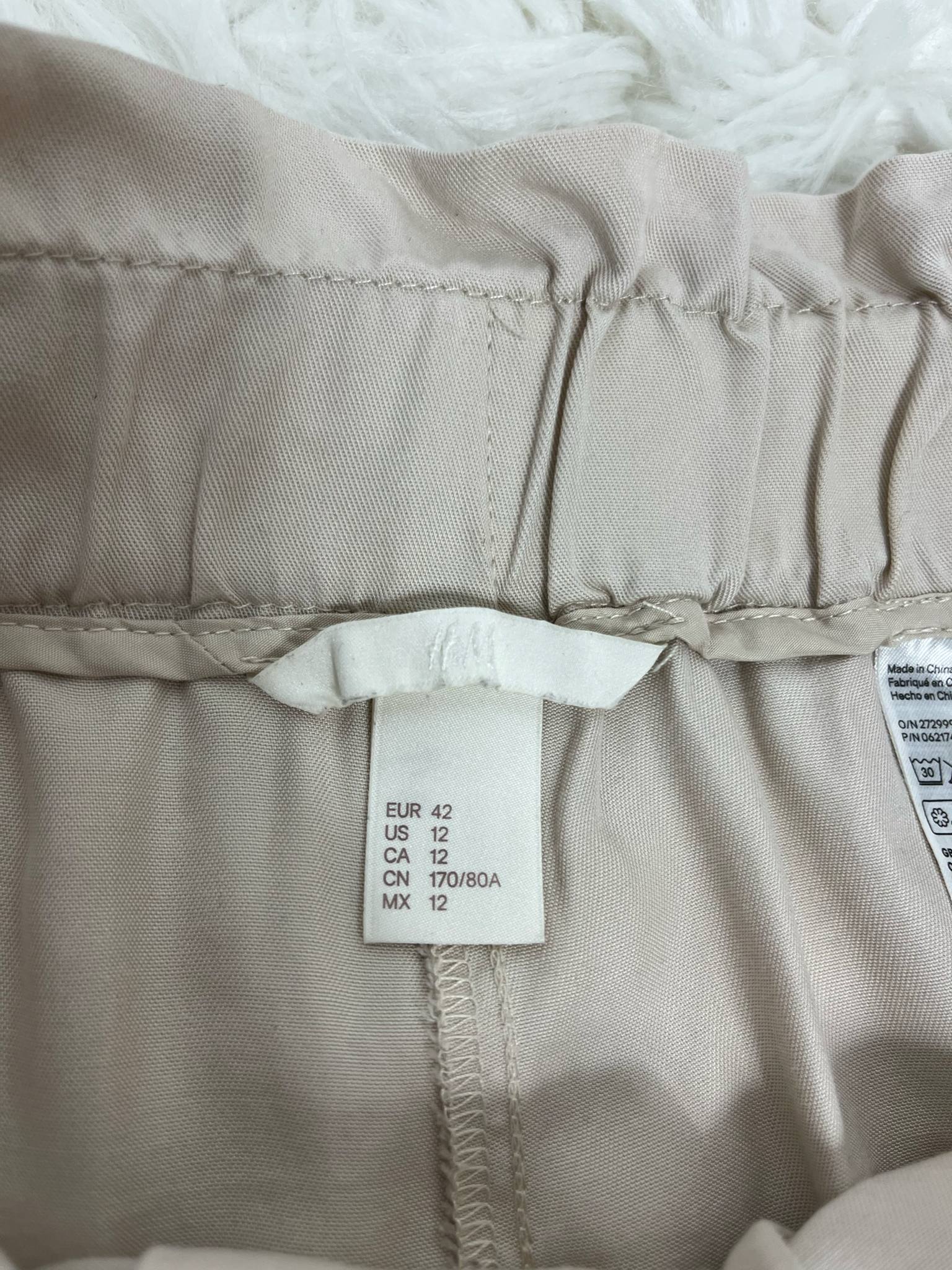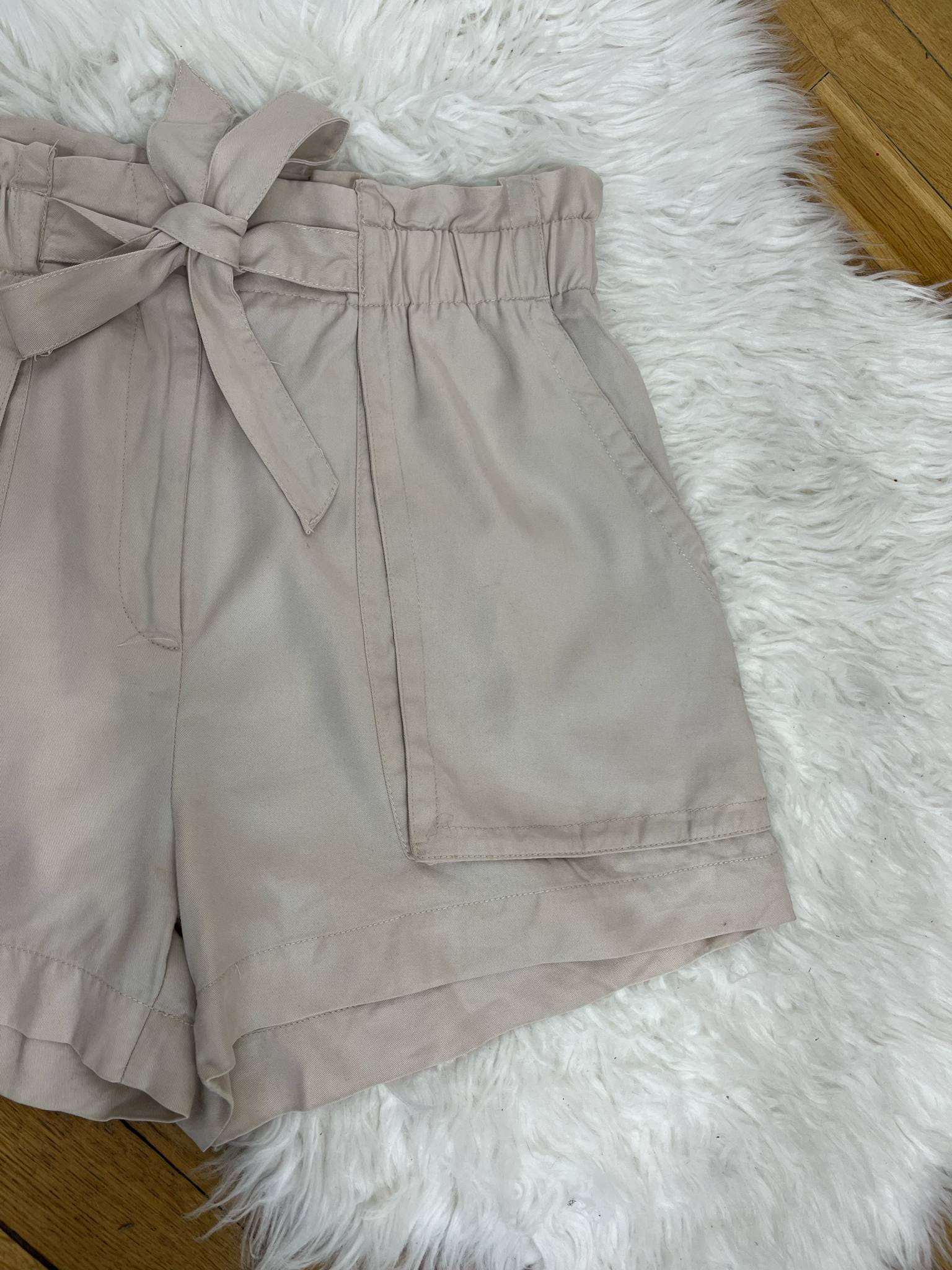 Spodenki materiałowe H&M rozmiar XL (42). Kolor kremowy/beżowy. Materiał w składzie 100% lyocell - sztuczny jedwab. Przewiewne, eleganckie z wyższym stanem. Wiązanie w pasie. Kieszenie. Wymiary: długość 47 cm, krok przód 36 cm, pas 41-48 cm, szerokość nogawki 34 cm. Stan idealny.