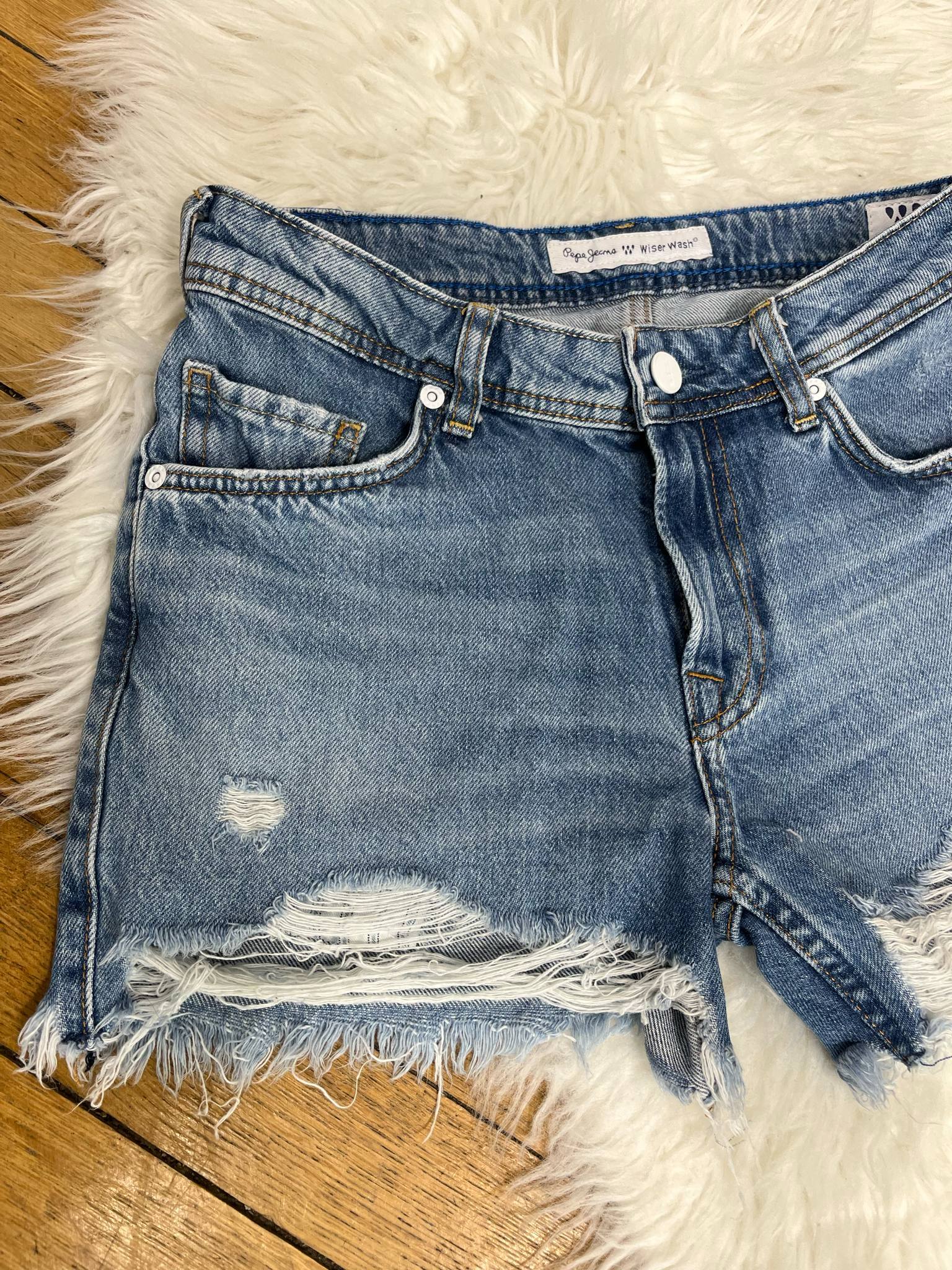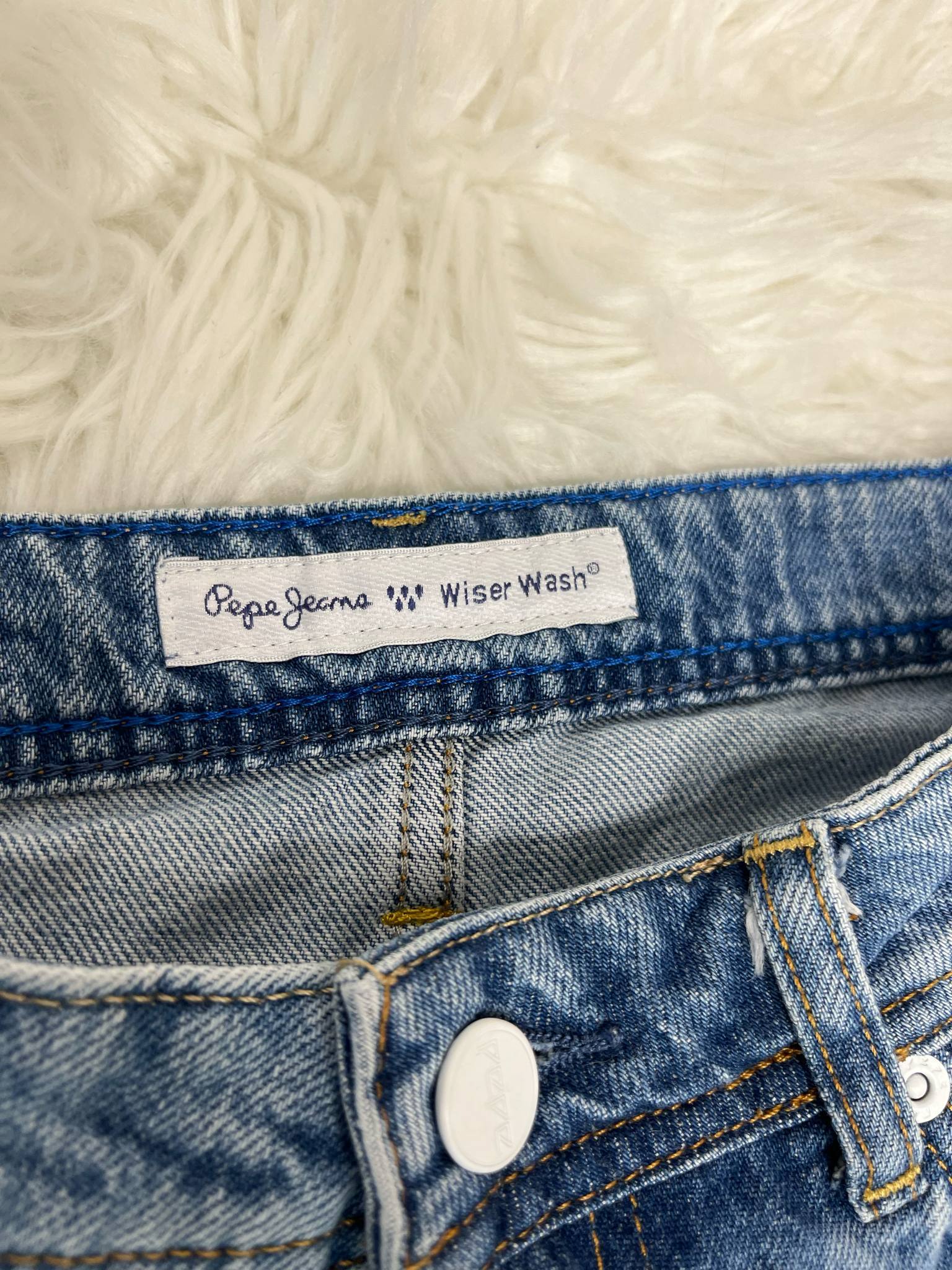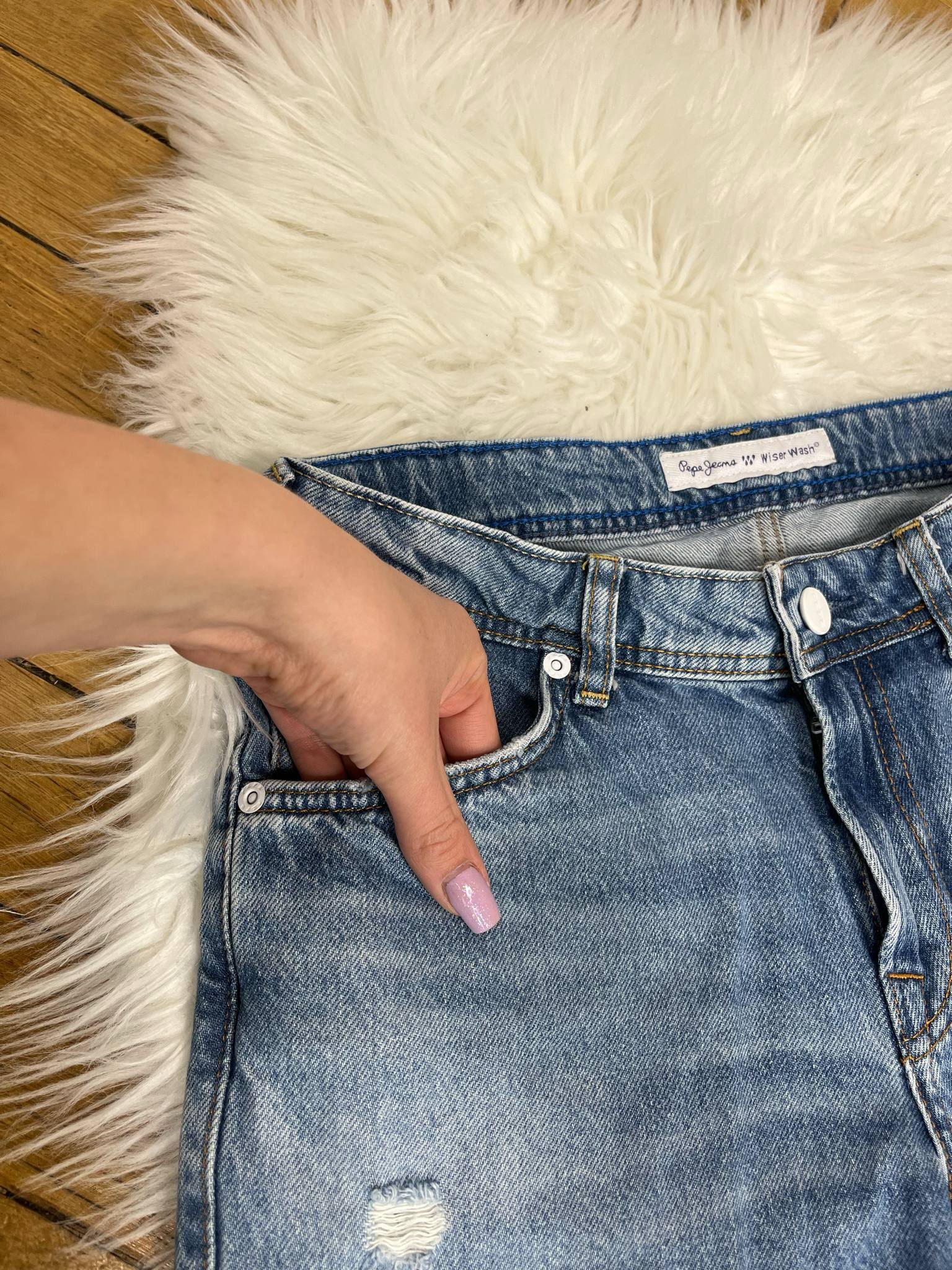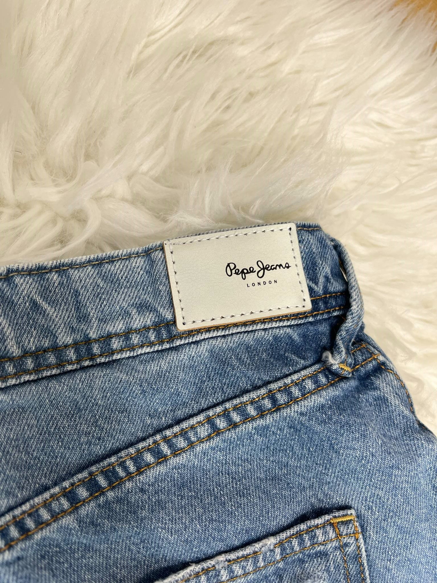 Spodenki jeansowe Pepe Jeans w rozmiarze XS (25). Przetarcia z przodu. Materiał 100% bawełna. Wymiary: długość 37 cm, pas 37 cm, szerokość nogawki 27 cm, krok przód 23 cm. Stan idealny.