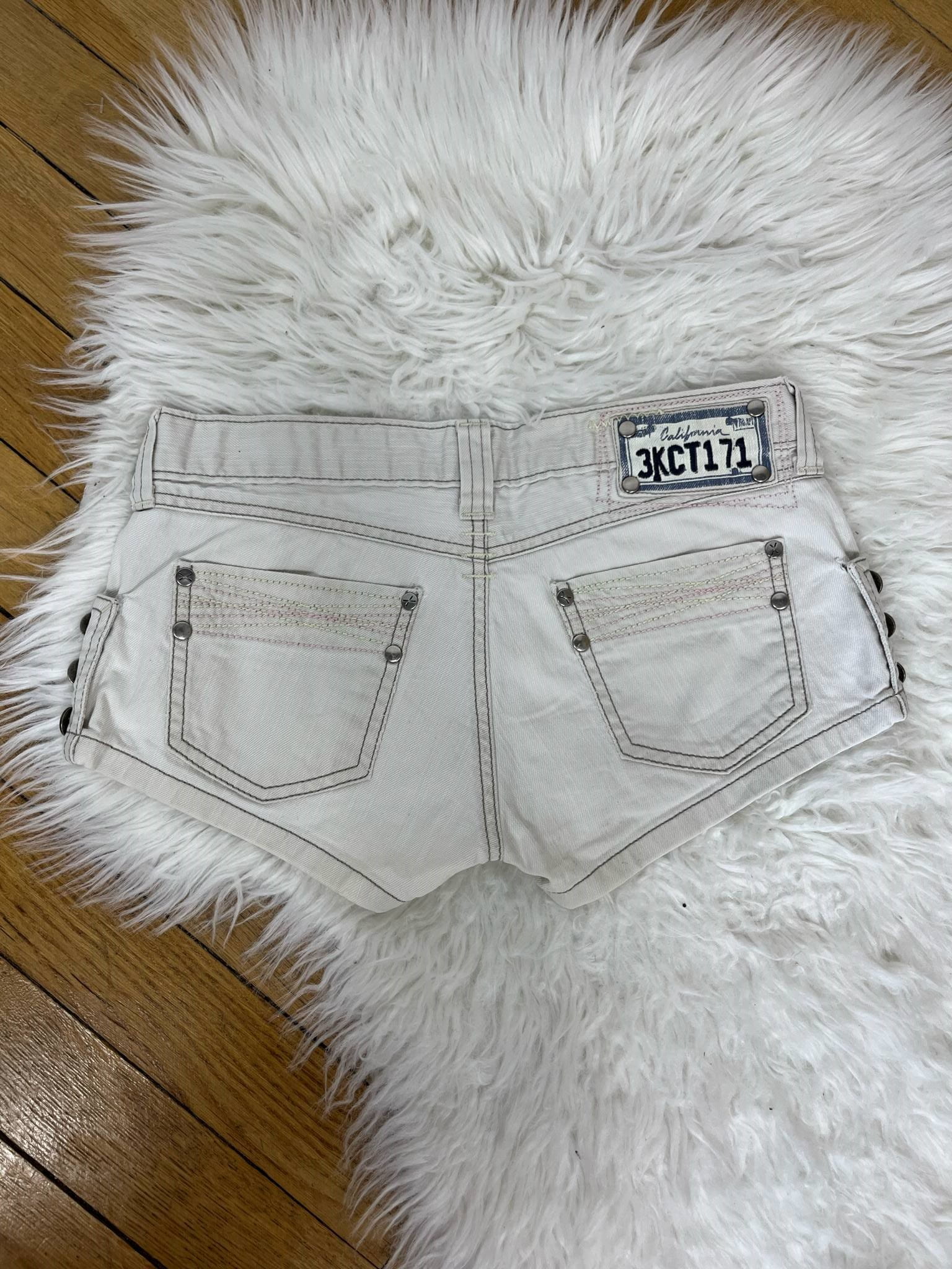 Spodenki jeansowe Xroses rozmiar XXS (24). Kolor kremowy. nitki w pastelowych kolorach butter yellow oraz pastel pink. Spodenki w klimacie y2k. Wymiary: długość 26,5 cm, pas 36 cm, szerokość nogawki 23cm, krok przód 15 cm. Stan idealny.