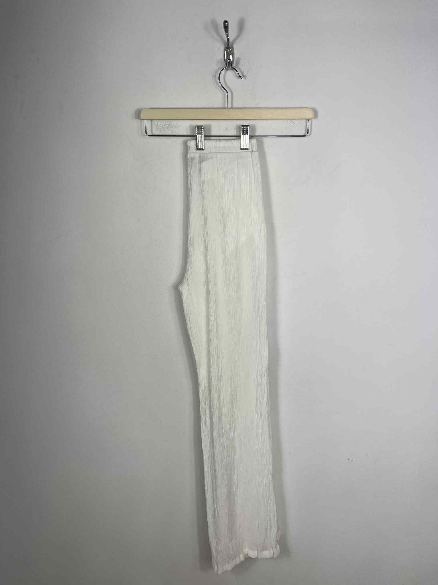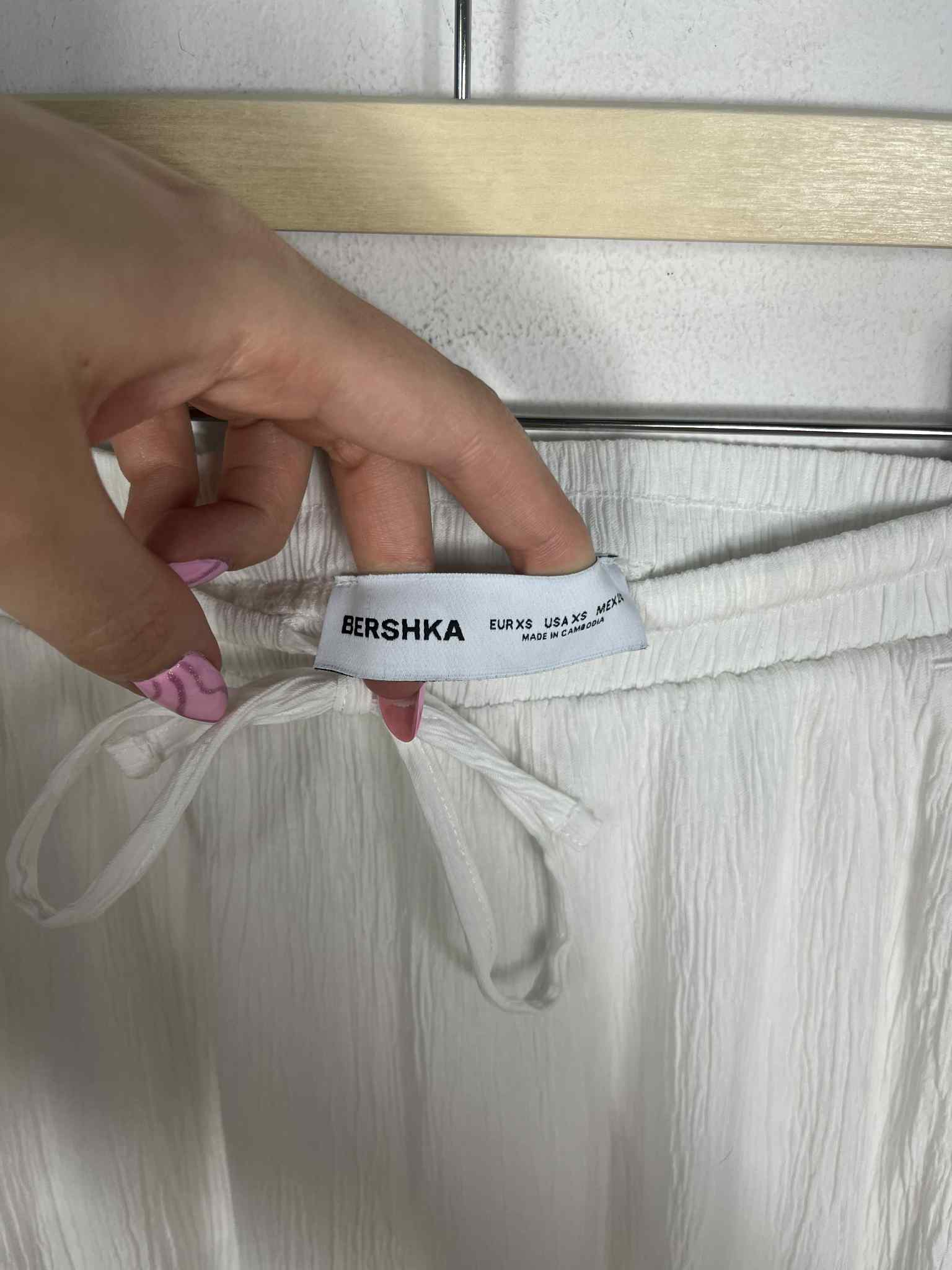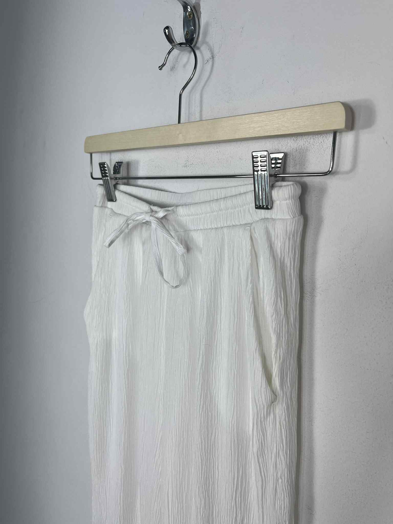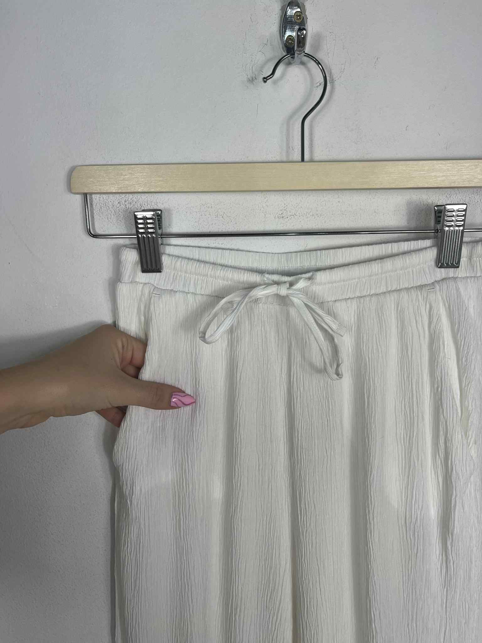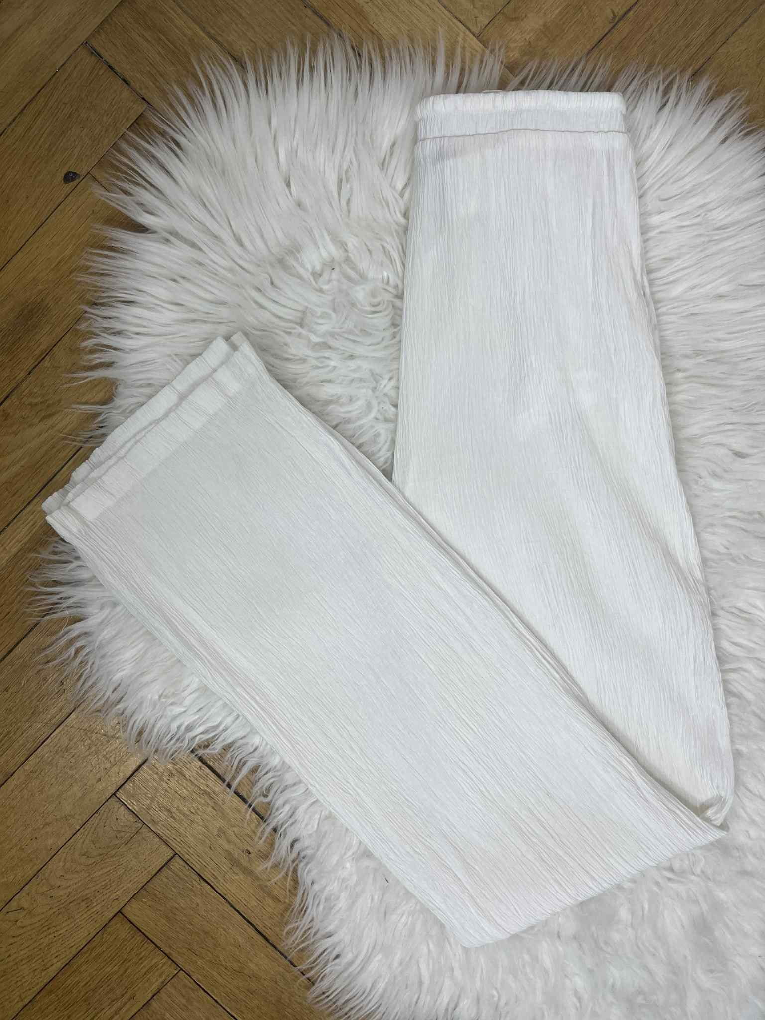 Letnie spodnie Bershka rozmiar XS. Kolor śmietanowa biel. Materiał o pogniecionej strukturze - prześwitujący. W pasie gumka i sznurek ściągający. Brak metki ze składem. Wymiary: długość 104 cm, pas 31-40 cm, krok przód 28 cm, długość nogawka wewnątrz od kroku w dół 77 cm. Stan bardzo dobry.