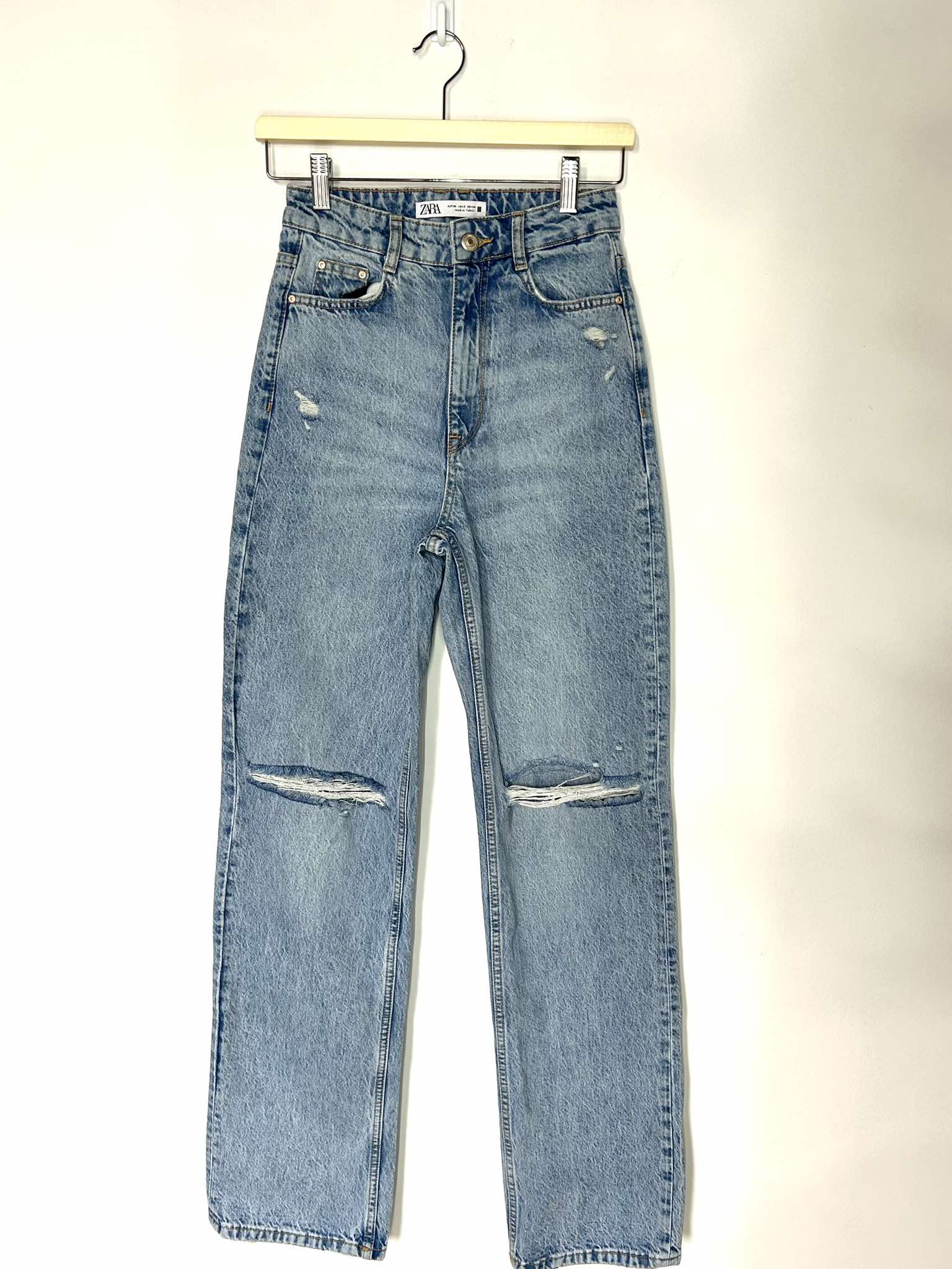 Szerokie spodnie Zara w rozmiarze XS (34). Kolor jasny jeans. Wysoki stan. Dziury na kolanach. Wymiary długość 114 cm, pas 33 cm, krok 30 cm, szerokość nogawki 27 cm. Stan idealny.