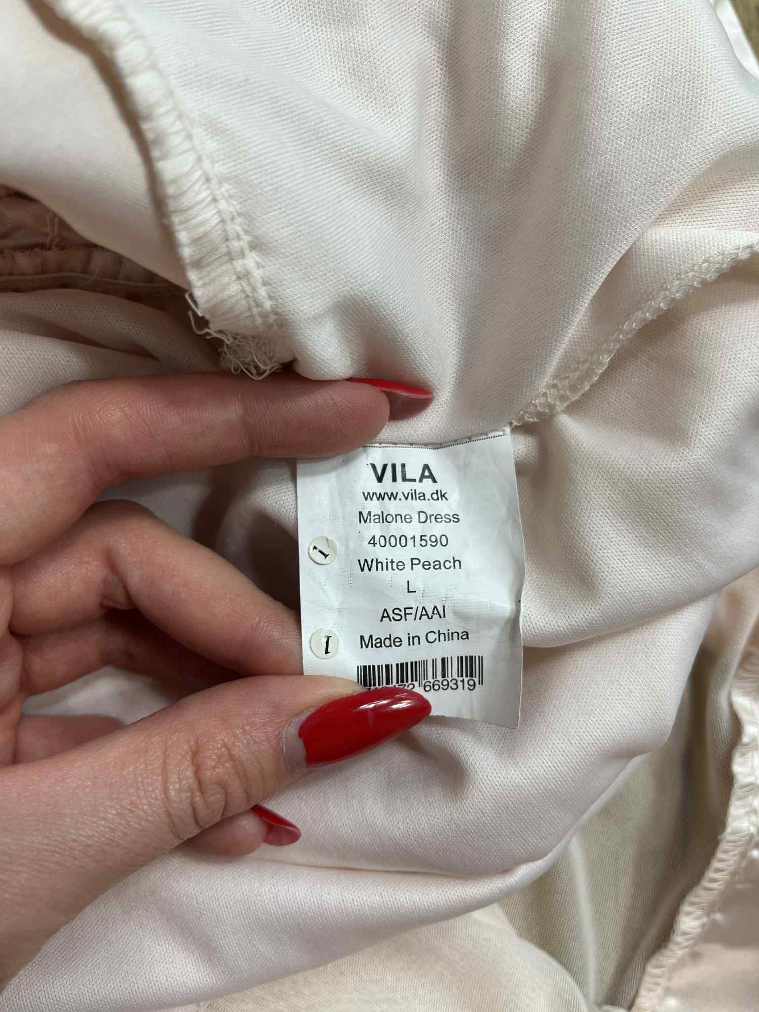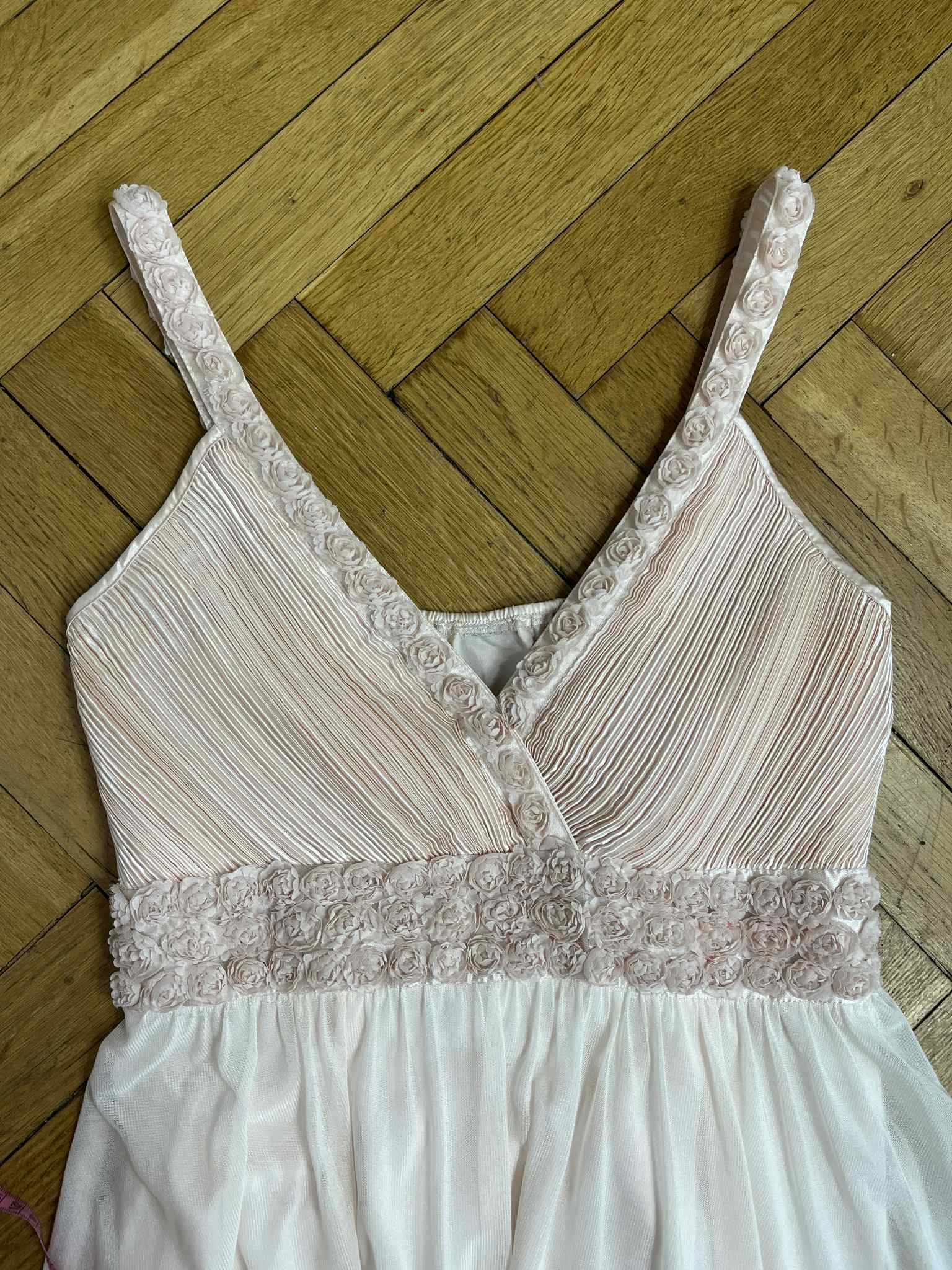 Sukienka z różyczkami VILA rozmiar L. Kolor bardzo jasnego pudrowy róż. Na biuście marszczenie i ozdobne mini różyczki. Na plecach gumki. Wymiary: długość 105 cm, biust 39-49 cm, pas 37-40 cm. Stan idealny.