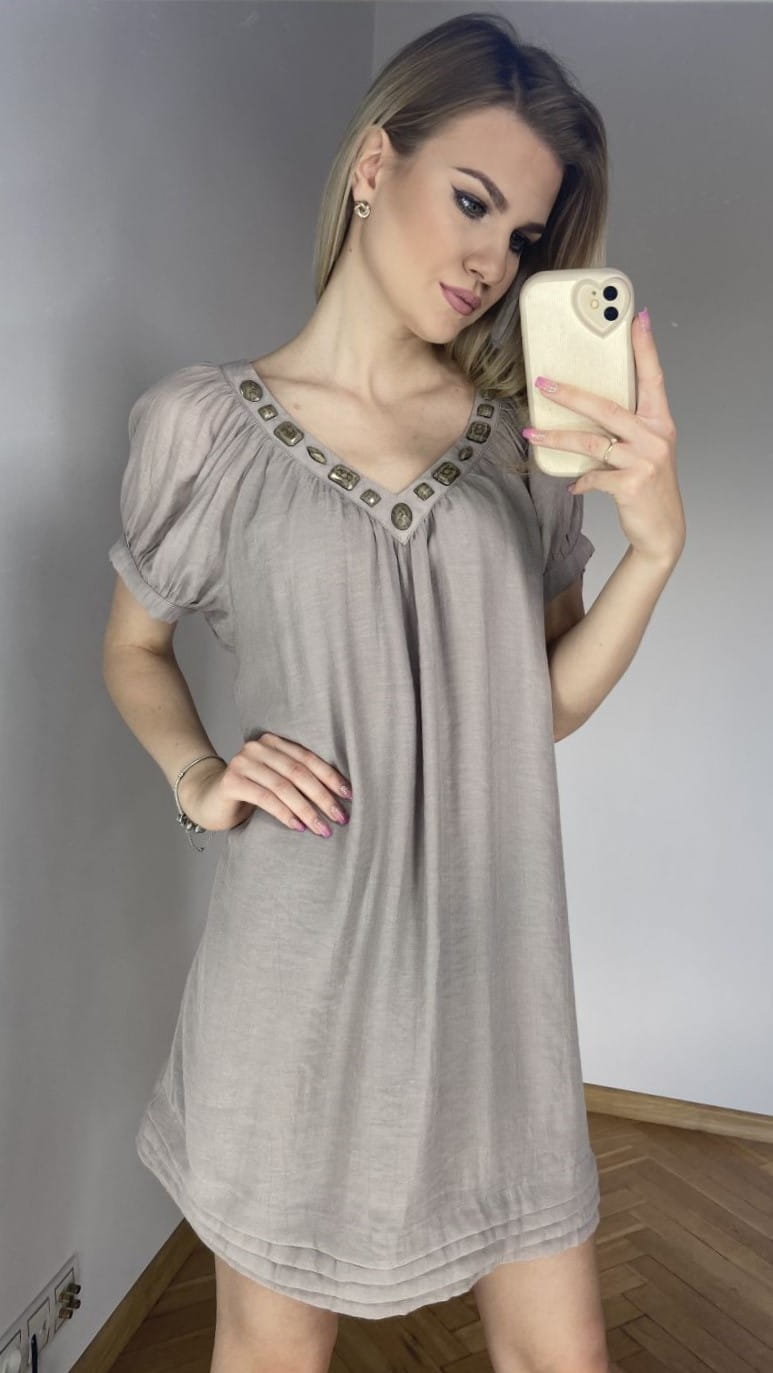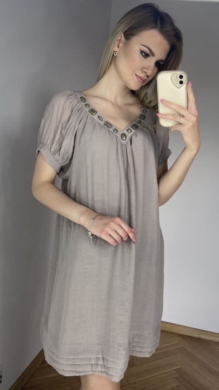 MARKA: Vila ROZMIAR: L KOLOR DOMINUJĄCY: brudny beżowy WZÓR: brak DEKOLT: litera V RĘKAW: krótki SKŁAD MATERIAŁÓW: 65% poliester, 35% wiskoza CECHY DODATKOWE: dekolt z kamieniami, zwiewna WYMIARY: długość całkowita: 84 cm szerokość pachy: 55 cm STAN: idealny WADY: brak