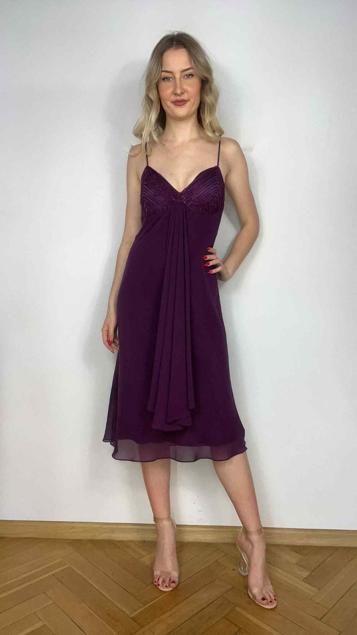 Sukienka fioletowa Maria Bonita rozmiar L. Długość midi. Ozdobnie wyszywany dekolt. W biuście wszyte miski usztywniające. Podszewka. Wymiary: długość 117 cm, pachy 42-45 cm. Stan bardzo dobry.