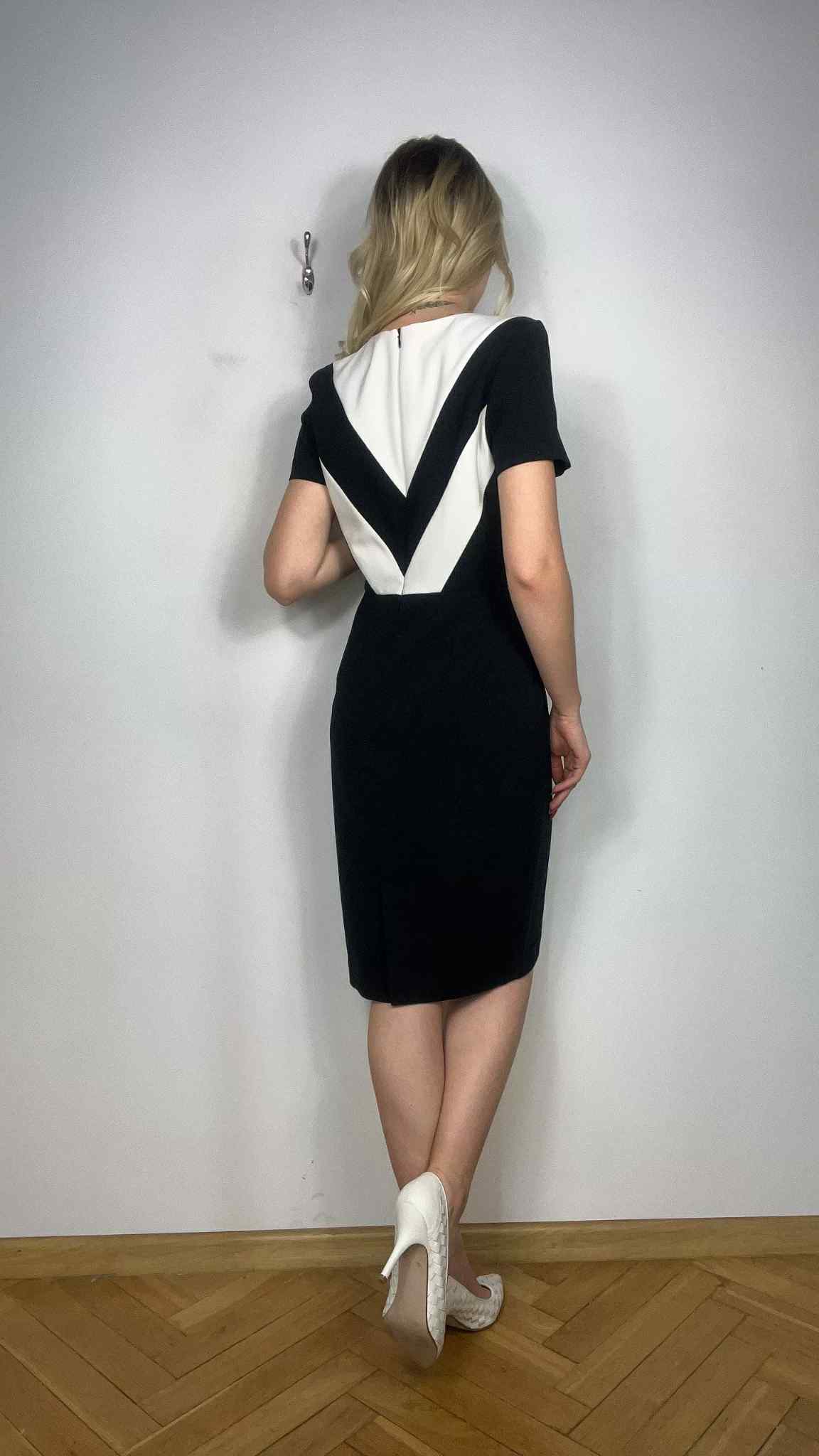 Sukienka M&S Collection w rozmiarze M. Kolor czarno-biały. Klasyczny krój. W górnej części efektowy modelujący sylwetkę zygazk. Zapinana na kryty suwak - plecy. Podszewka. Wymiary: długość 101 cm, pachy 46 cm, pas 37-38 cm, biodra 47 cm. Stan idealny.