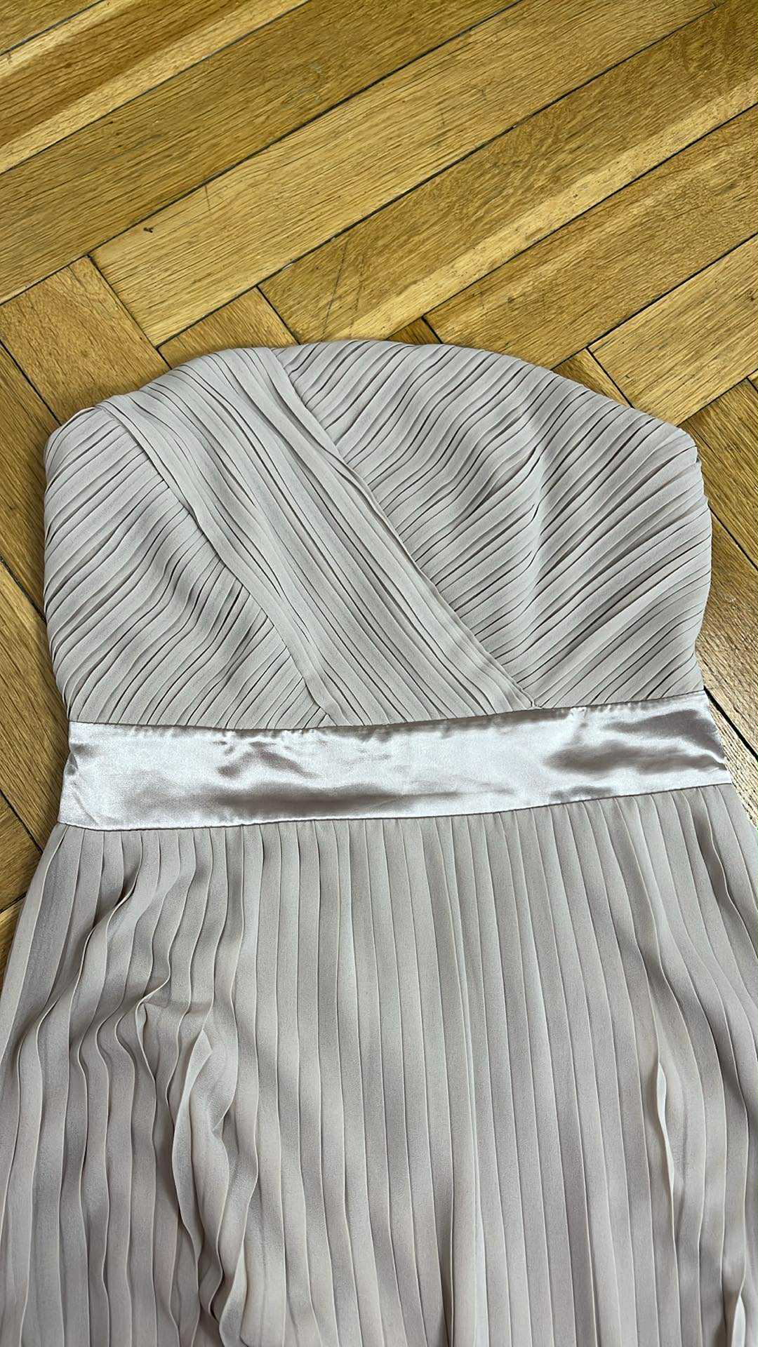 Sukienka maxi plisowana TFNC LONDON rozmiar M. Bez ramion z silikonowym paskiem zapobiegającym osuwaniu sukienki. W pasie pasek odcinający. Dół pionowe plisowanie. Zapinana na suwak plecy. Podszewka. Wymiary: długość 146 cm, pachy 37-41 cm, pas 34-36 cm. Stan idealny.