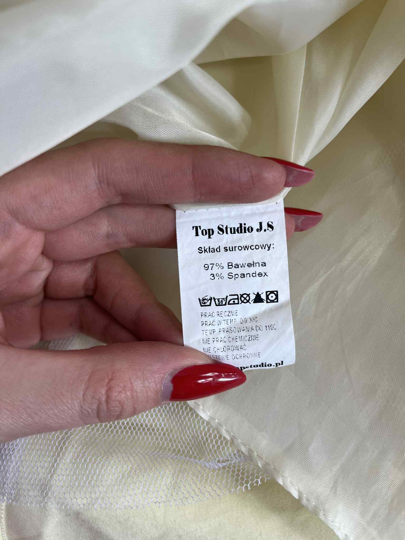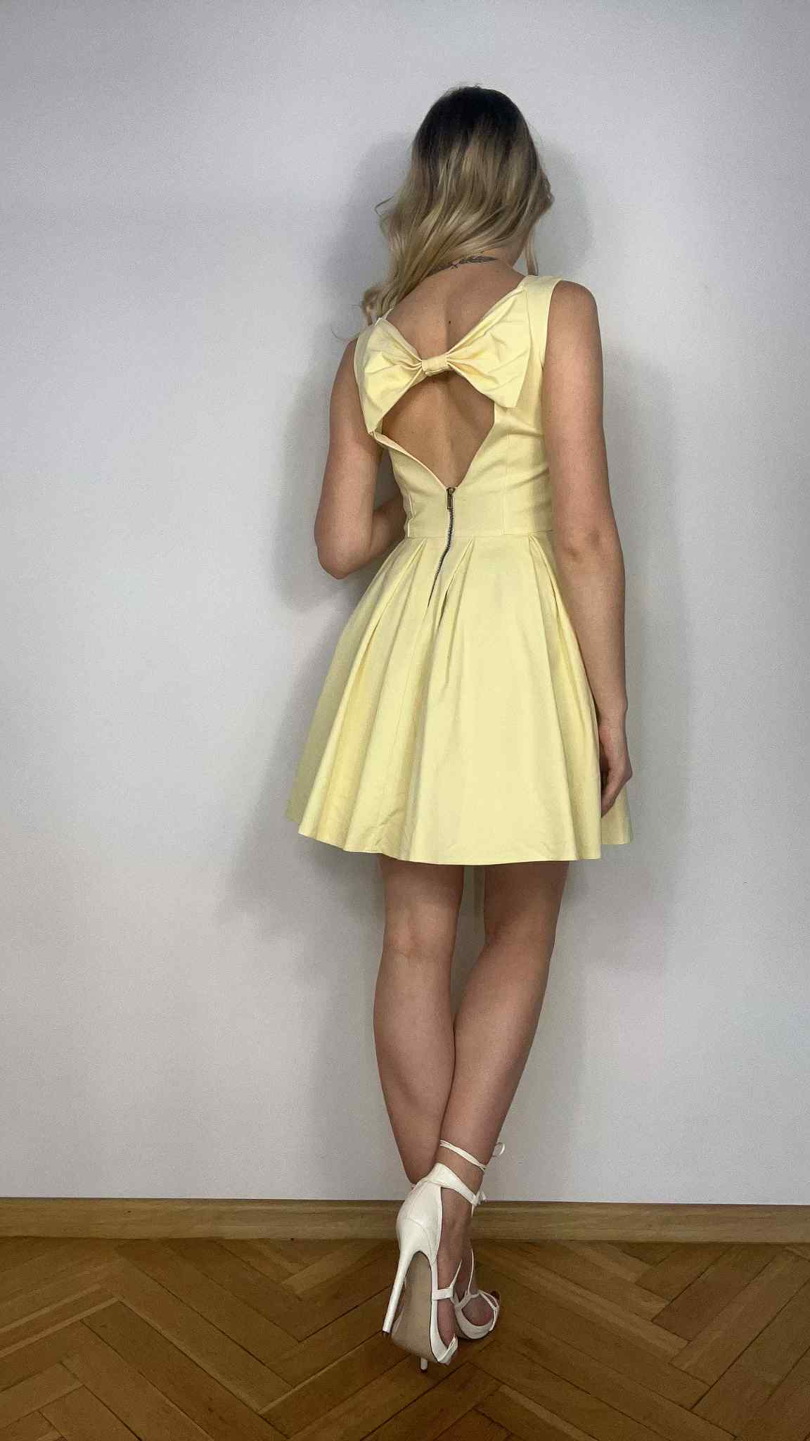 Sukienka rozkloszowana z kokarda rozmiar S. Kolor butter yellow. Polski producent Top Studio. Na plecach ozdobna kokarda. Zapinana suwak - plecy. Podszewka. Wymiary: długość 86 cm, pachy 43 cm, pas 34 cm. Stan bardzo dobry.