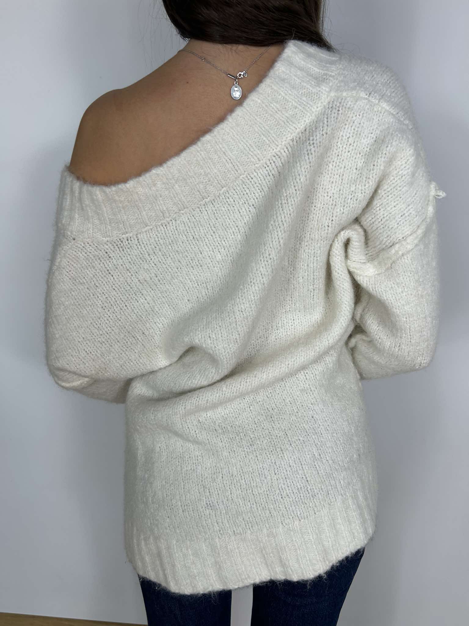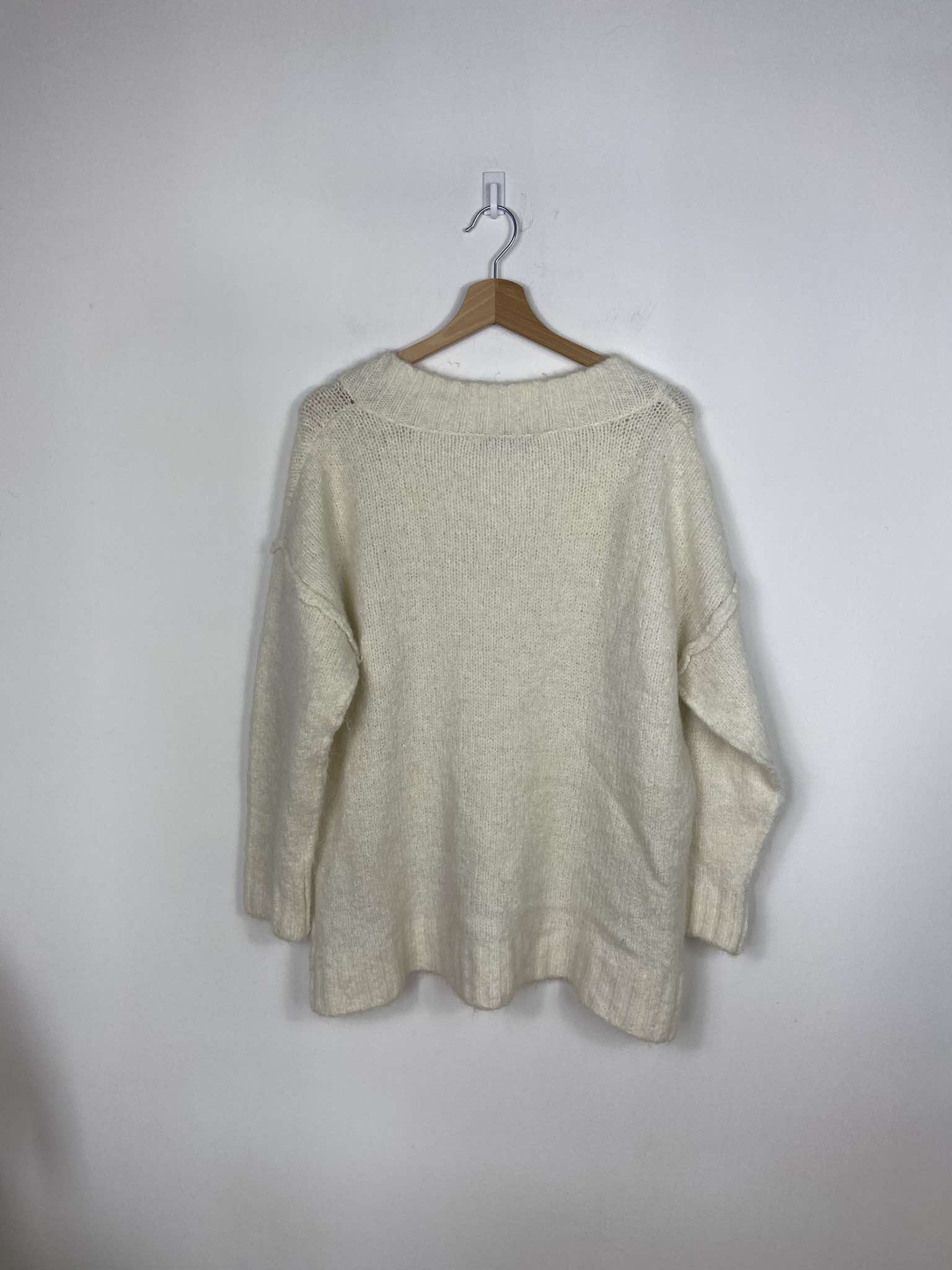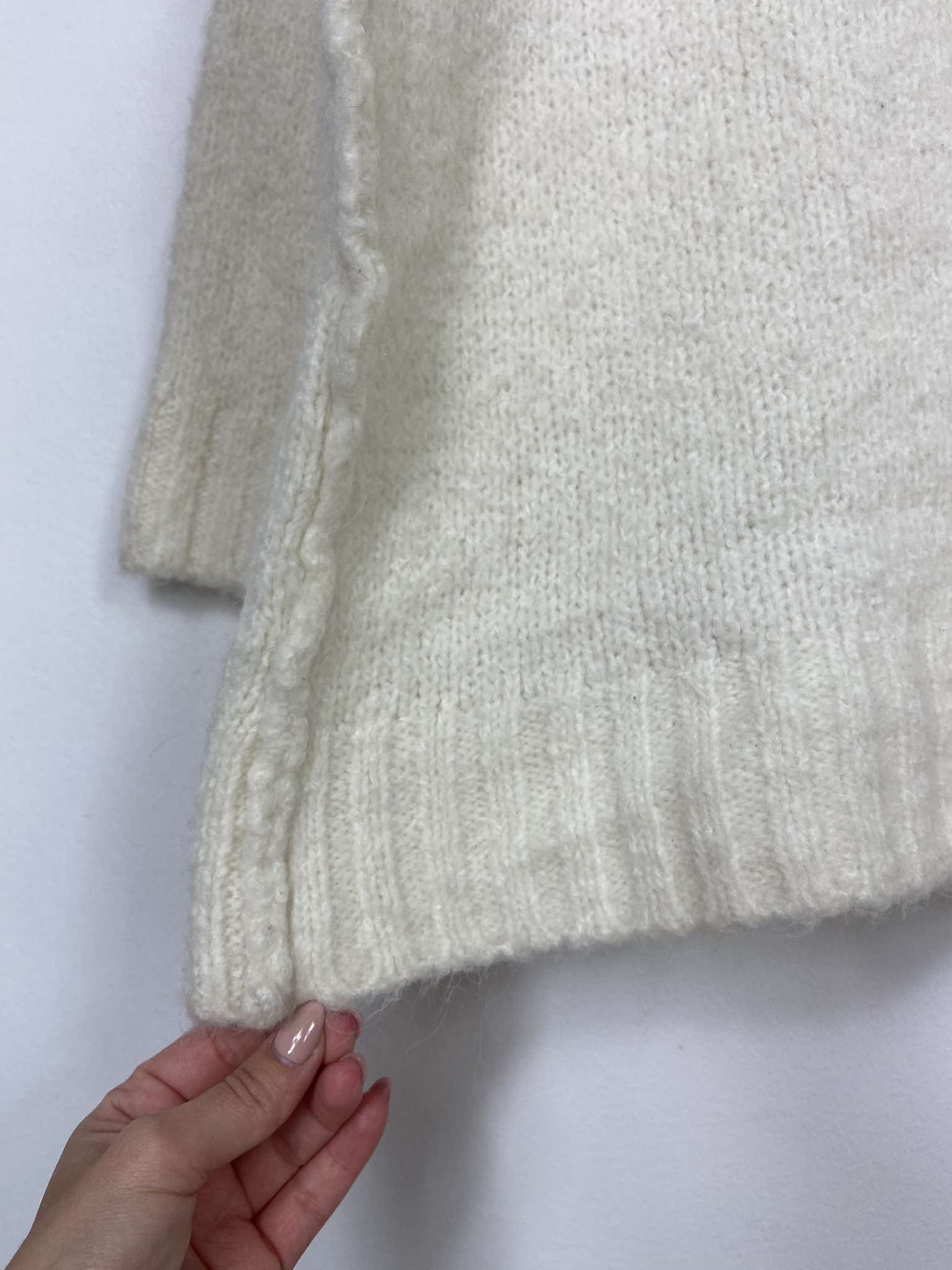 Sweter Zara wełna, alpaka rozmiar S. Prosty, szeroki krój. Kolor śmietanowy. Materiał w składzie 26% wełna, 8% alpaka, 44% akryl, 21% nylon, 1% elastan. Wymiary długość 71 cm, pachy65 cm. Stan idealny.