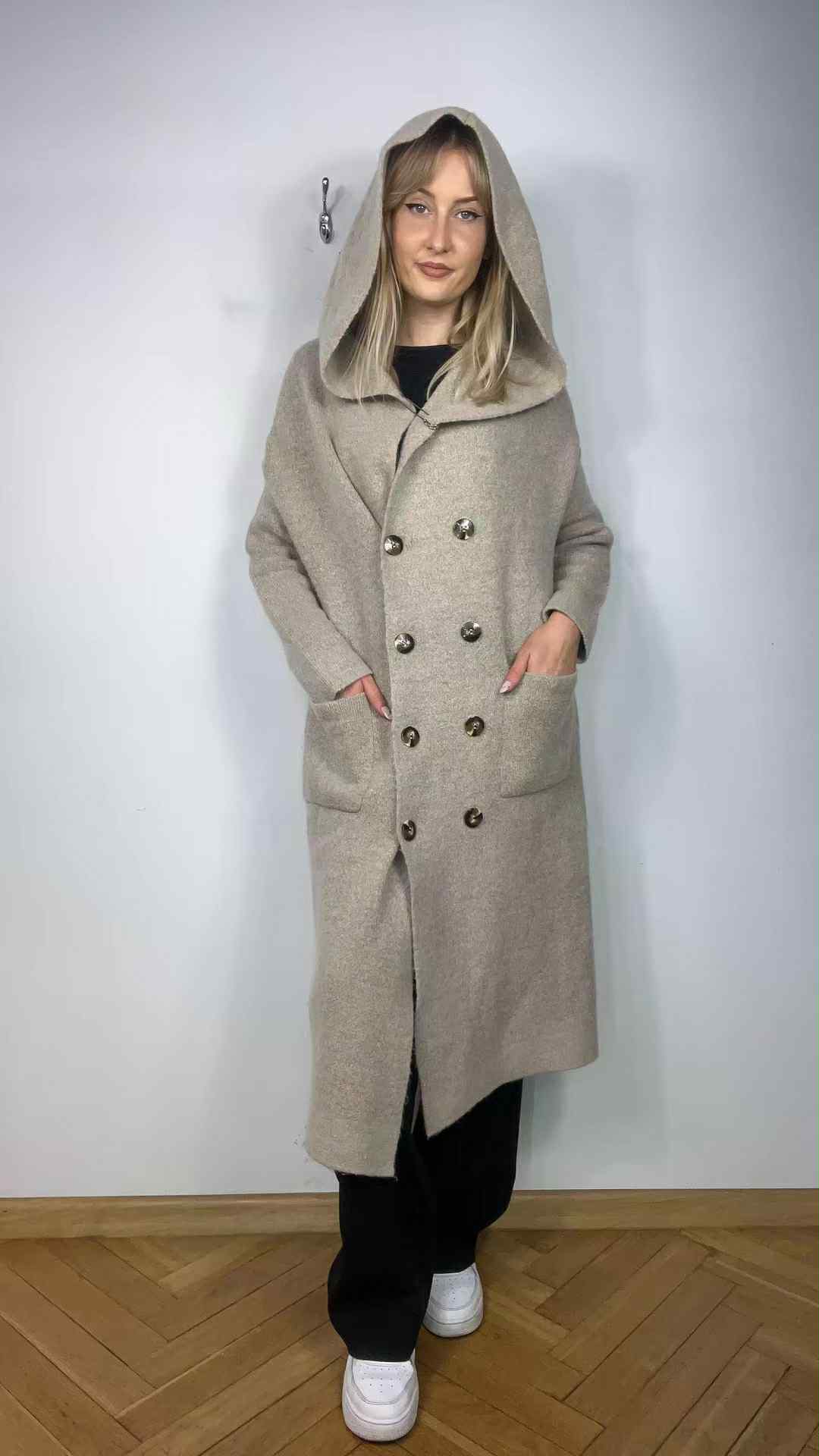 Sweter/płaszczyk Zara dzianina, wełna rozmiar S. Dwurzędowy z kapturem. Ozdobna agrafka. Prosty fason. Idealny na jesień i wiosnę. Materiał w składzie 7% wełna, 3% elastan, 30% nylon, 60% akryl. Wymiary długość 110 cm, pachy 63-73 cm. Stan idealny.