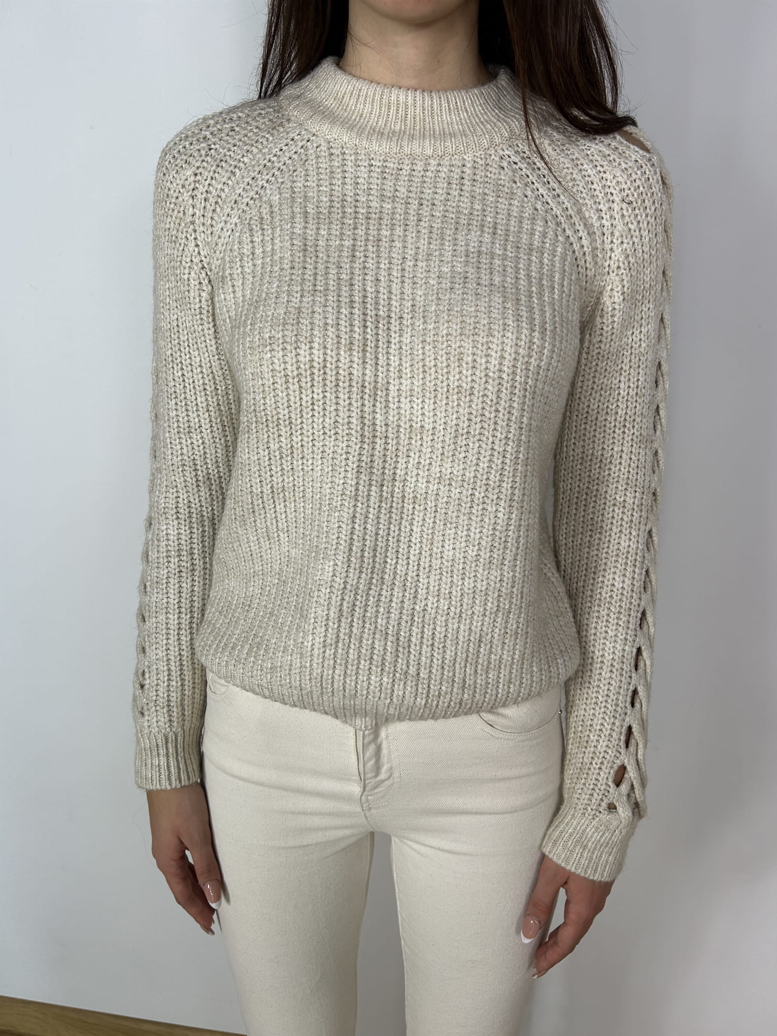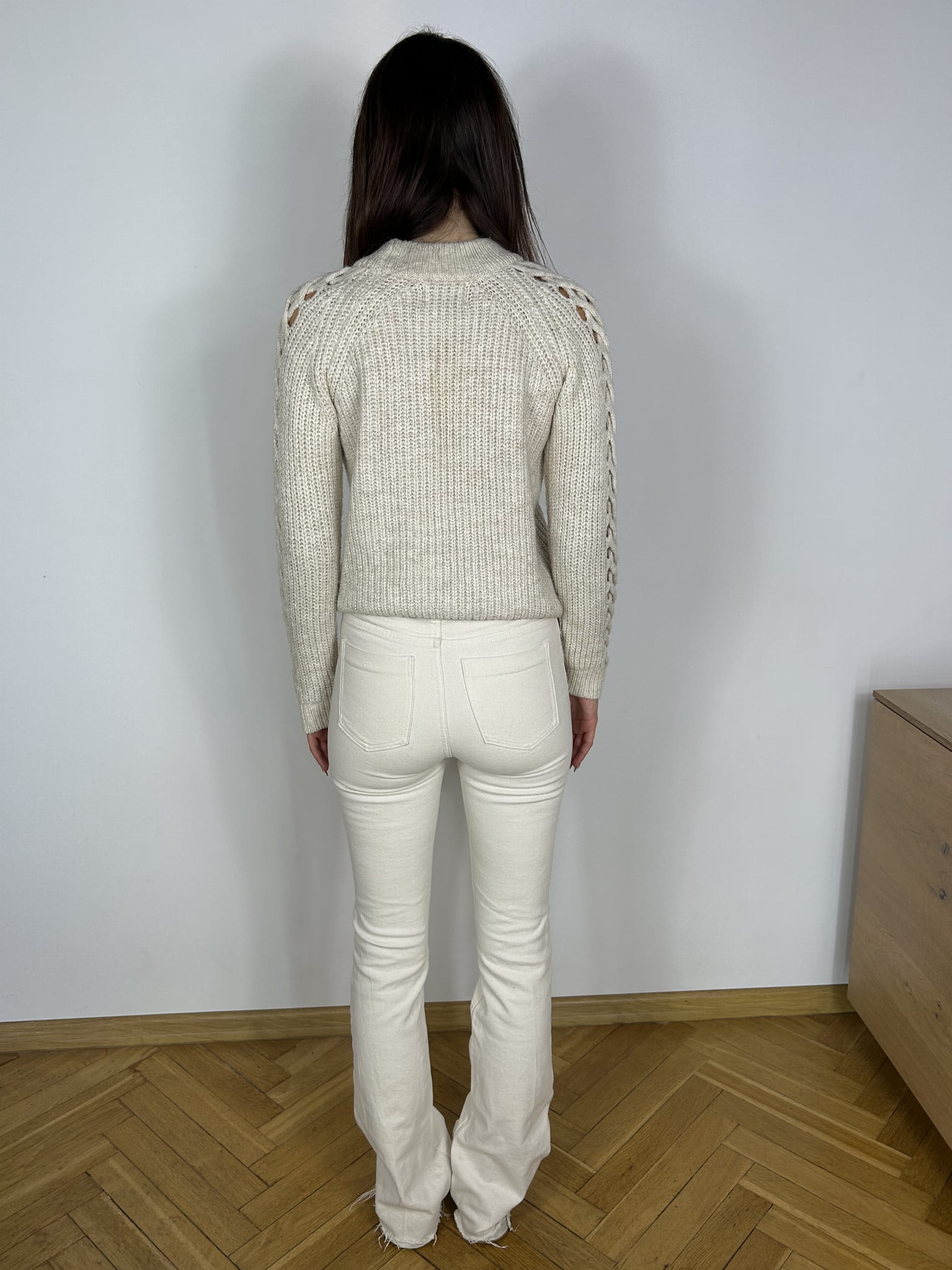 Sweter kremowy Papaya rozmiar S. Na rękawach efektowny ażur. Materiał w składzie 72% akryl, 9% poliester, 12% poliamid. Wymiary długość 57 cm, biust 49 cm. Stan idealny.