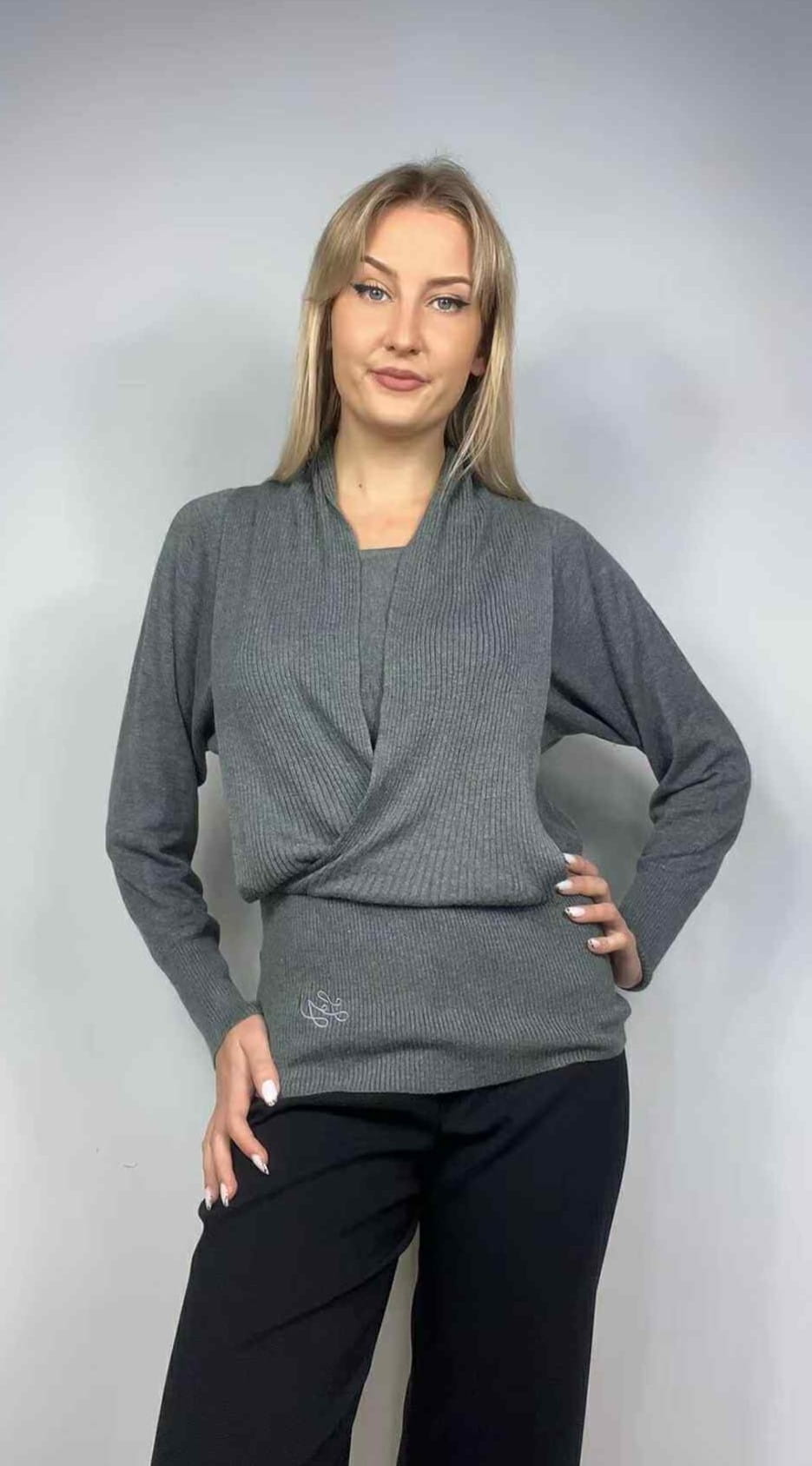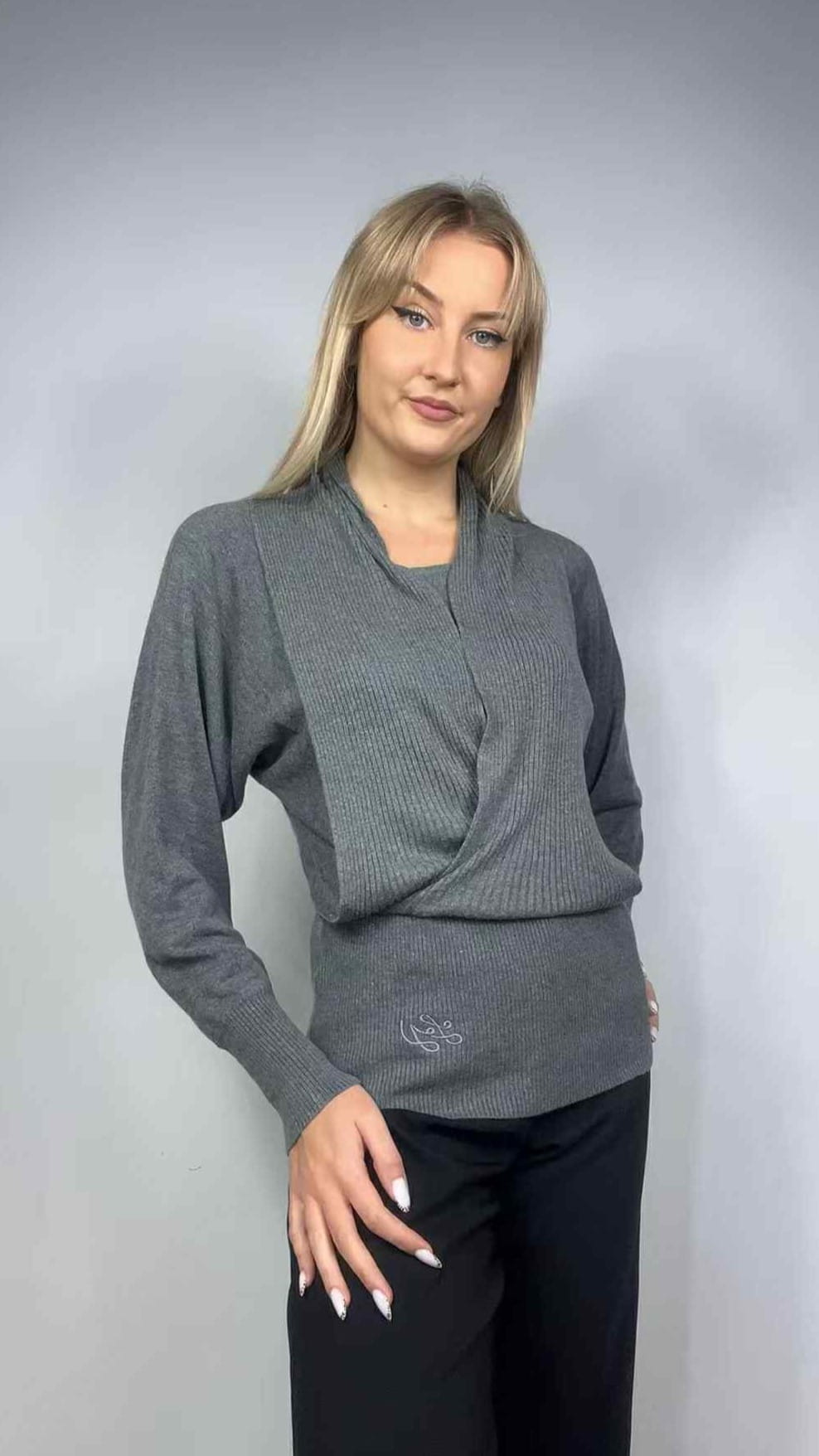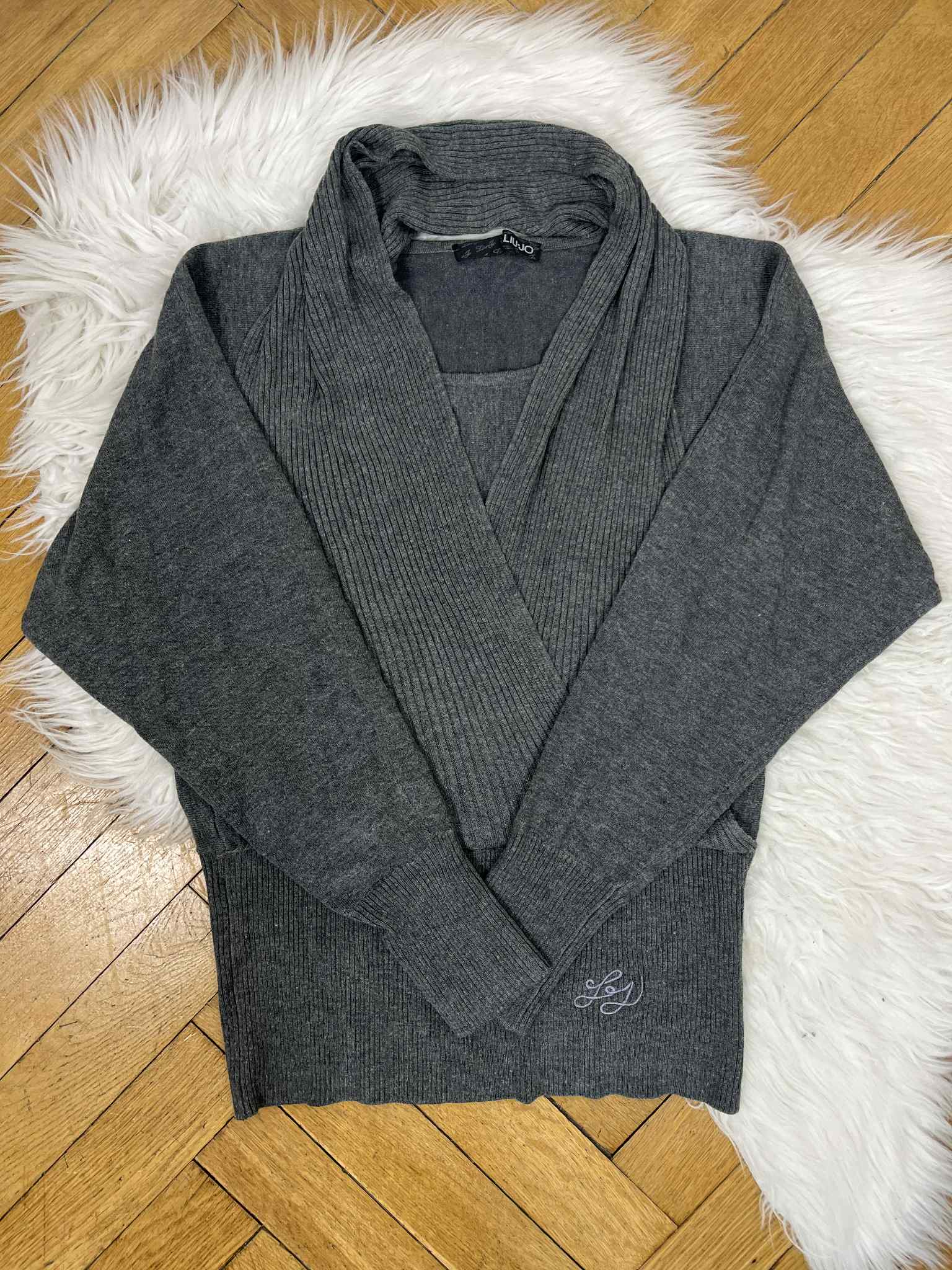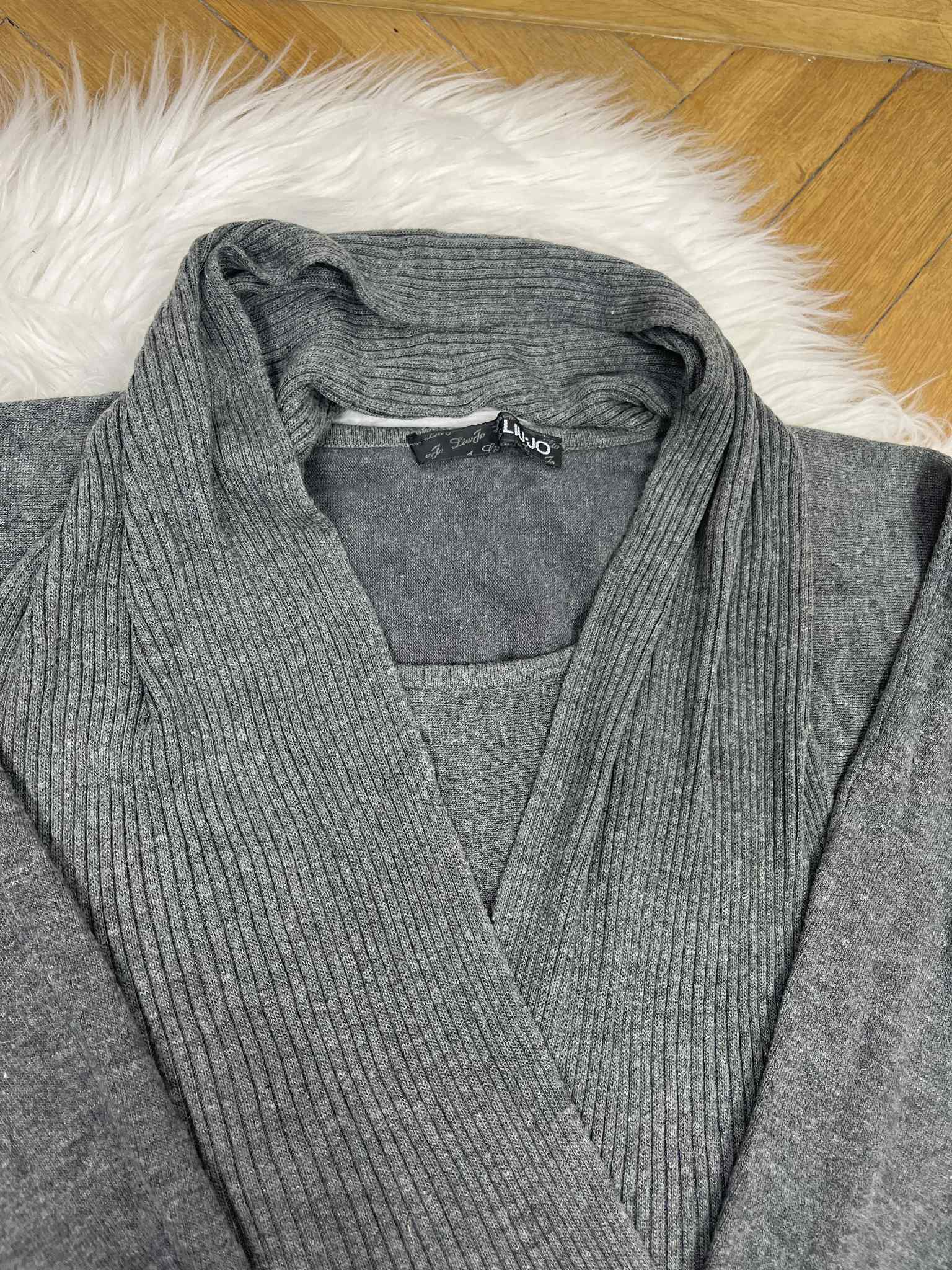 Sweter Liu Jo rozmiar M. Kolor szary. Szerokie rękawy, wąski w pasie. Ozdobna szarfa. Elastyczny. Materiał w składzie 50% wełna, 25% bawełna, 15% akryl, 10% elastan. Wymiary: długość 62 cm, pachy 50-60 cm, pas 35-47 cm. Cena producenta 519,00 zł. Stan bardzo dobry.