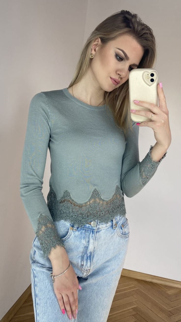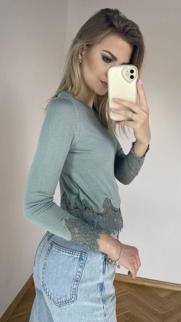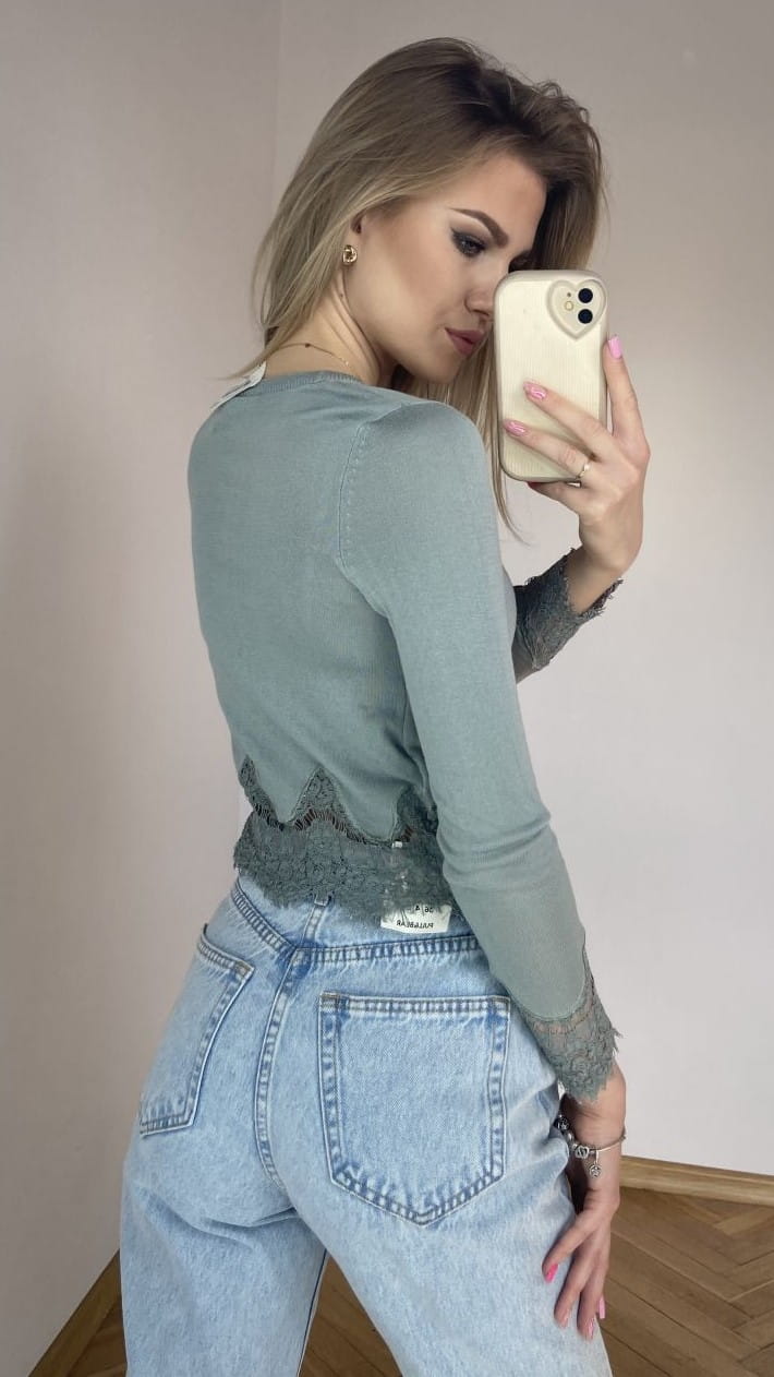 Marka: H&M Rozmiar: XS Kolor dominujący: miętowy Wzór: bez wzoru Fason: dopasowany Rękaw: długi Skład materiałowy: 50% wiskoza, 50% akryl Cechy dodatkowe: krótki, cienki jak bluzka, wykończenie koronką Wymiary długość całkowita: 48 cm długość rękaw: 49 cm szerokość pachy: 40 cm Stan: idealny Wady: brak