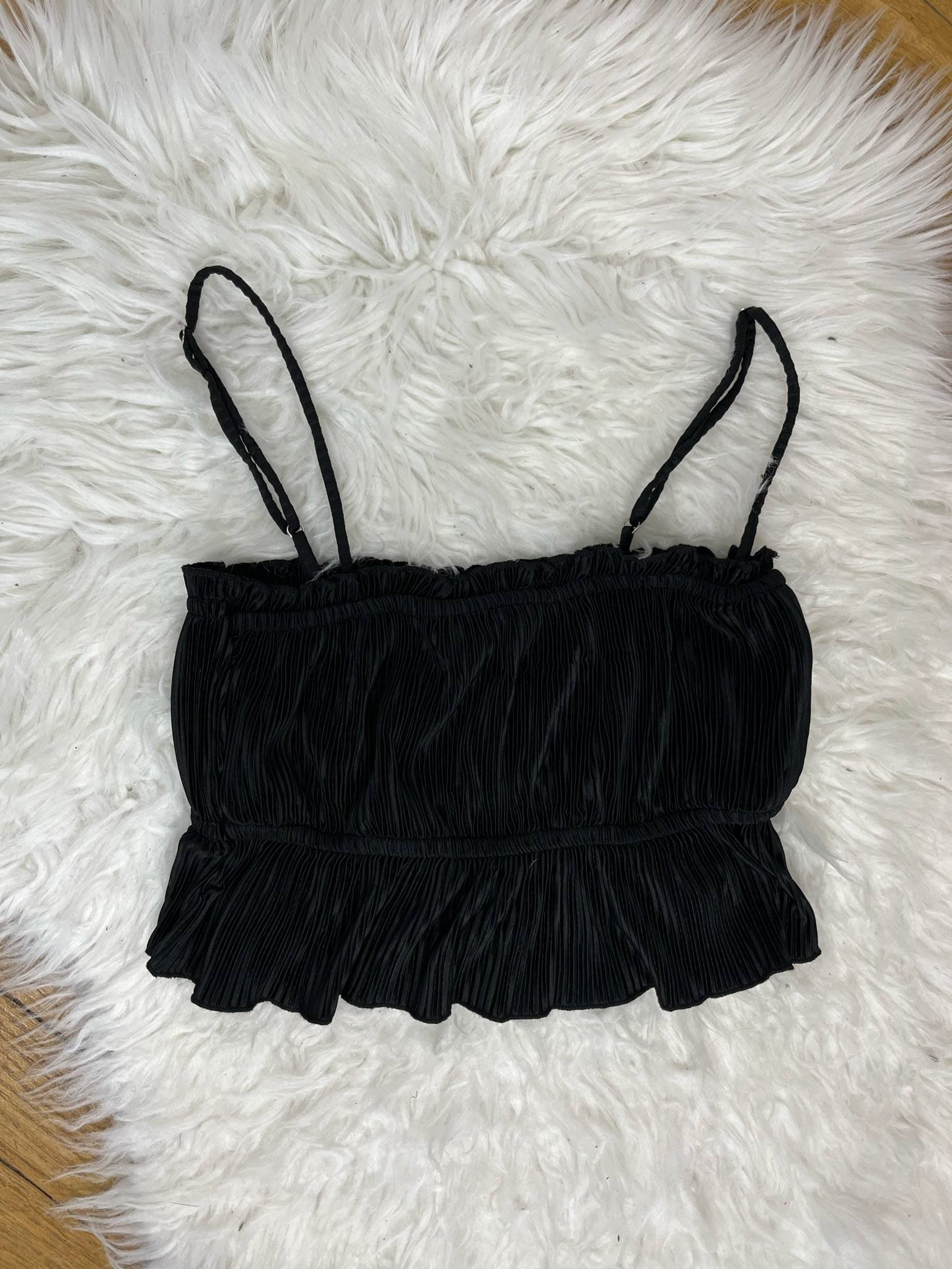 Top marki Bershka w rozmiarze XS. Kolor czarny. Elastyczny, prążkowany materiał. Na regulowanych ramiączkach. Gumki w biuście . Ozdobna falbanka. Wymiary wysokość 23 cm (bez ramiączek), szerokość 32-45 cm. Stan nowy bez metki.