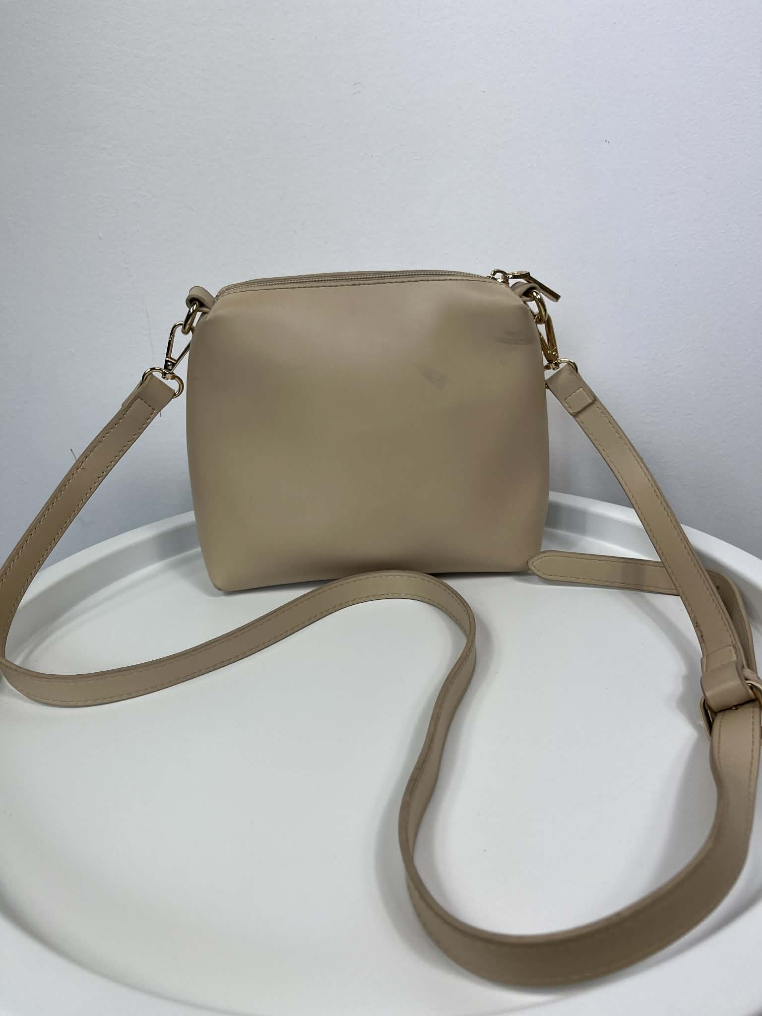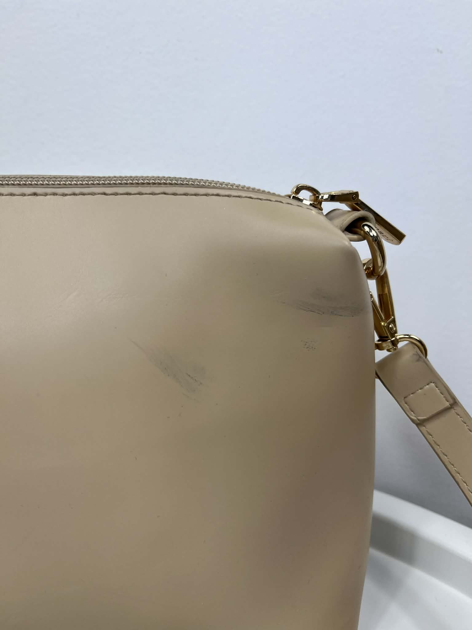 Torebka Monnari na długim pasku. Kolor jasny beżowy. Skóra ekologiczna. Jednokomorowa. Zapinana na suwak. Regulowany pasek. Wymiary wysokość 19 cm, szerokość 18/24 cm, dno 9 cm. Stan bardzo dobry + (małe przebarwienie, górny róg - tył torebki).